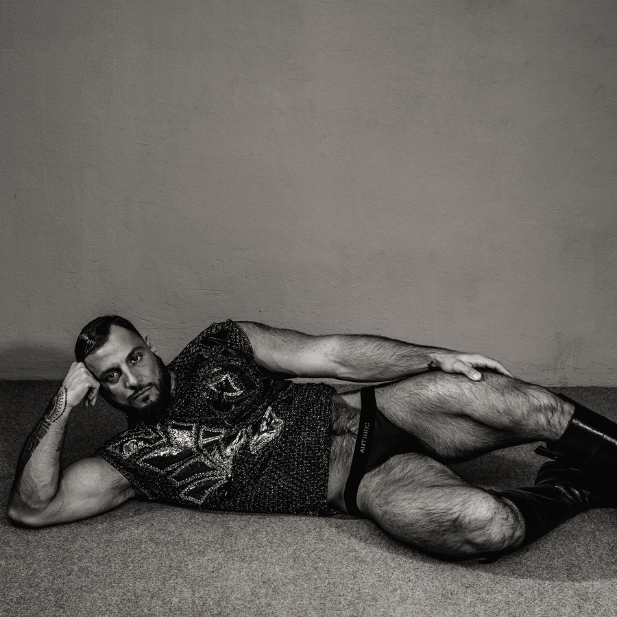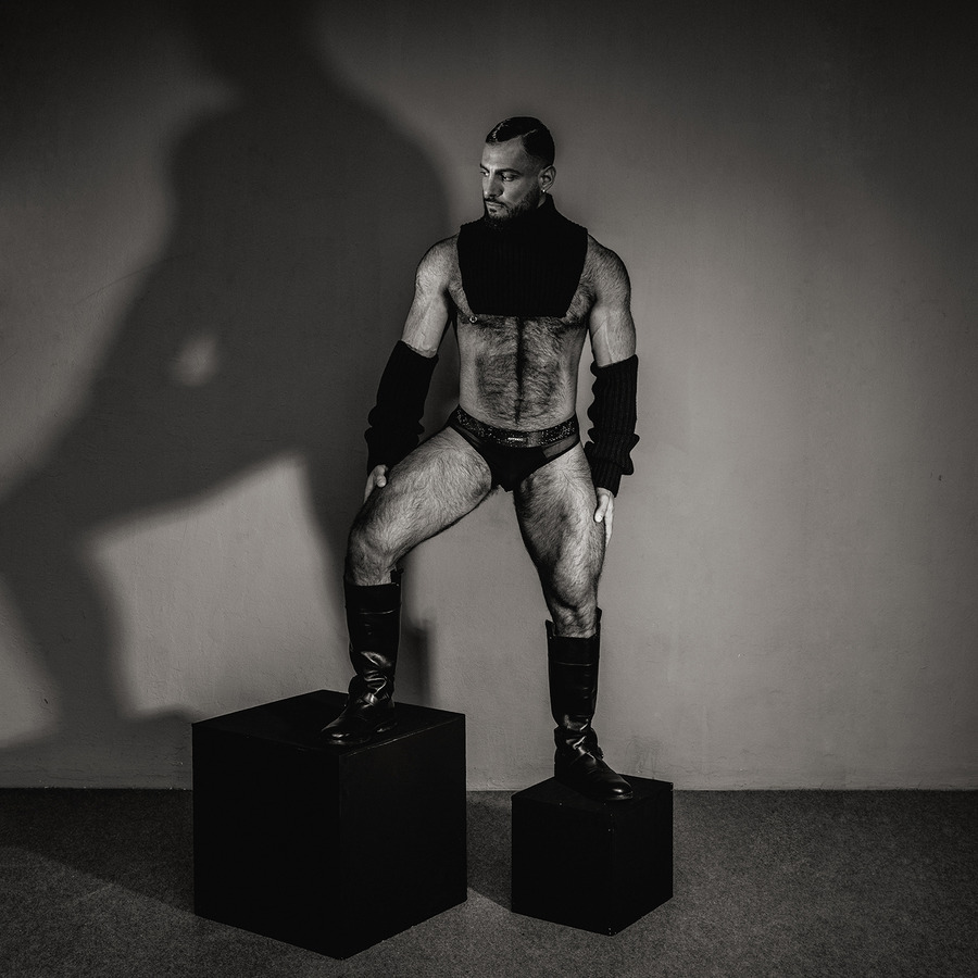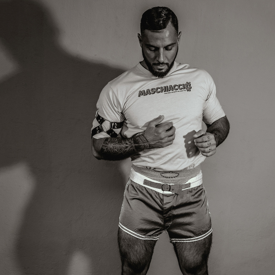 A KALTBLUT exclusive. Photographer Filippo Thiella captured Michele Adamo for us. Styled by Stefano Guerrini. Makeup by Cecilia Olmedi. The idea of reviewing the imagery linked to the visual culture of the first body-builders published in Physique Pictorial and above all to the homoerotic illustrations of Tom of Finland through a contemporary language, close to fashion. Thanks to the lens of a fashion photographer, who is also in love with portraits and their ability to tell worlds and emotions, and of a stylist who has always made cultural research linked to fashion one of his strengths.