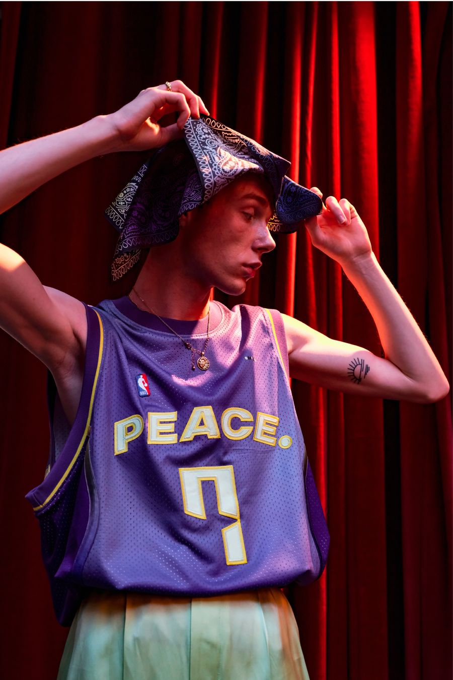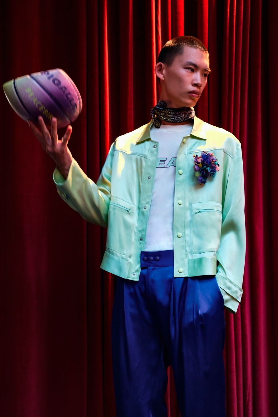The clothing collection is using flashy silk colors, patchwork of leather made in Paris and items related to his basketball lines.