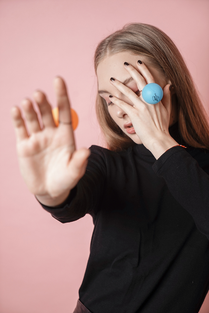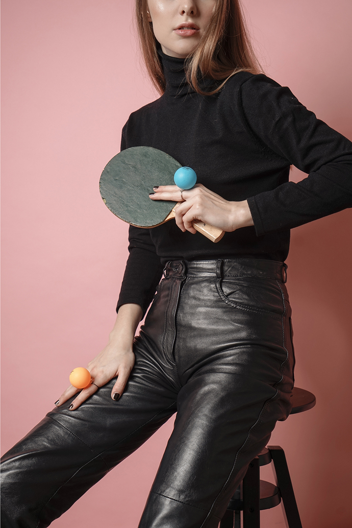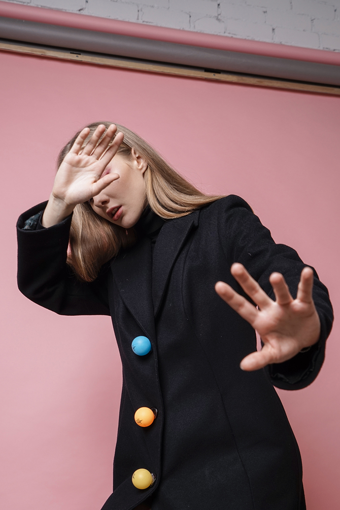 A KALTBLUT exclusive womenswear story. An editorial photoshoot by Lithuanian photographer Elenah Kruk. Model is Meg Jolie signed at Supermodels Managment. The idea is to show the metamorphosis of a ping pong ball. The design is conceptual. Make up by Meg Jolie and styling by Elenah Kruk.