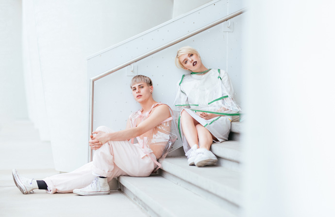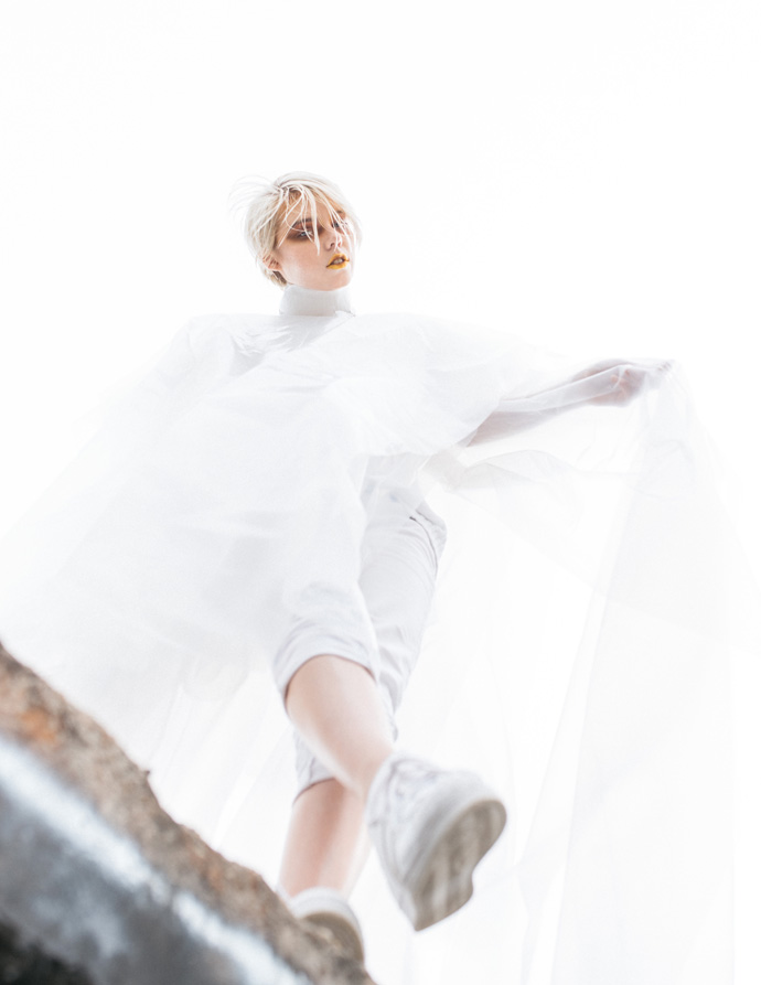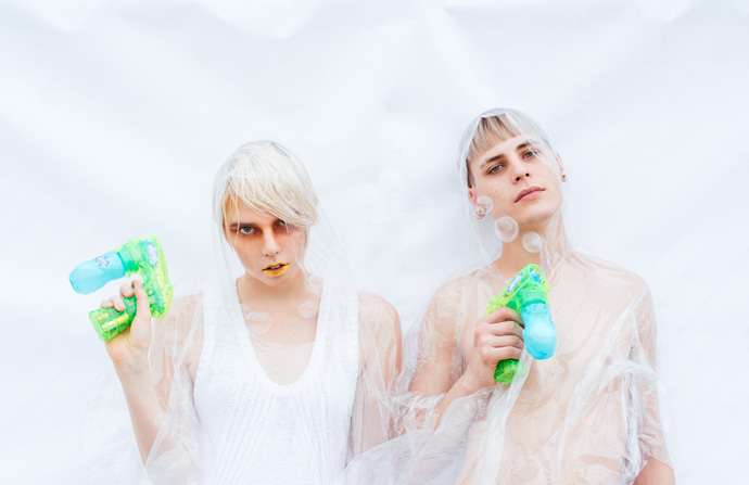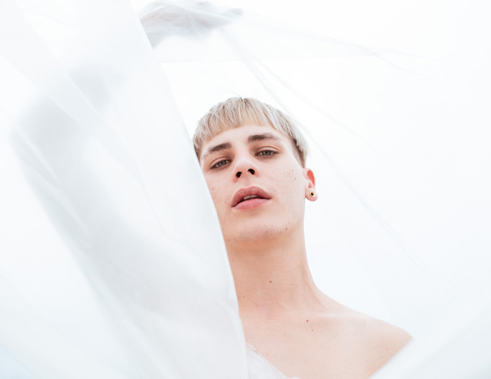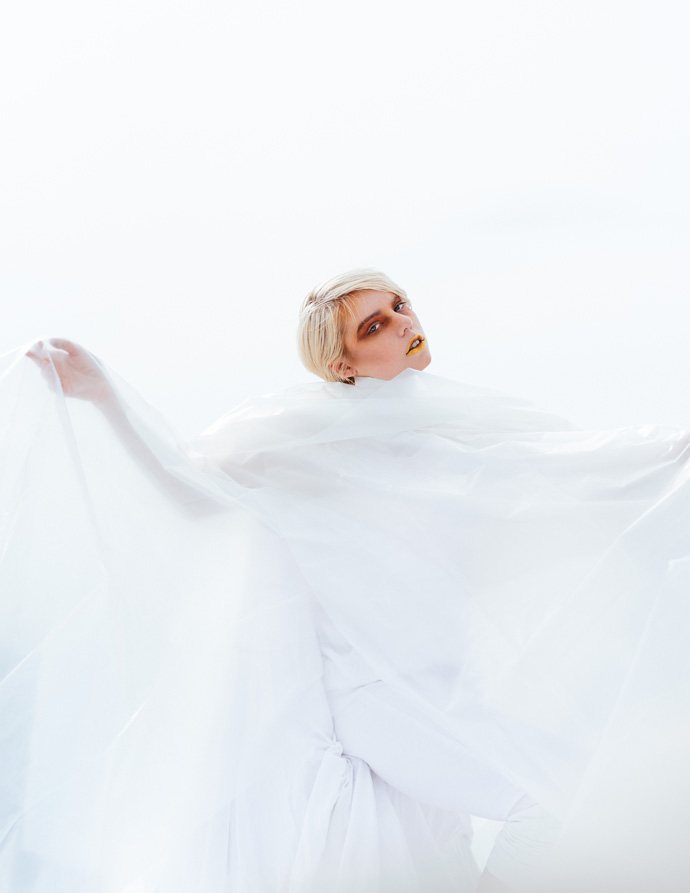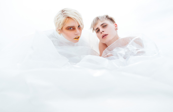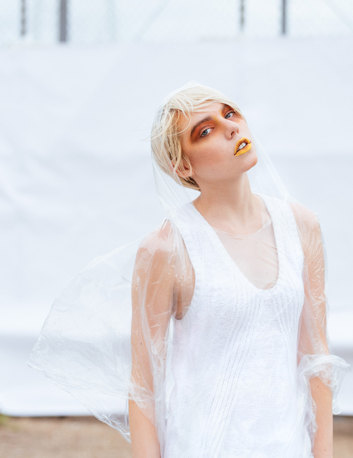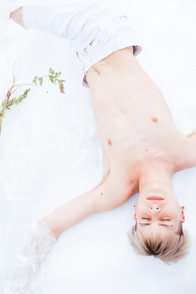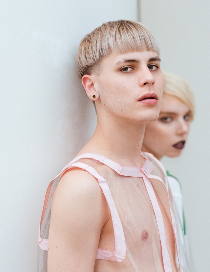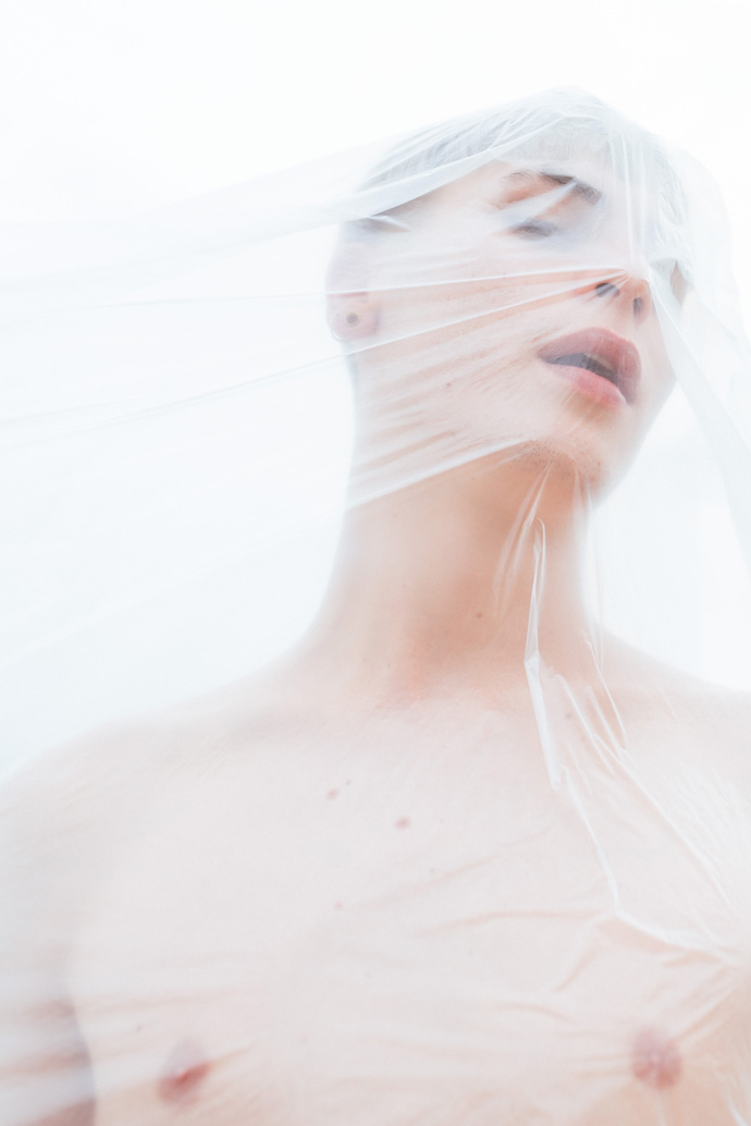A KALTBLUT exclusive editorial by Marshall Cox. A 22-year-old fashion & portrait photographer in Dallas, TX – US. He is intrigued by the social norms and pre-conceptions which plague the human mind. He often finds himself inspired by stark shadows, individuality in human perception, and simplicity. This shoot was inspired by androgyny & transparency – a creative collaboration with Patricio Rivera. Models are Ciera Prestil signed at Wallflower Management and Chaz Mustin. Each look was created by the team from different plastic elements.