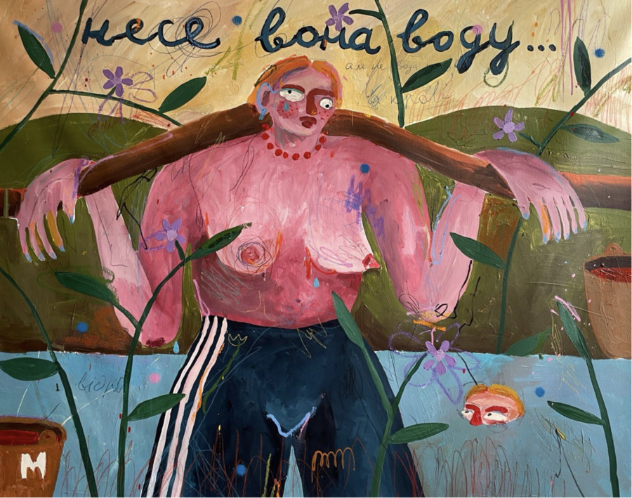 Dzvinya Podlyashetska: The artist’s work centres around expressive paintings and works on paper that explore mental health, human interactions, and emotions. Life is depicted in a colourful and sarcastic way with ambiguity, addressing existential and political issues. Despite portraying violence and anger, the art is rendered in a comic and colourful manner to mitigate cruelty. Bright colours are used to paint dark subjects, symbolizing the search for light in challenging times.