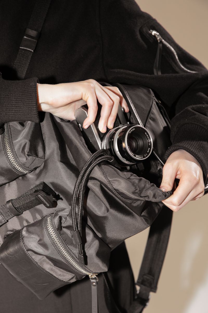 Treated to be water-repellent, made of fine nylon gabardine with a calfskin finish and leather accessories, the exclusive backpacks have a padded back, large functional outer and inner pockets and shoulder straps with an EVA core.
