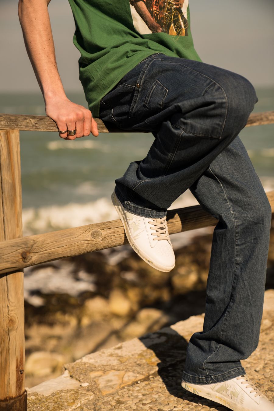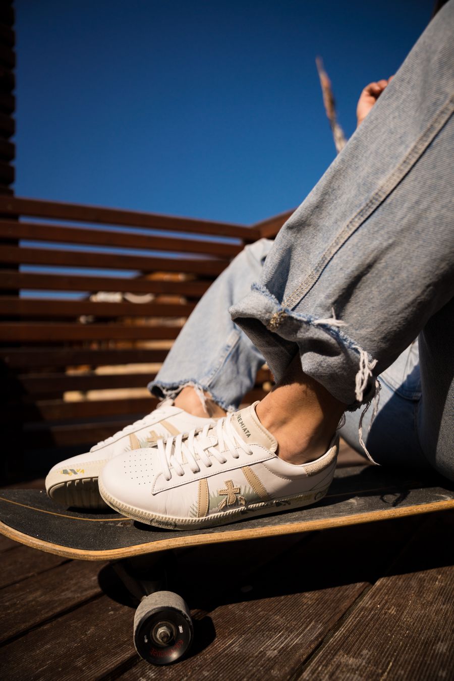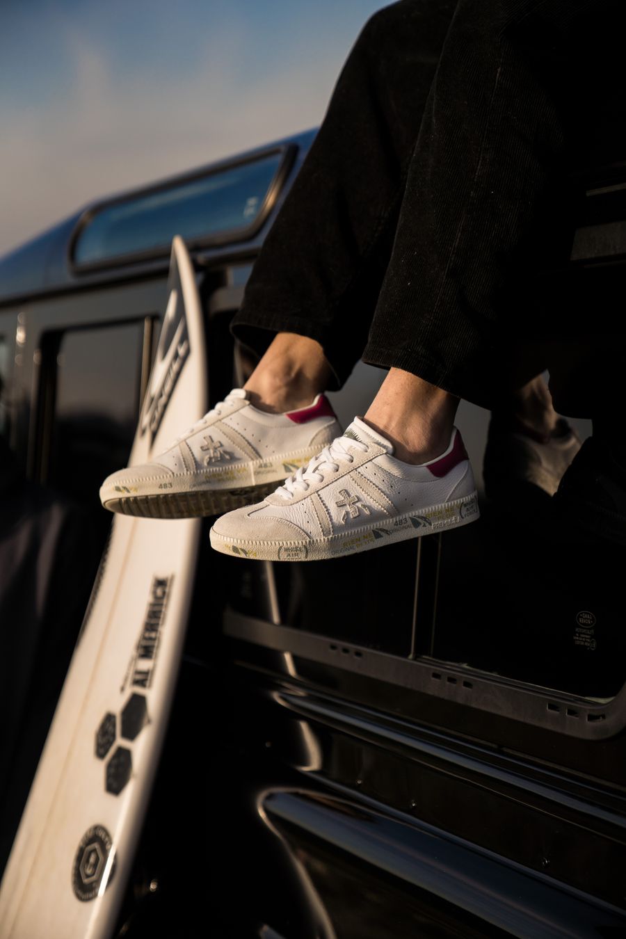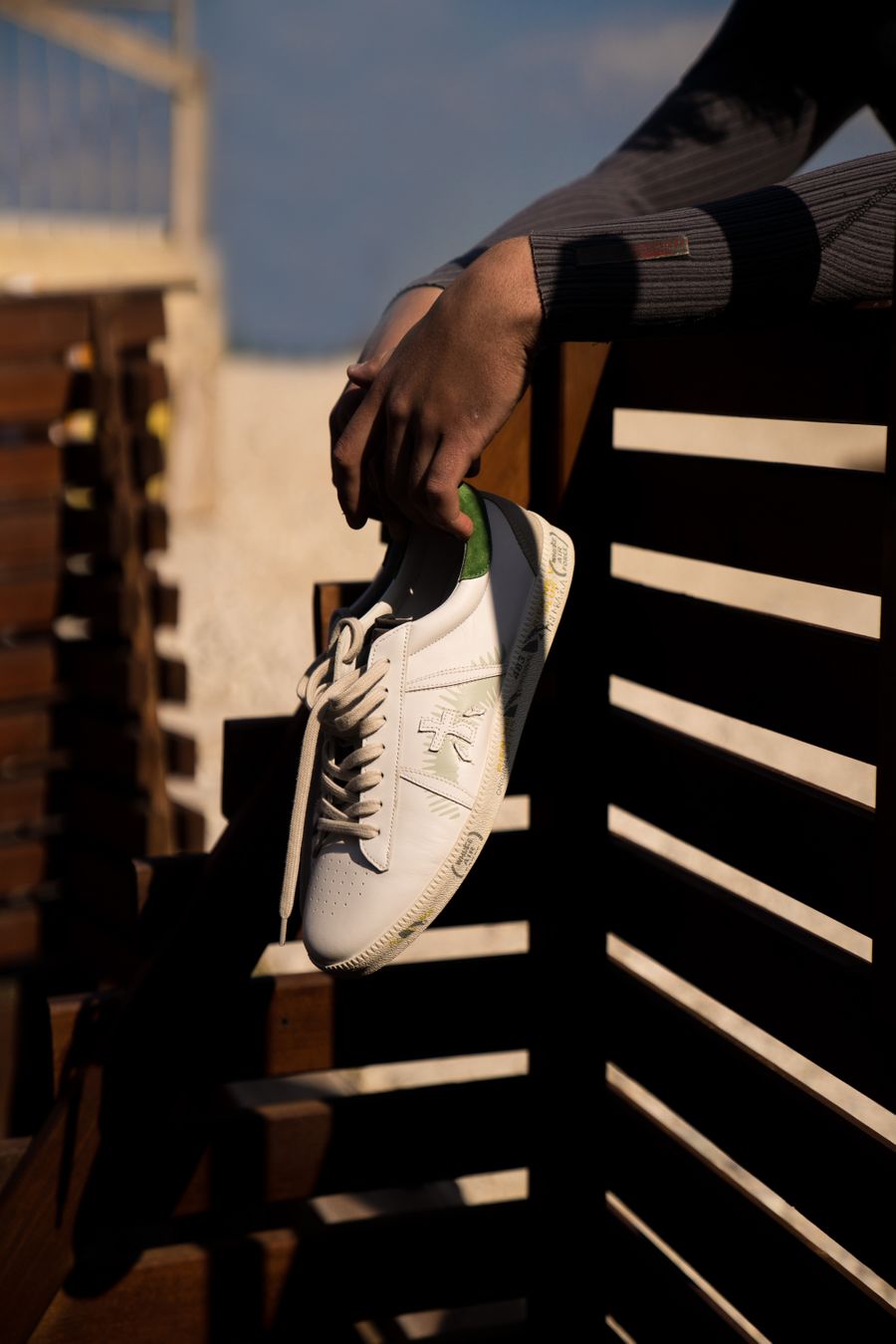 Andy, a derby, goes with Bonnie, an oxford. They are connected by the same comfort, highest quality of materials, and keyword of Premiata collections, and they are developed in all shades of white, where logos appear like they are engraved.