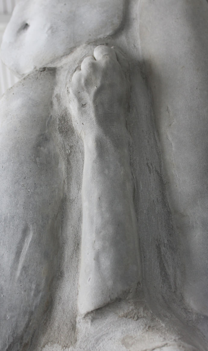 The installation “Preserve Me” is constructed out of 40 different casts of my own body. The process involved long casting sessions of standing still with my arms stretched up. Each unwanted movement would destroy the cast. The long duration of these sessions and the passiveness of standing still for two hours reinforced the concept of this work. I was casted in plaster, preserving my posture; solid, stretched.