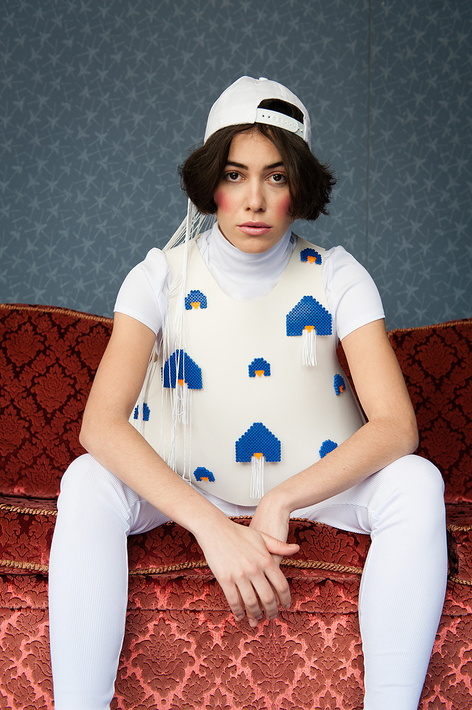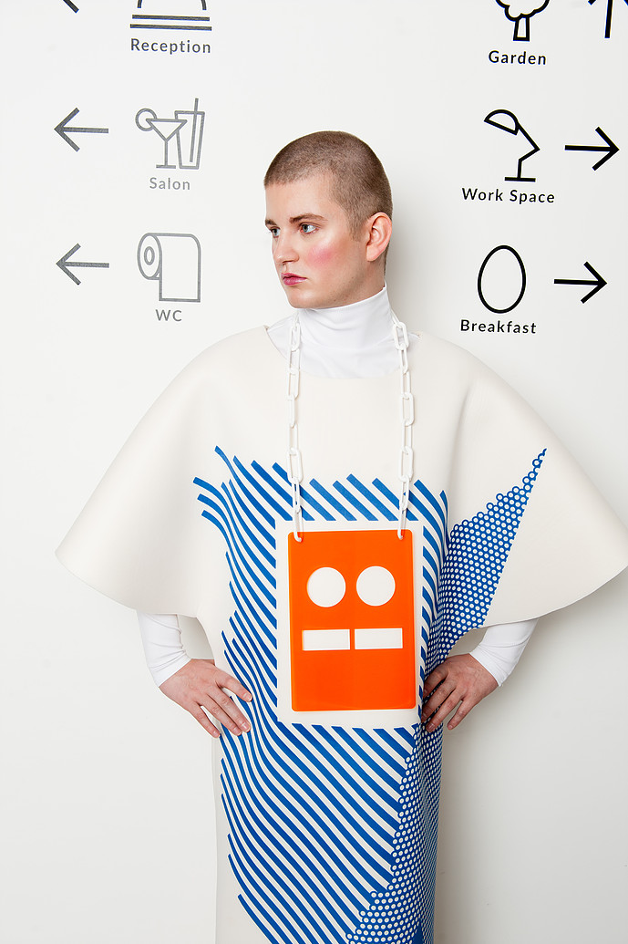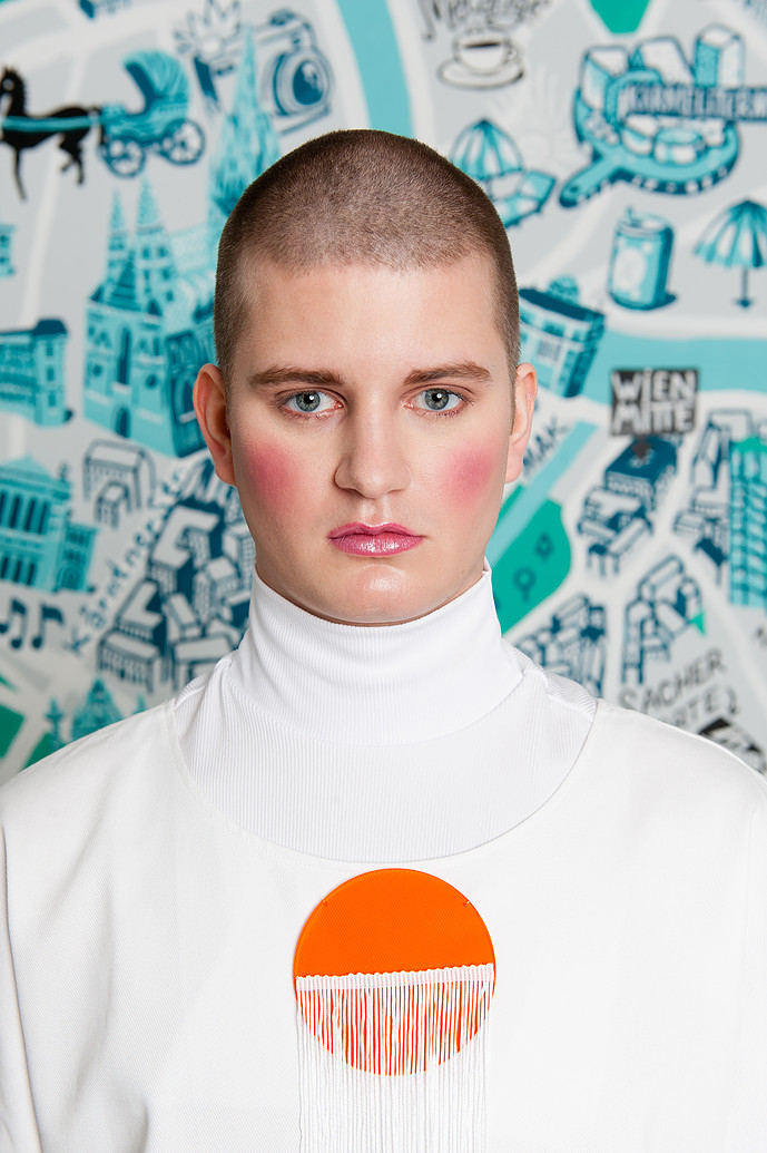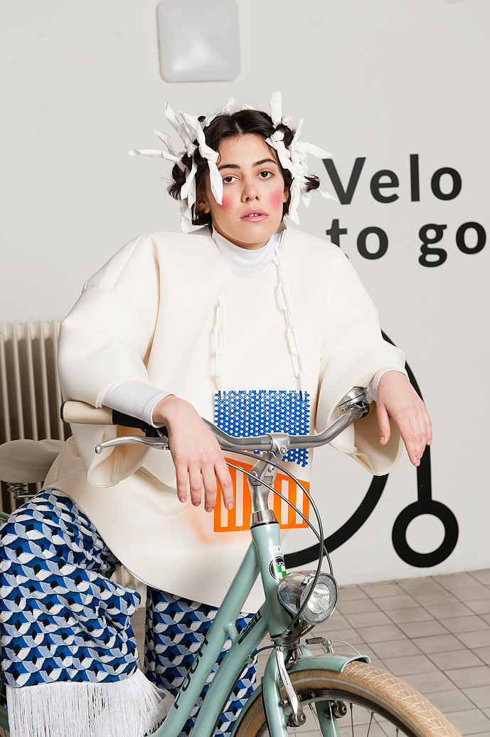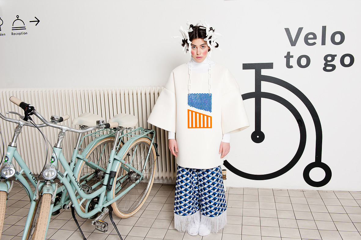 Introducing fashion designer Zuzana Radicova from Vienna. Punkti Punkti Strichi Strichi` was inspired by childhood memories. “The outfits from the collection should give you the impression, that they could have been realized from a children’s drawing. I find the fact how children draw clothes fascinating. There is so much imagination and ease to it, everything seems two-dimensional, naive, obvious, yet pure. Rather than thinking and designing with the intention of a garment being practical and wearable, I tried to let go and just started to create. To achieve the two-dimensionality I used Neoprene as a main fabric. To break the stiffness of the looks, I chose fringe and placed it on different areas, for example to playfully represent the intimate part of a woman. As a whimsical twist I used Ironing beads to create the Accessories of the collection. The collection is influenced by various Artist such as Wes Anderson, Roy Lichtenstein and Katsushika Hokusai.”