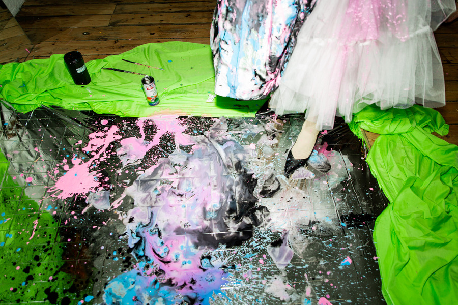 But the real showstopper? Olli himself hit the runway with a can of spray paint and a floral 1980s-style bridesmaid dress, creating wearable magic right before our eyes. With a few swipes and sprays, he turned the dress into something straight out of an avant-garde dream. It was messy, it was real, and it was pure Olli Hull.