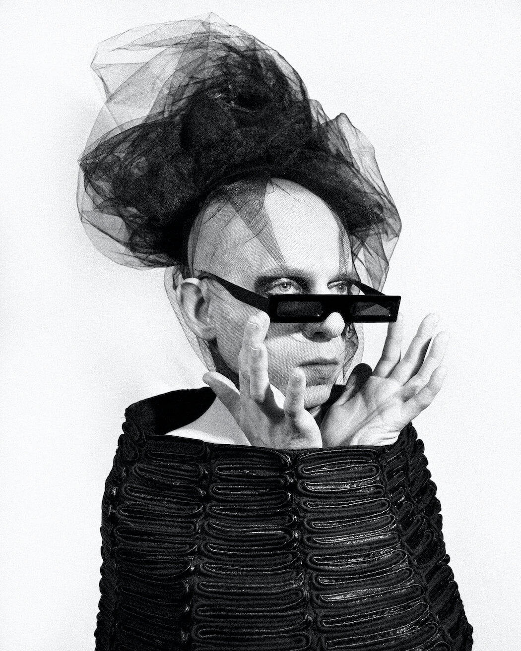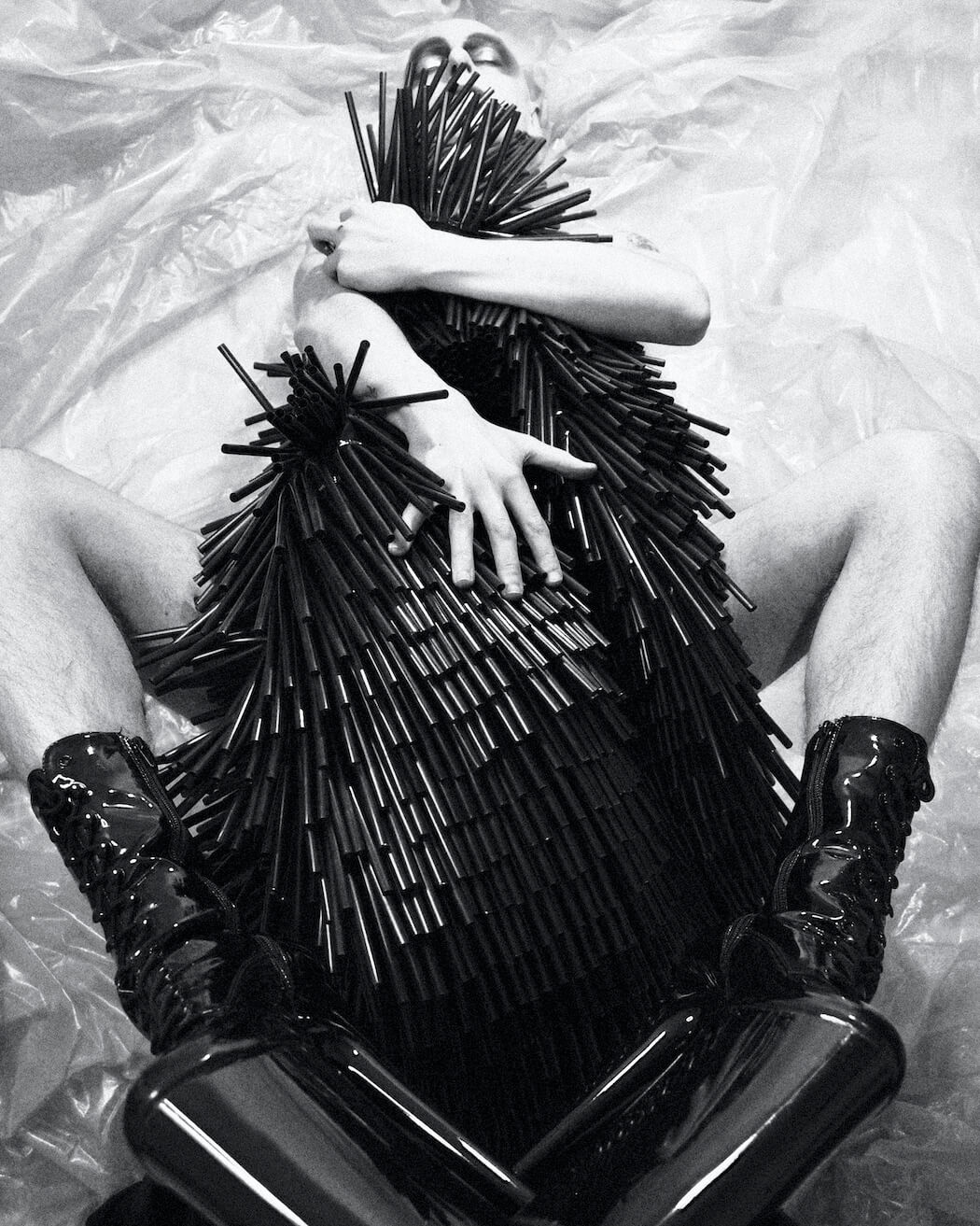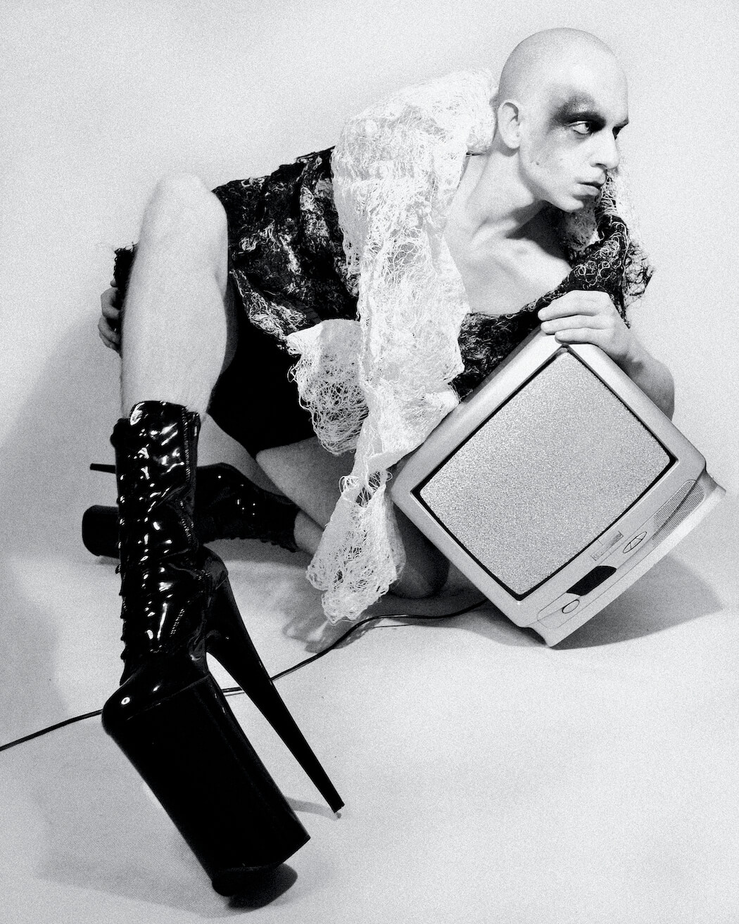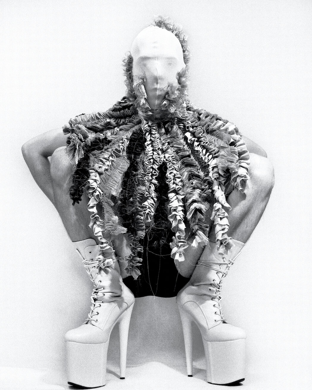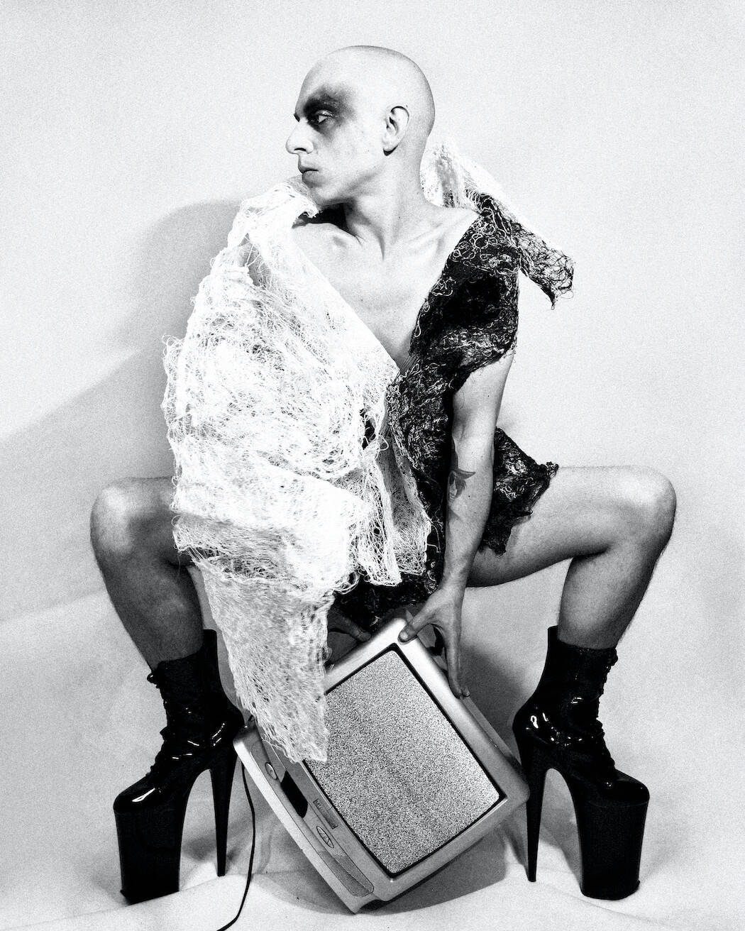 A KALTBLUT exclusive. Photographer and stylist Krystian Szymczak captured Rascal Black for us. Make-up by Robert Pyczek. All fashion and headpieces by Krystian Szymczak, sunglasses by Brylove, shoes by Pleaser Shoes.