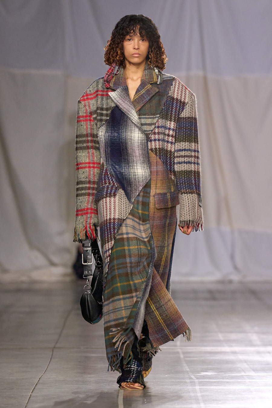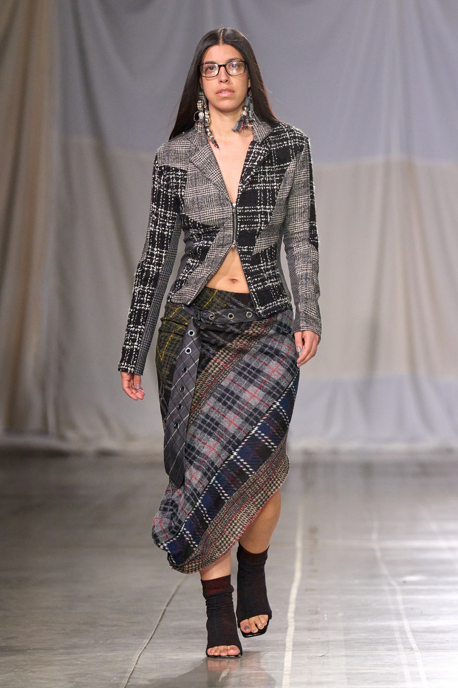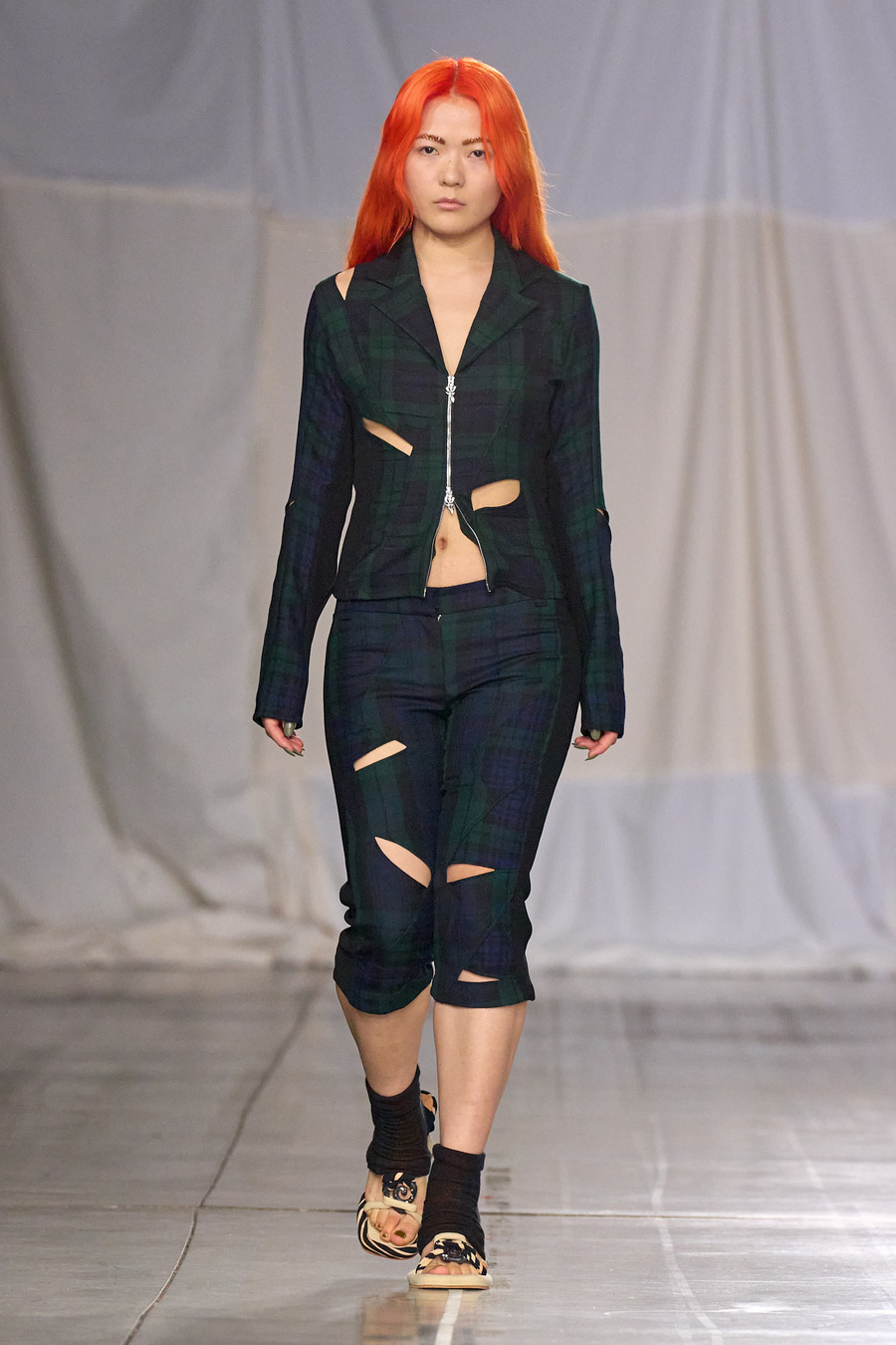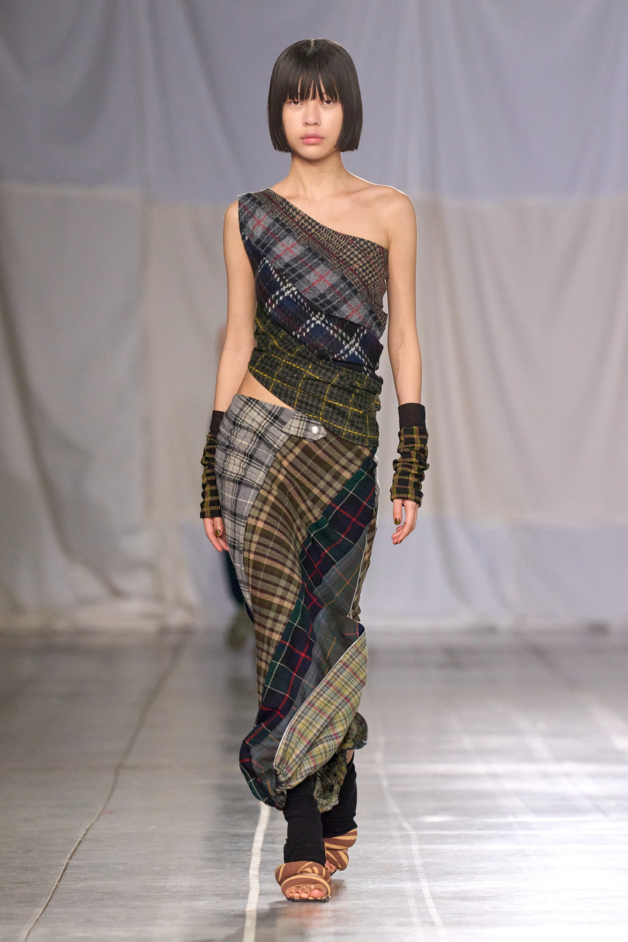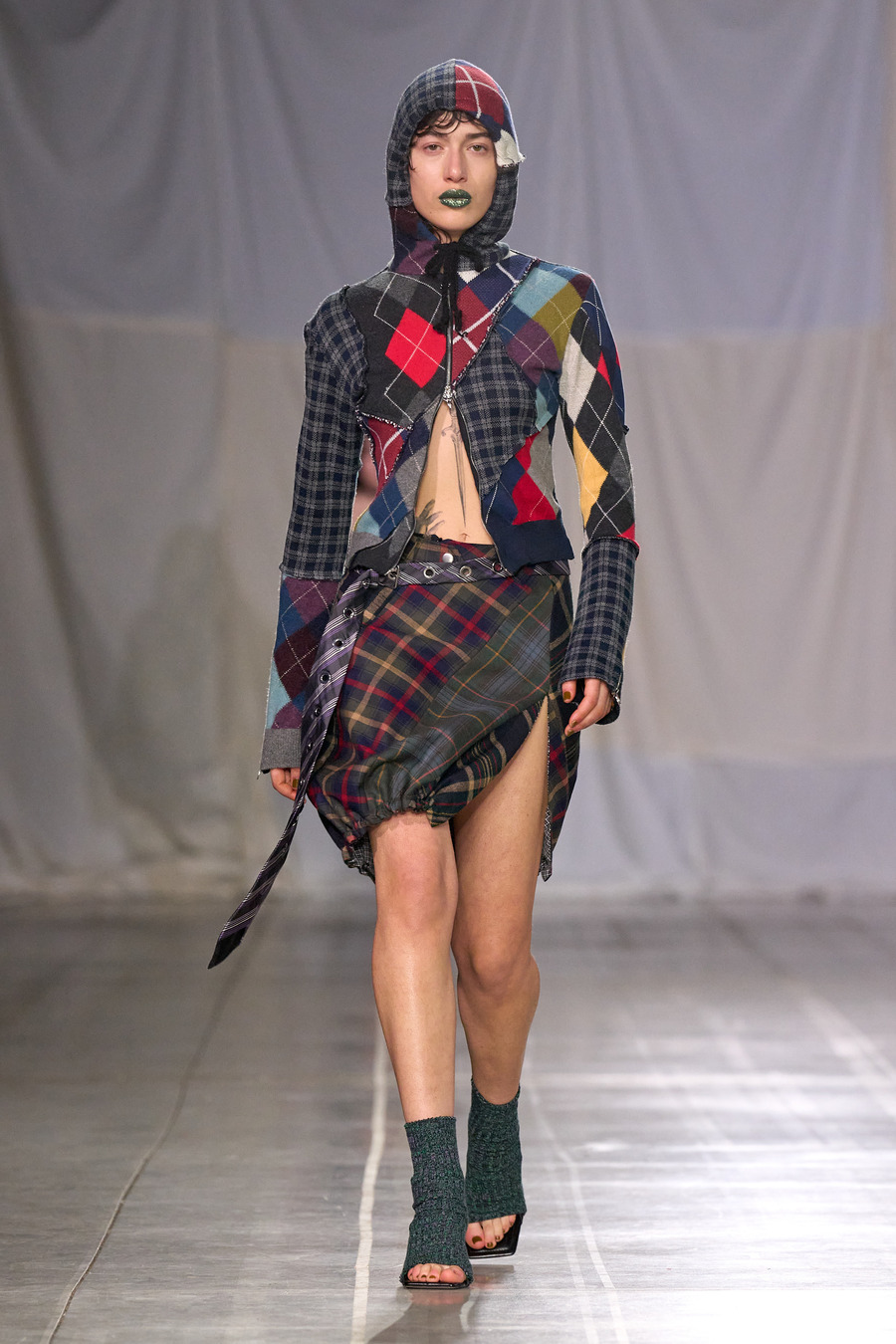Crafted from eco-conscious upcycled materials, the collection draws silhouette inspiration from historical fashion epochs, blending effortlessly across the vintage backdrop of the 1960s and the early millennium’s Y2K vibe, the narrative threading through time where the essence of history softens and where nostalgia serves as a spectral reminder of the what-ifs left behind. The designs boldly reinterpret classic tartans, argyles, and eye-catching leopard patterns, masterfully disassembling and reimagining them into fresh, novel forms.
