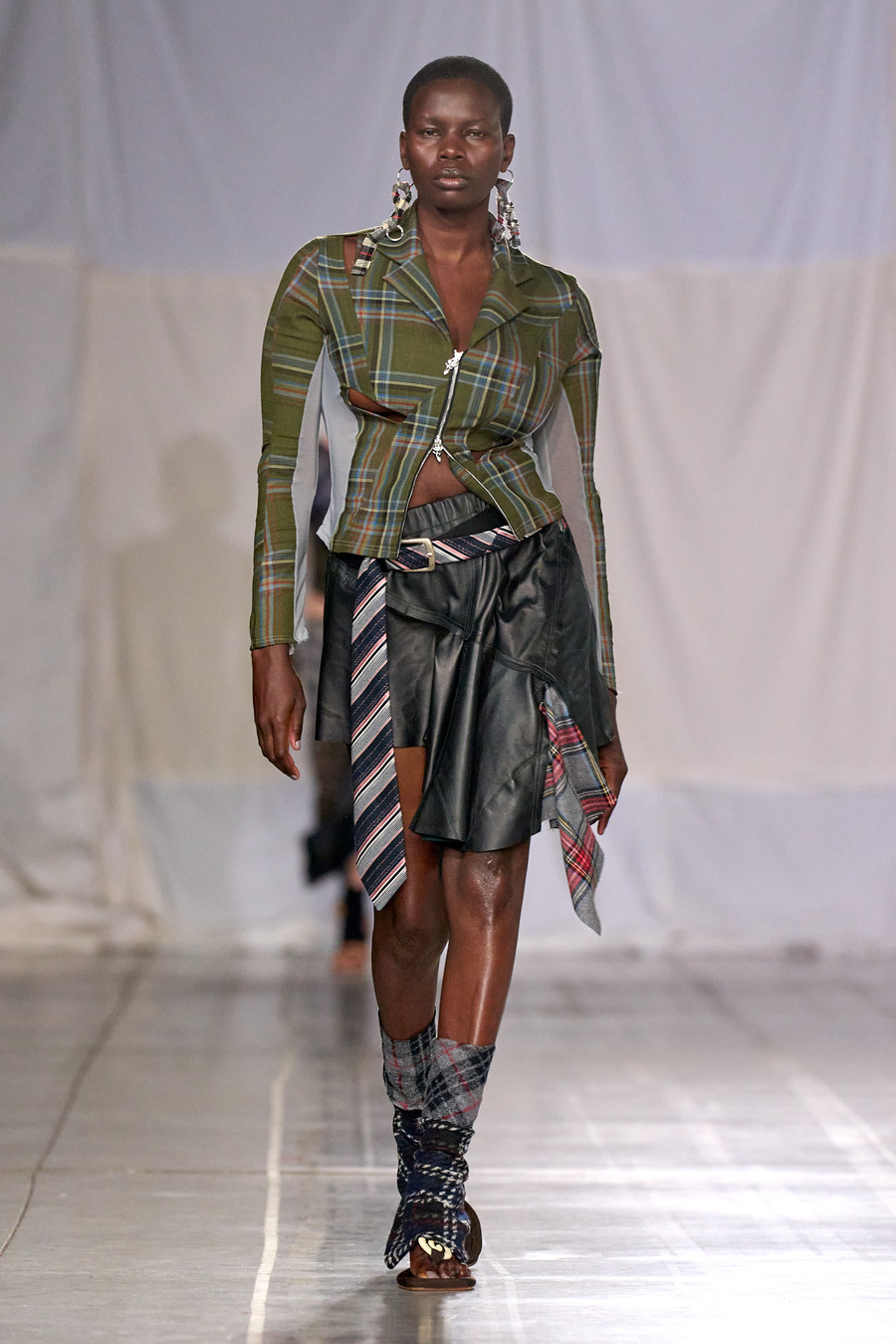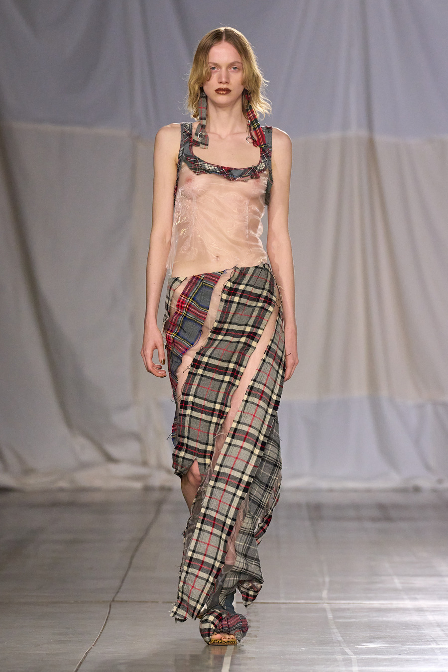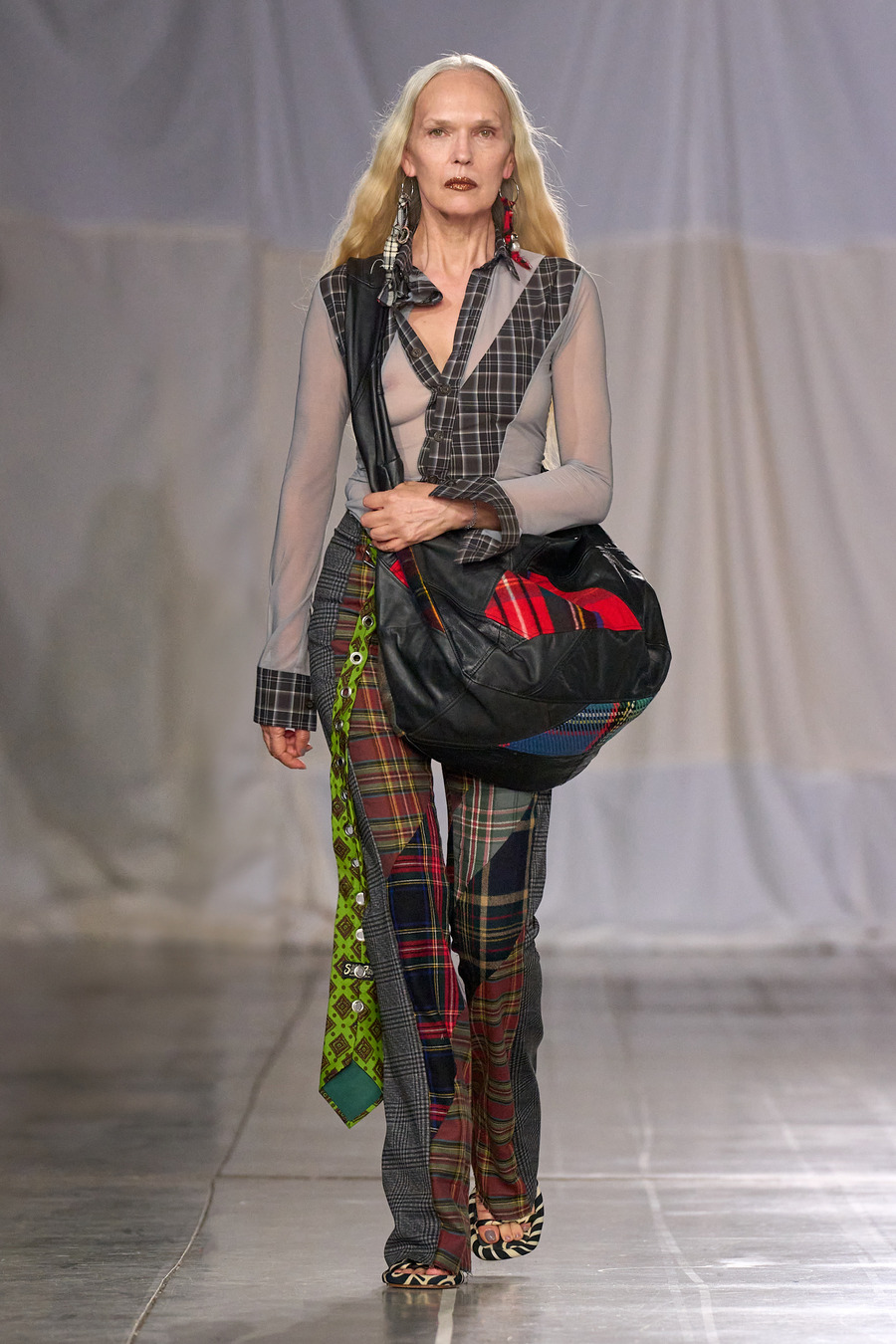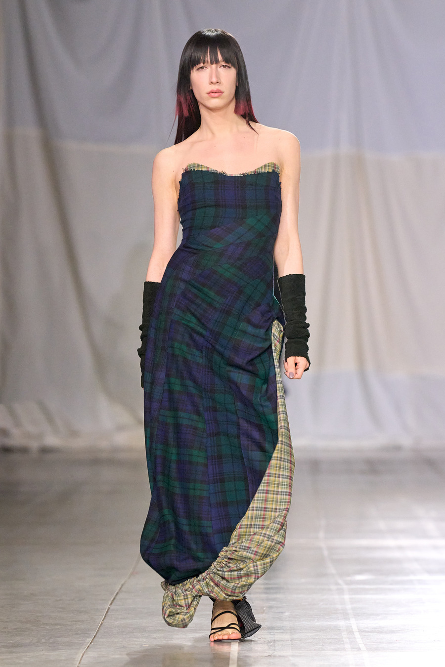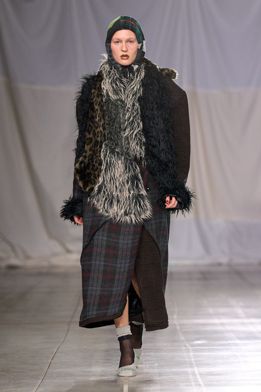 Crafted from eco-conscious upcycled materials, the collection draws silhouette inspiration from historical fashion epochs, blending effortlessly across the vintage backdrop of the 1960s and the early millennium’s Y2K vibe, the narrative threading through time where the essence of history softens and where nostalgia serves as a spectral reminder of the what-ifs left behind. The designs boldly reinterpret classic tartans, argyles, and eye-catching leopard patterns, masterfully disassembling and reimagining them into fresh, novel forms.