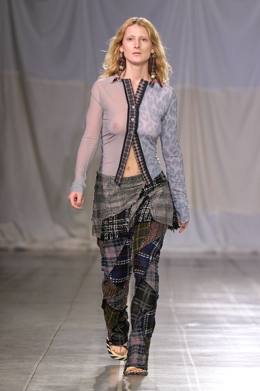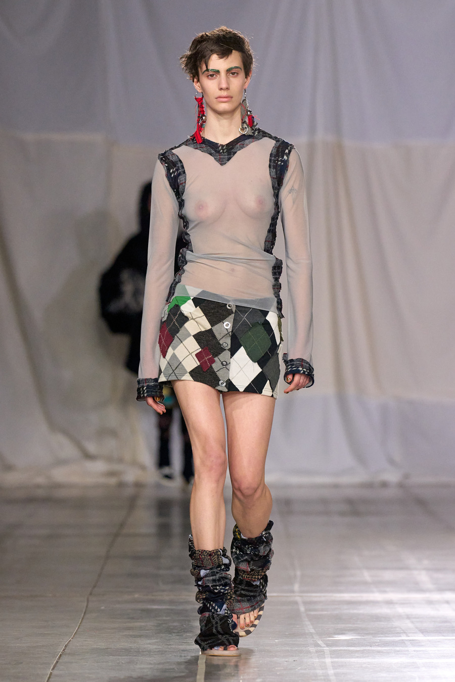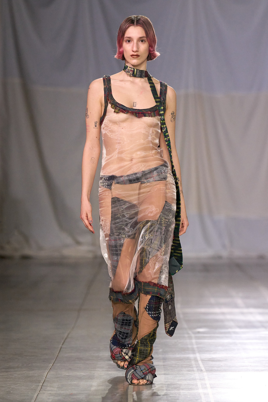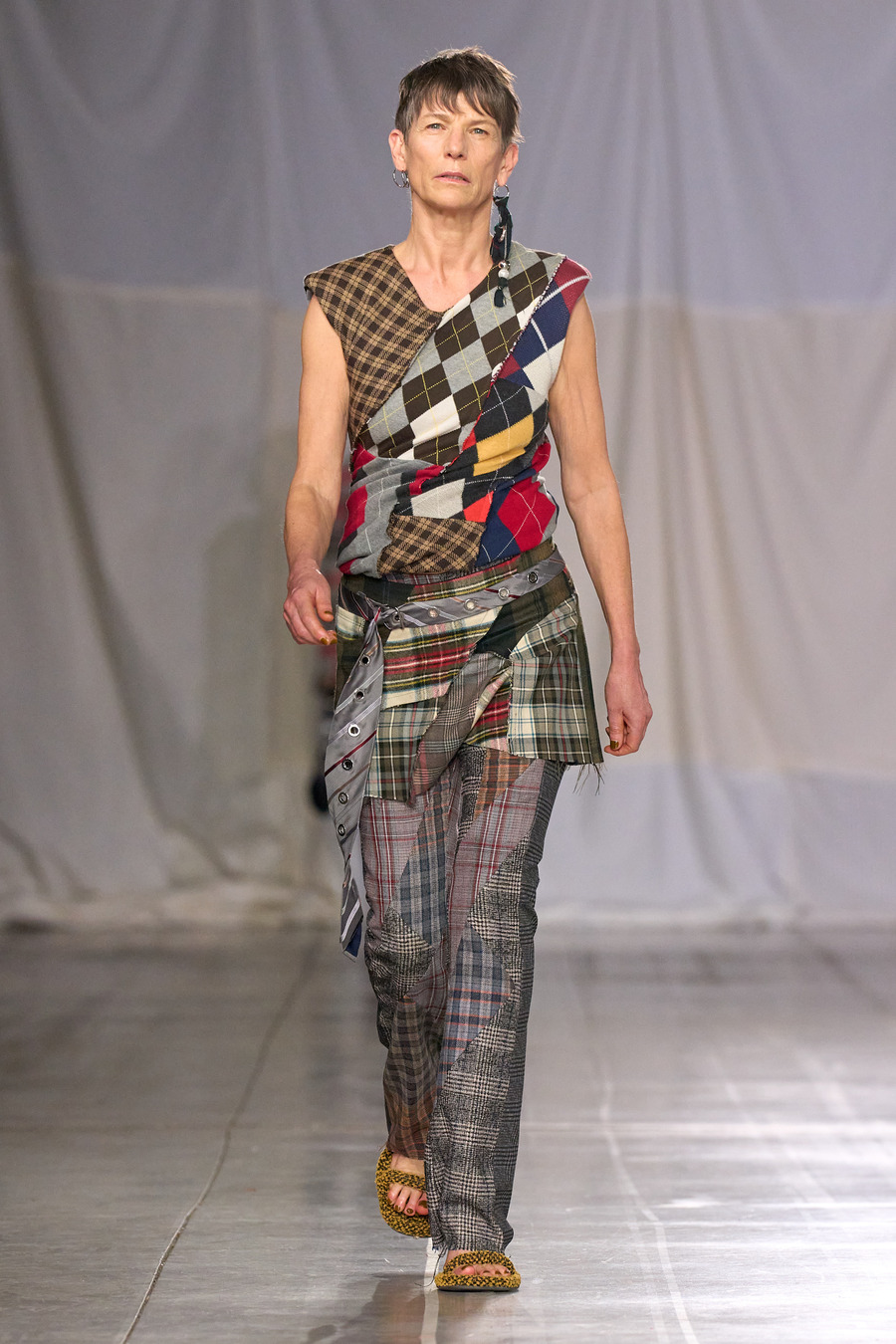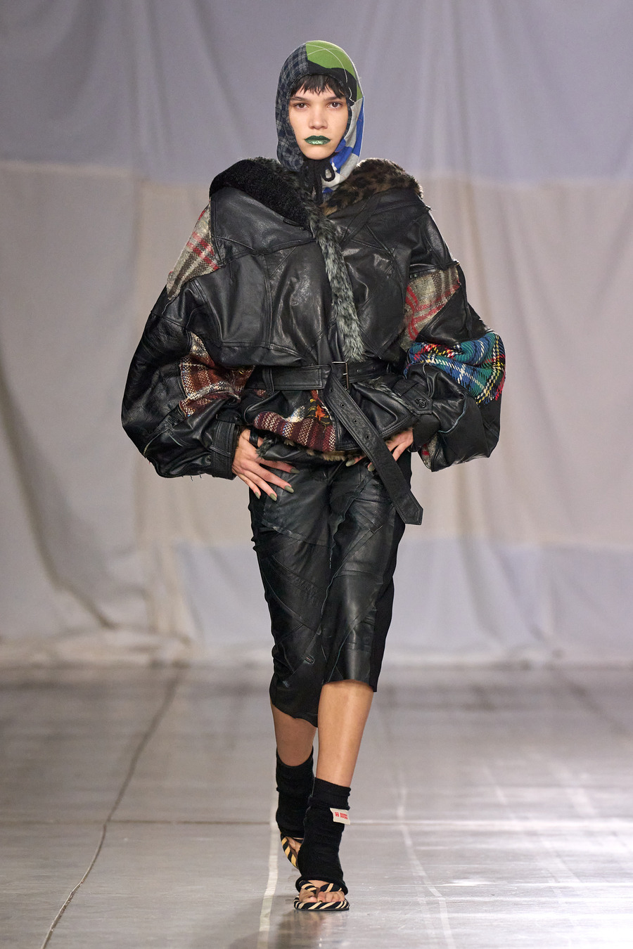 Crafted from eco-conscious upcycled materials, the collection draws silhouette inspiration from historical fashion epochs, blending effortlessly across the vintage backdrop of the 1960s and the early millennium’s Y2K vibe, the narrative threading through time where the essence of history softens and where nostalgia serves as a spectral reminder of the what-ifs left behind. The designs boldly reinterpret classic tartans, argyles, and eye-catching leopard patterns, masterfully disassembling and reimagining them into fresh, novel forms.
