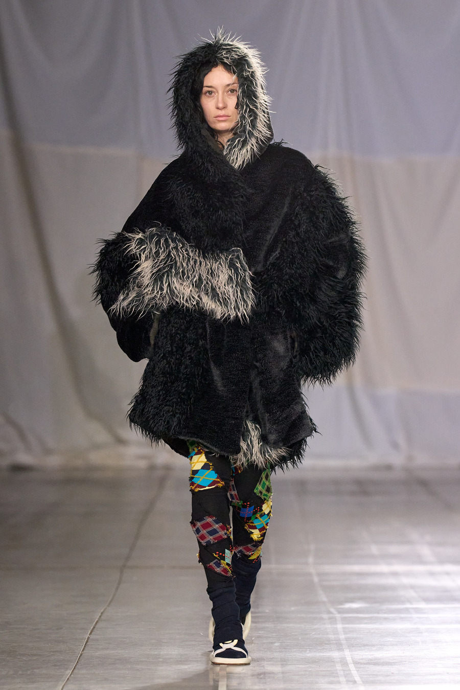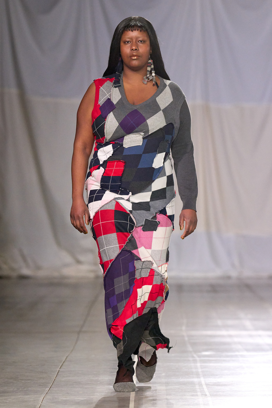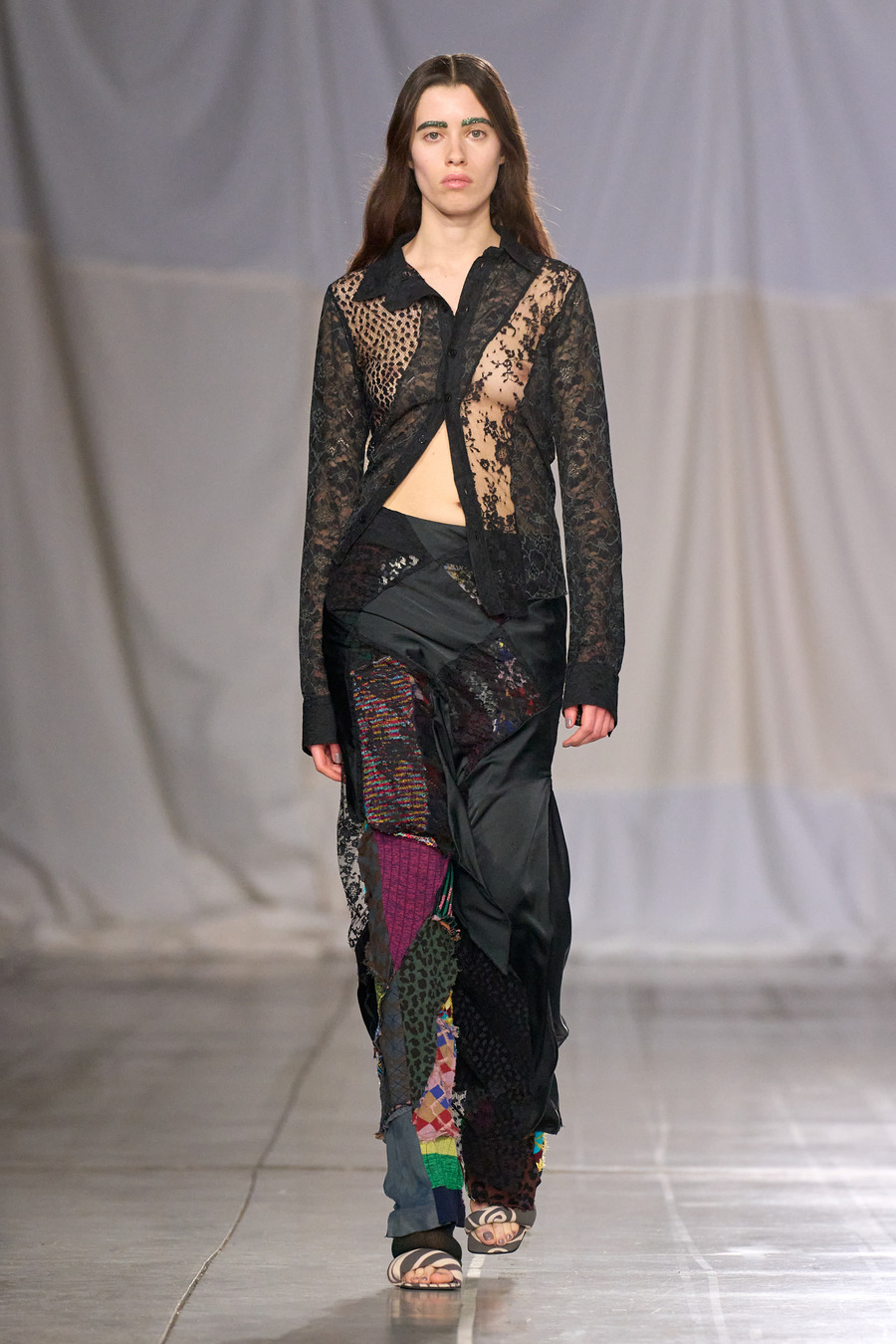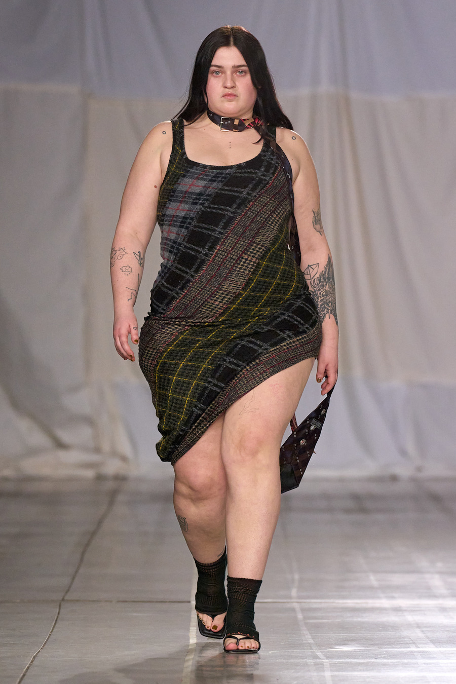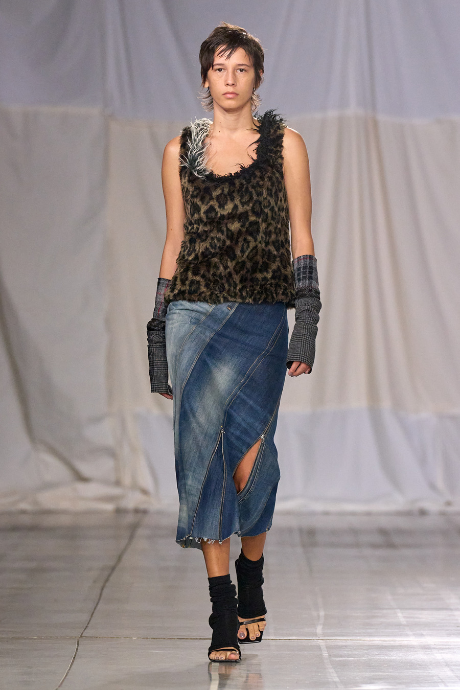 Crafted from eco-conscious upcycled materials, the collection draws silhouette inspiration from historical fashion epochs, blending effortlessly across the vintage backdrop of the 1960s and the early millennium’s Y2K vibe, the narrative threading through time where the essence of history softens and where nostalgia serves as a spectral reminder of the what-ifs left behind. The designs boldly reinterpret classic tartans, argyles, and eye-catching leopard patterns, masterfully disassembling and reimagining them into fresh, novel forms.