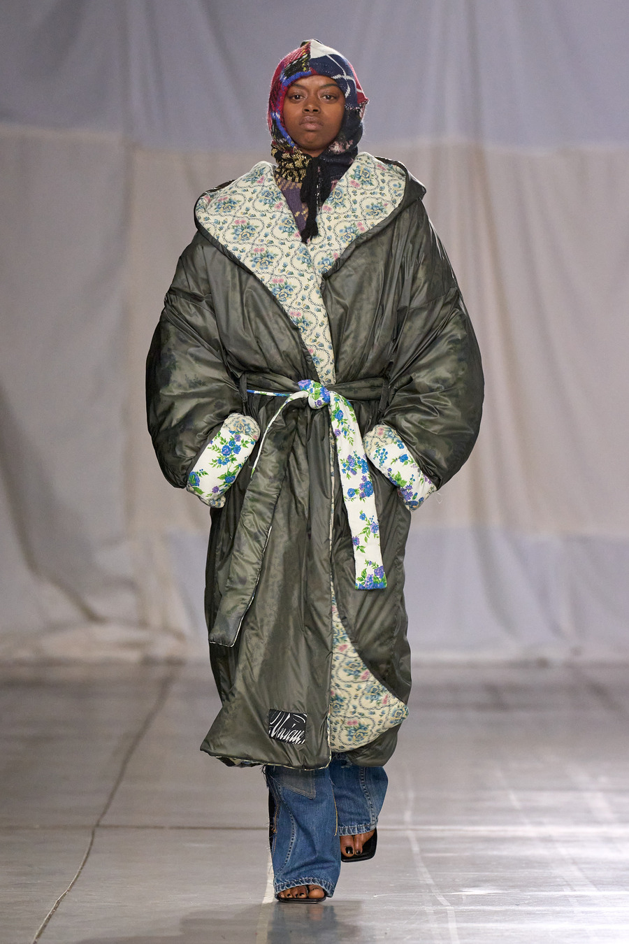 Within the collection, prints diverge and converge, a dance of contrasts—sheer organza juxtaposed against dense woolens, unified under a palette reminiscent of shadow and time’s imprint. The collaboration with Happy Socks LAB breathes new life into sidelined socks and samples, injecting vibrancy across the range’s accessories, from socks to leg warmers.