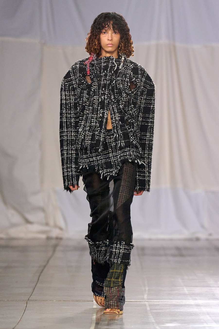 Embodying a concept of disheveled elegance, this collection reworks traditional and structured shapes into the unexpected. This orchestrated chaos manifests in punk-infused, half-done yet meticulously refined assemblages, presenting an air of rebellious sophistication.