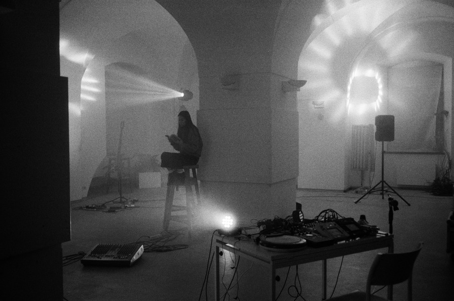 At Atonal Berlin, Salvadori presented two intriguing works, one of them being “Messengers.” This 20-minute video piece was filmed in Konvikt – Umělecké Centrum, a former Jesuit monastery, where Salvadori constructed a temporary set. Collaborating with musicians Kenichi Iwasa and Maxwell Sterling, light artist Charlie Hope, writer, editor, and curator Elaine Tam, and photographer Henerico Rossi, Salvadori masterfully created a series of mise-en-scènes, live performances, and intimate conversations.