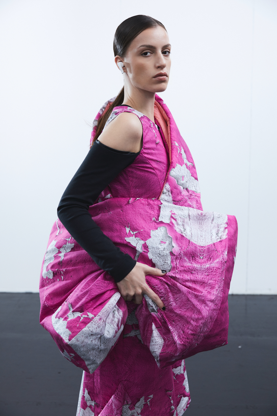 Inspired by Syoss‘ emancipated colour palette, which can be found in the specially made fabric prints, a modern and unique collection has emerged. In the garments, we find images of quirky hair prints and bold colours. Soft, comfortable materials are used for loose-fitting clothing that moves with the body. Asymmetric cuts with different silhouettes and ruffles are used to create volume and shape. Materials such as fine cotton, wool, transparent lace, vegan leather and soft padded prints make it easy to feel comfortable. Dresses are simple and relaxed in style; Trenchcoats are loose-fitting; Skirts are worn with asymmetrical blouses or tops.