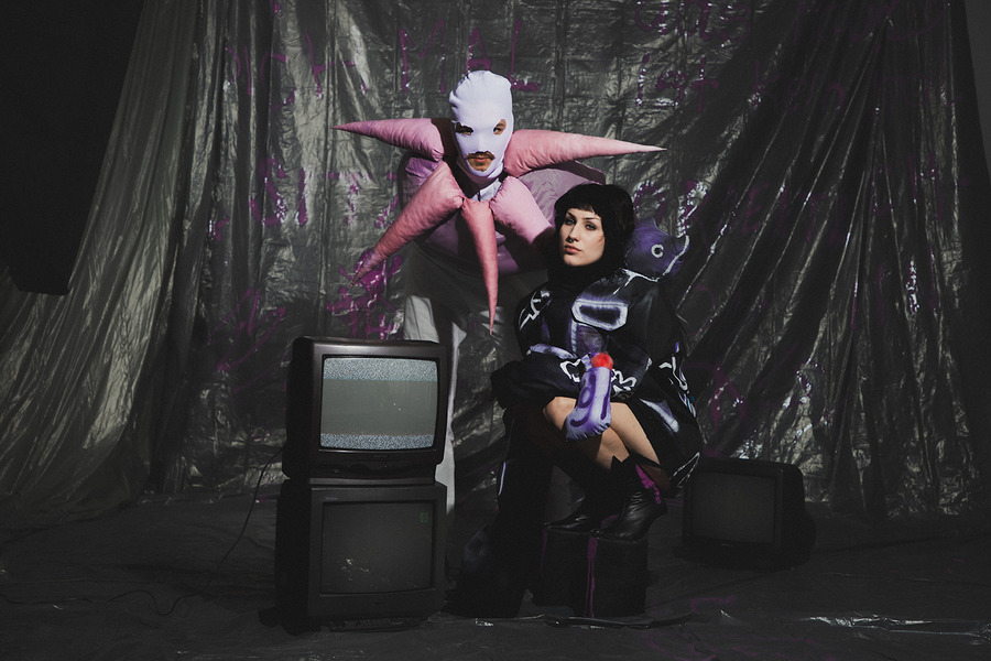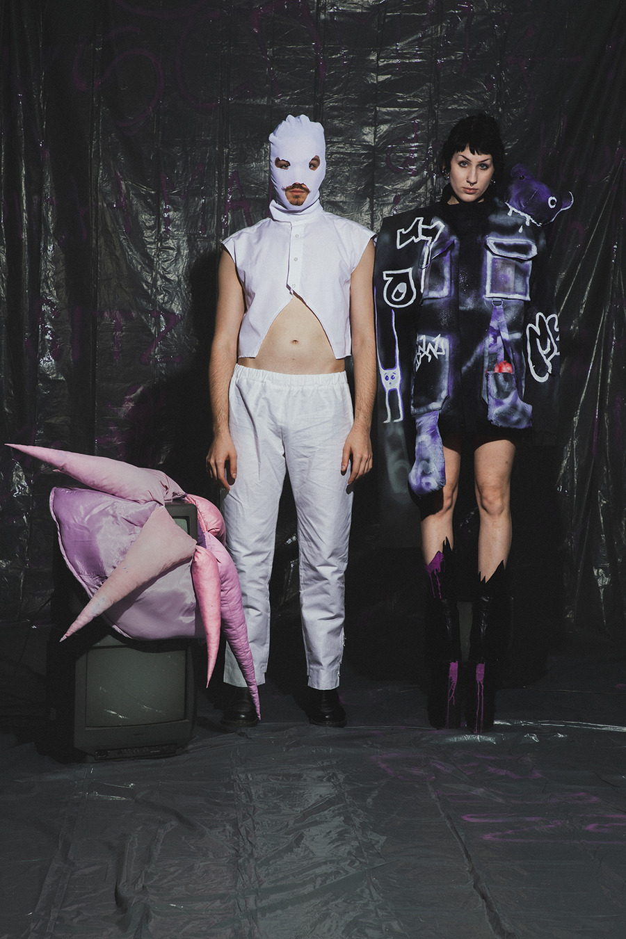 projects by presenting an editorial titled: “Rebellion is freedom!” The inspiration for the collection is Berlin, the capital of rebellion. The first model, dressed in a style inspired by a white basic shirt, is a reflection of the classic arrangement. In combination with a white balaclava hat, his identity is hidden and his intentions are unpredictable. The other model is dressed in an abstract purple form resembling a dress, which gives the impression of a carefree and innocent child emerging from it. In contrast, we can also see a girl wearing a men’s jacket with an asymmetric sleeve, which is inspired by street graffiti found in Berlin. The look is completed with high-platform shoes with purple streaks. The Projects were made at the Academy of Art in Szczecin.”