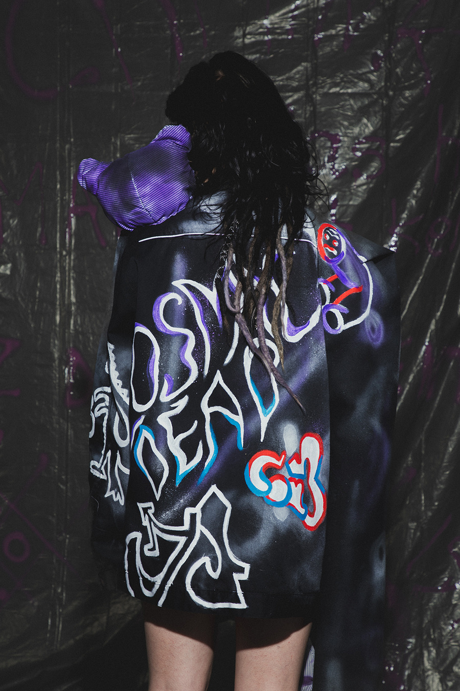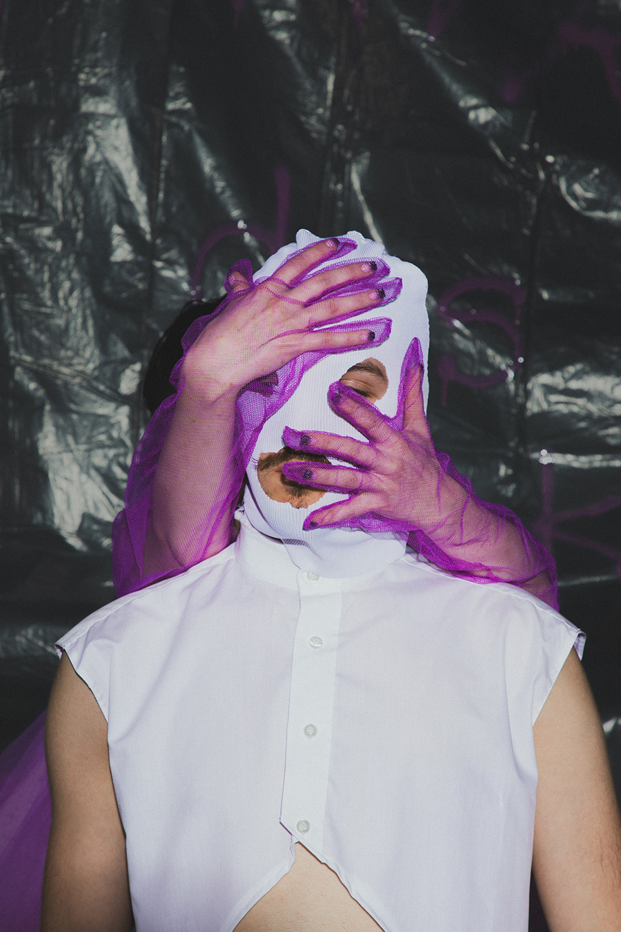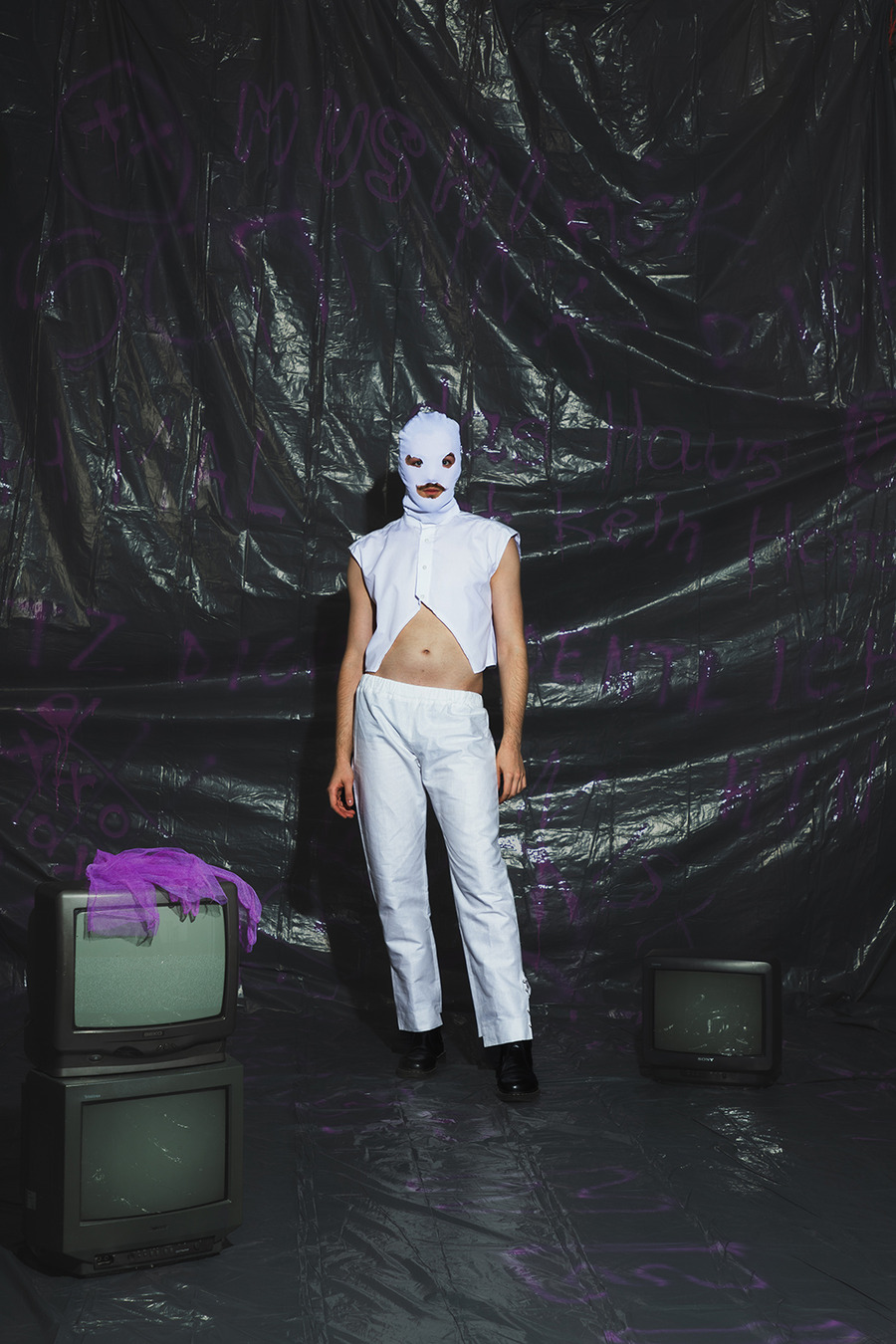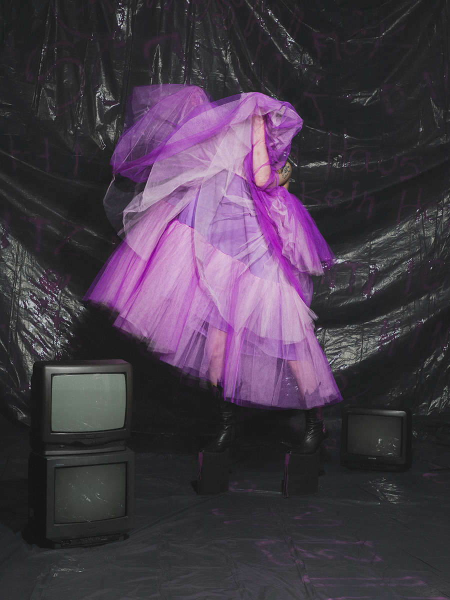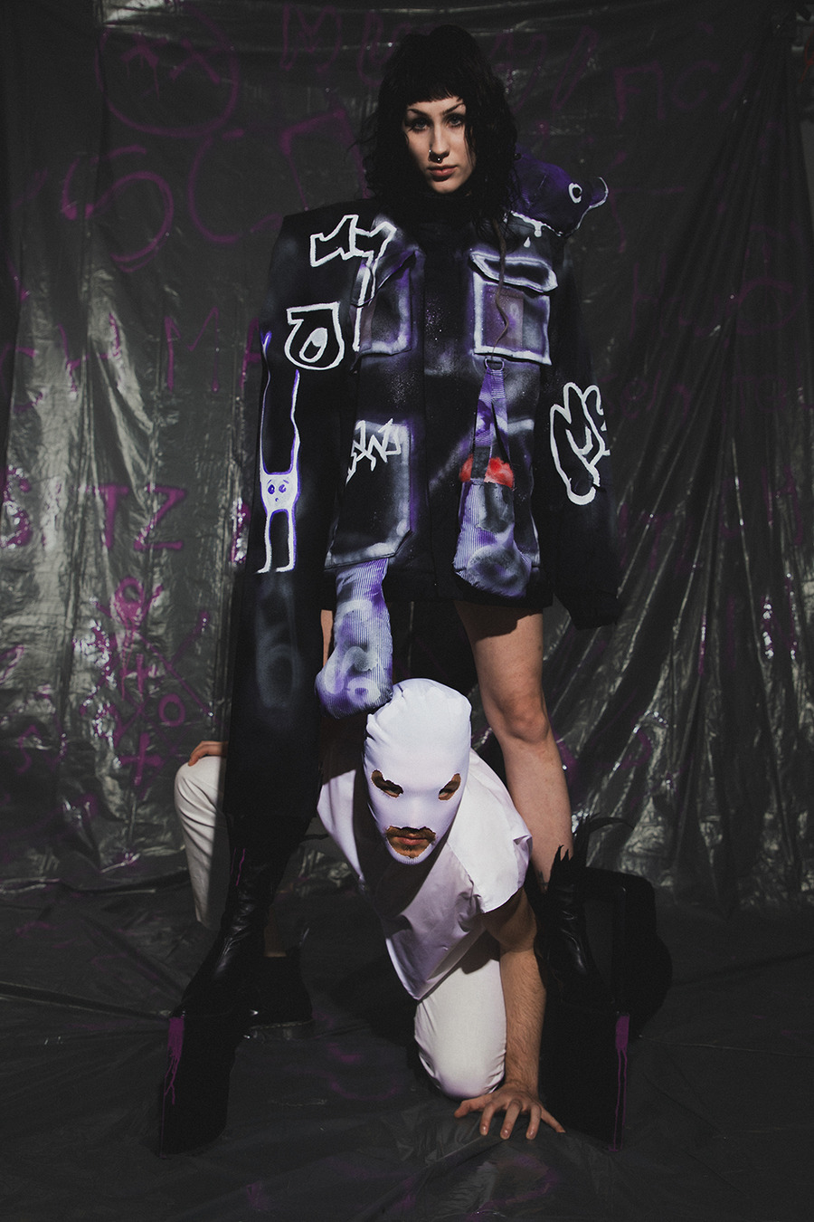 projects by presenting an editorial titled: “Rebellion is freedom!” The inspiration for the collection is Berlin, the capital of rebellion. The first model, dressed in a style inspired by a white basic shirt, is a reflection of the classic arrangement. In combination with a white balaclava hat, his identity is hidden and his intentions are unpredictable. The other model is dressed in an abstract purple form resembling a dress, which gives the impression of a carefree and innocent child emerging from it. In contrast, we can also see a girl wearing a men’s jacket with an asymmetric sleeve, which is inspired by street graffiti found in Berlin. The look is completed with high-platform shoes with purple streaks. The Projects were made at the Academy of Art in Szczecin.”