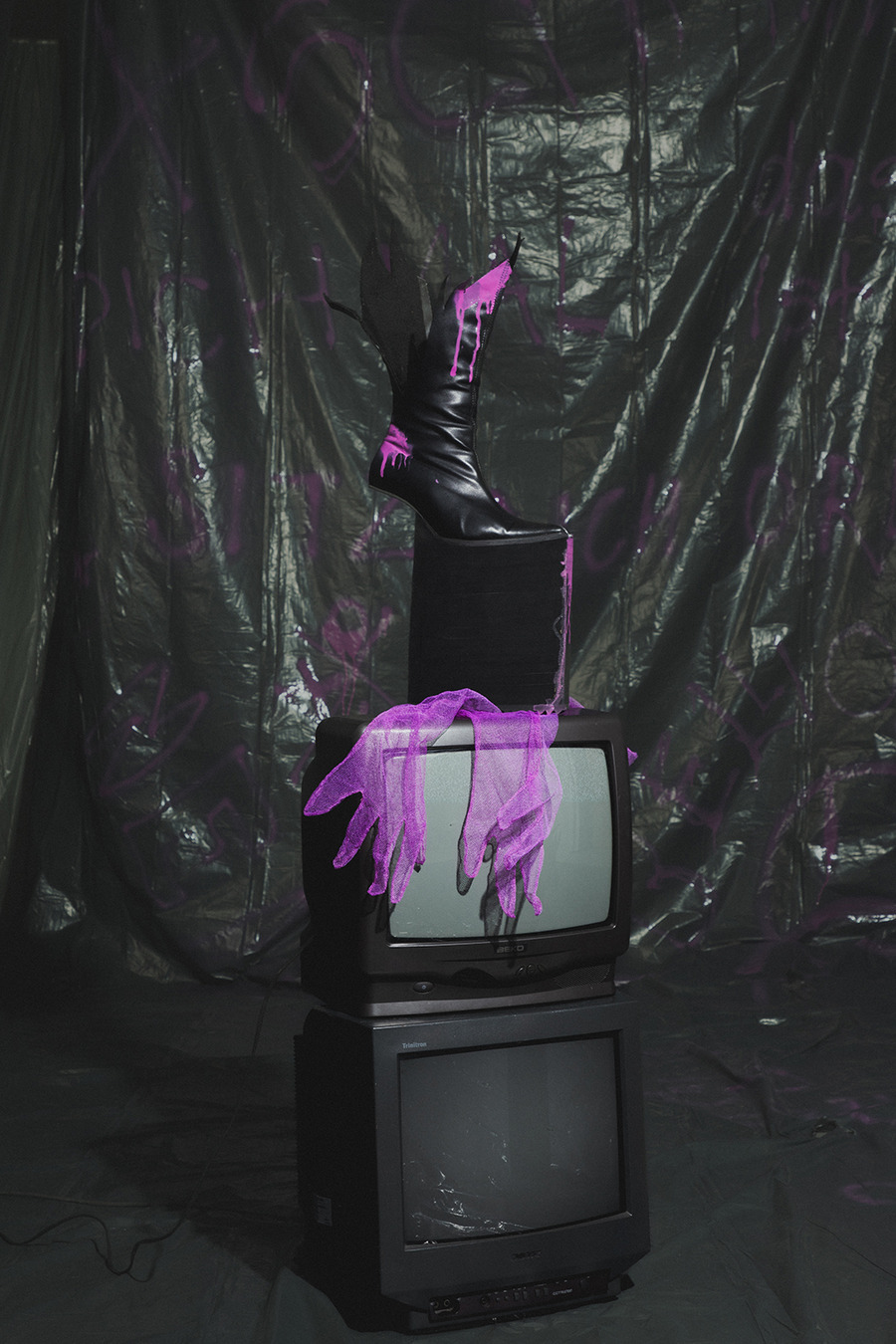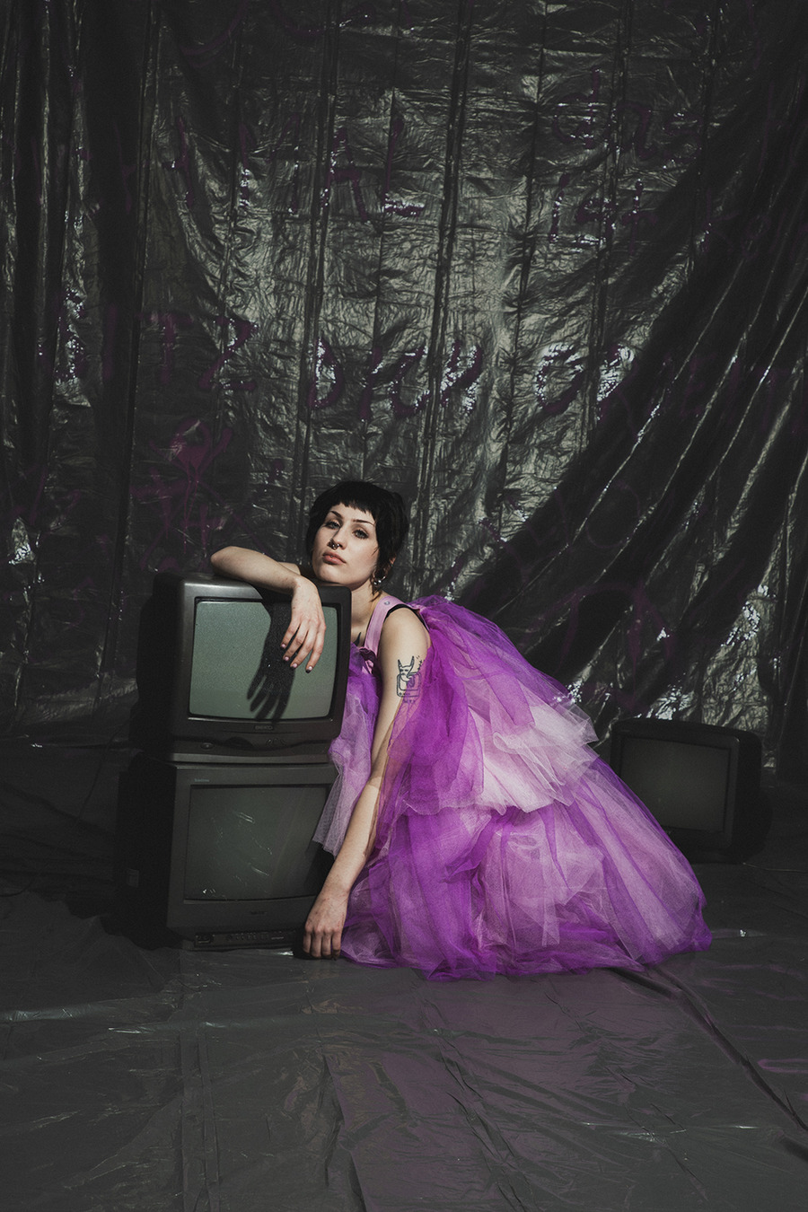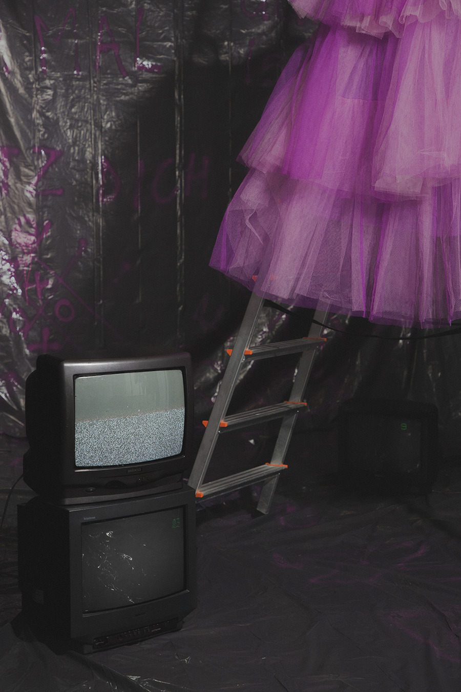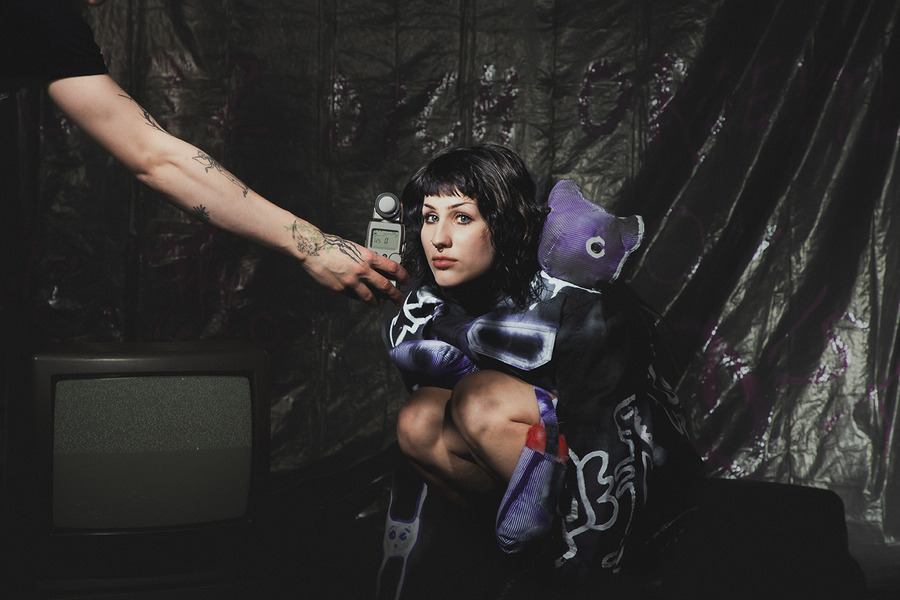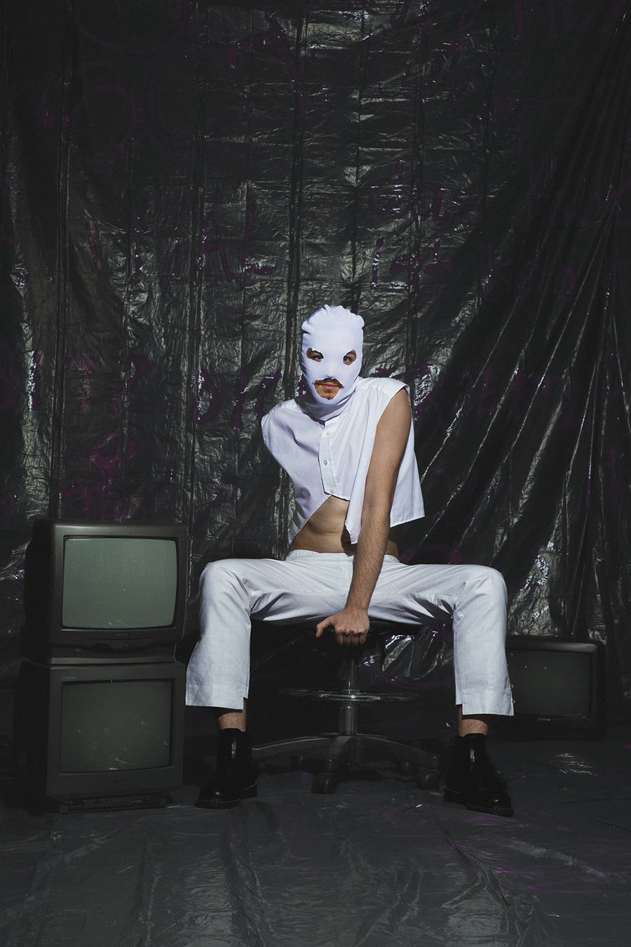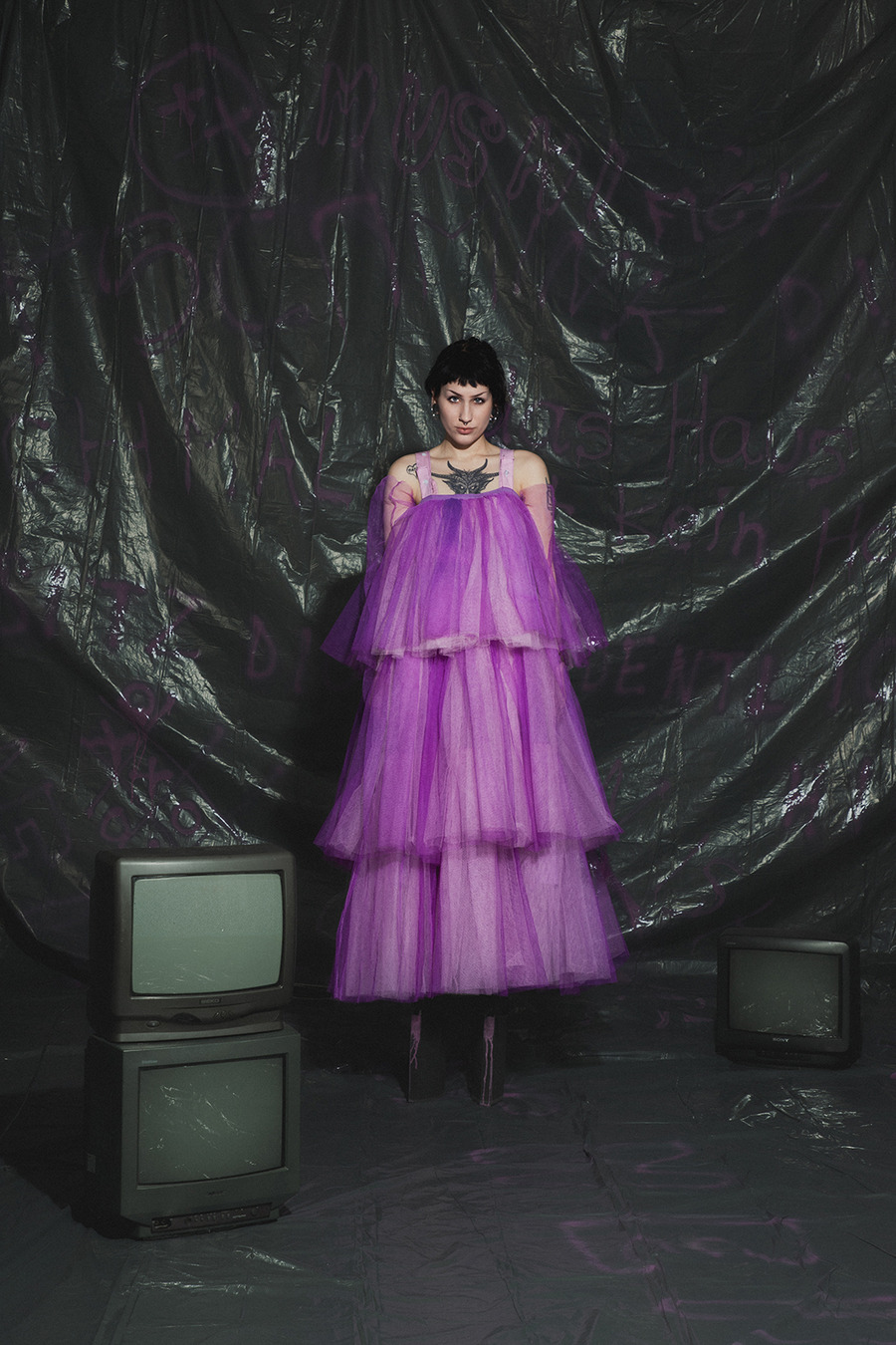 projects by presenting an editorial titled: “Rebellion is freedom!” The inspiration for the collection is Berlin, the capital of rebellion. The first model, dressed in a style inspired by a white basic shirt, is a reflection of the classic arrangement. In combination with a white balaclava hat, his identity is hidden and his intentions are unpredictable. The other model is dressed in an abstract purple form resembling a dress, which gives the impression of a carefree and innocent child emerging from it. In contrast, we can also see a girl wearing a men’s jacket with an asymmetric sleeve, which is inspired by street graffiti found in Berlin. The look is completed with high-platform shoes with purple streaks. The Projects were made at the Academy of Art in Szczecin.”