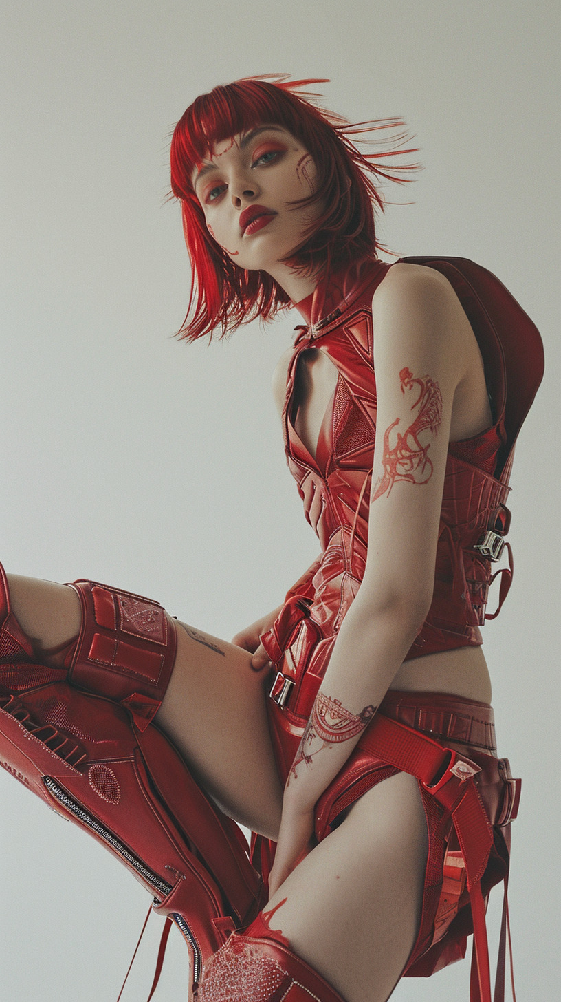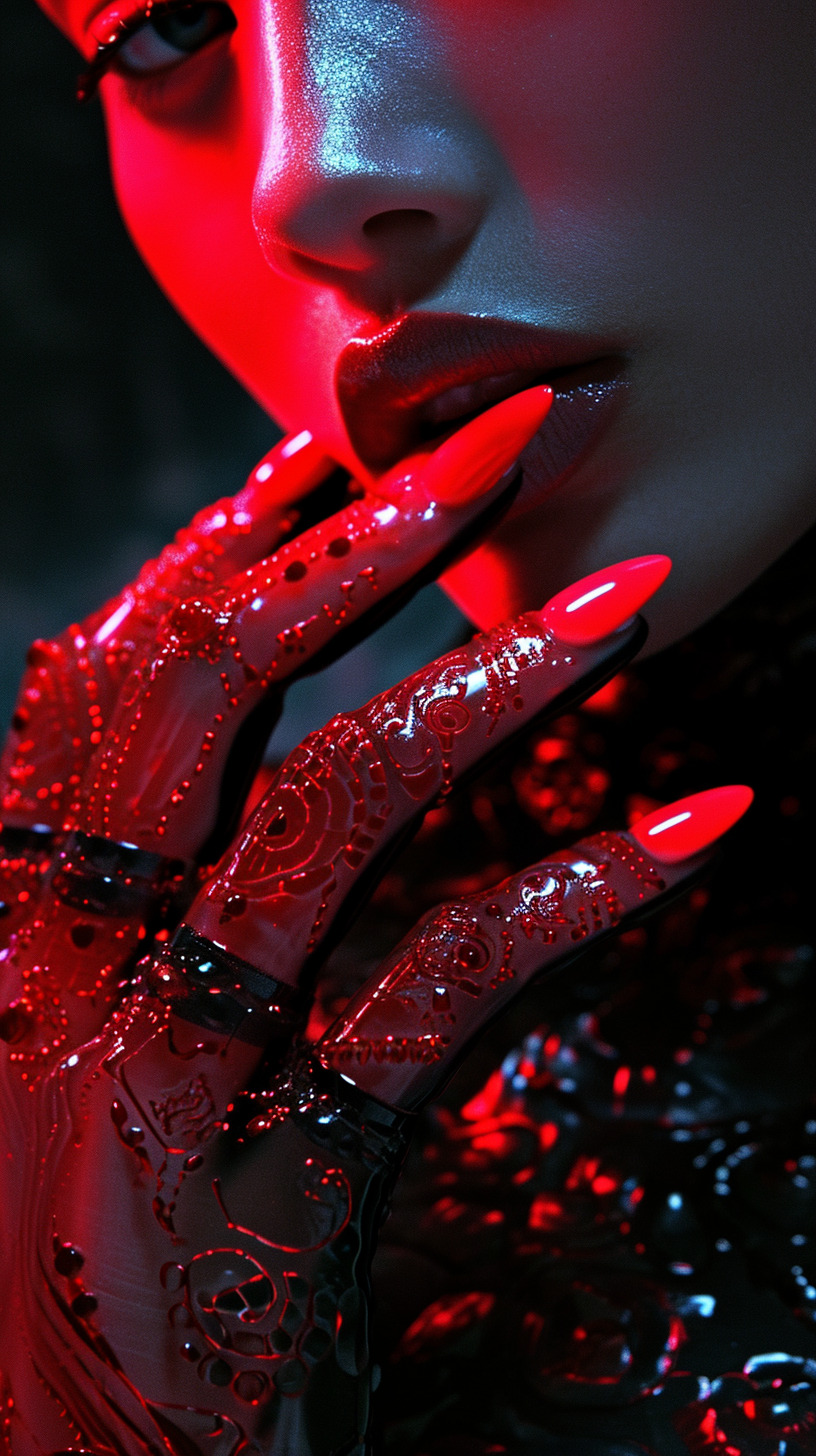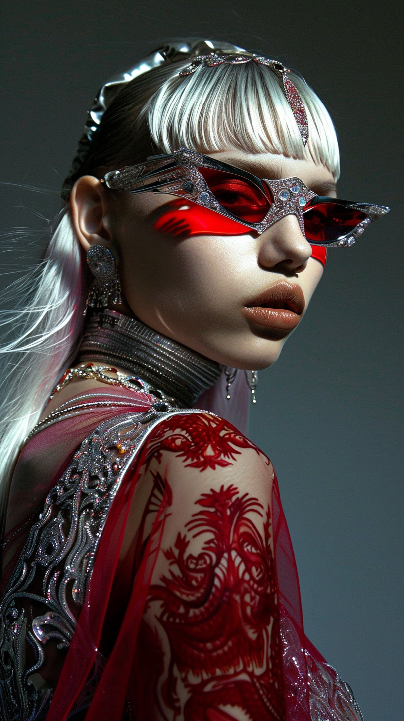 This AI editorial named “Red Dharma” is a visual spell to awaken the sacred. Inspired by Asian folklore and ancient tales, this series is a tribute to deities and entities like Dakinis, shedding light on ancestral traditions like the apsara hand dance. Here, traditional ornaments are rethought with modern styling and imagery.