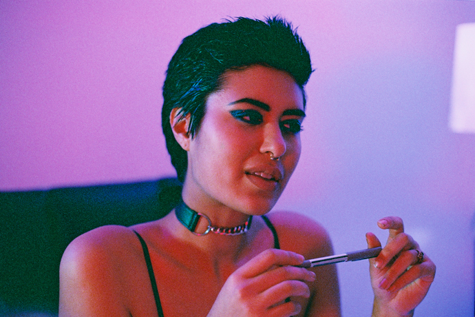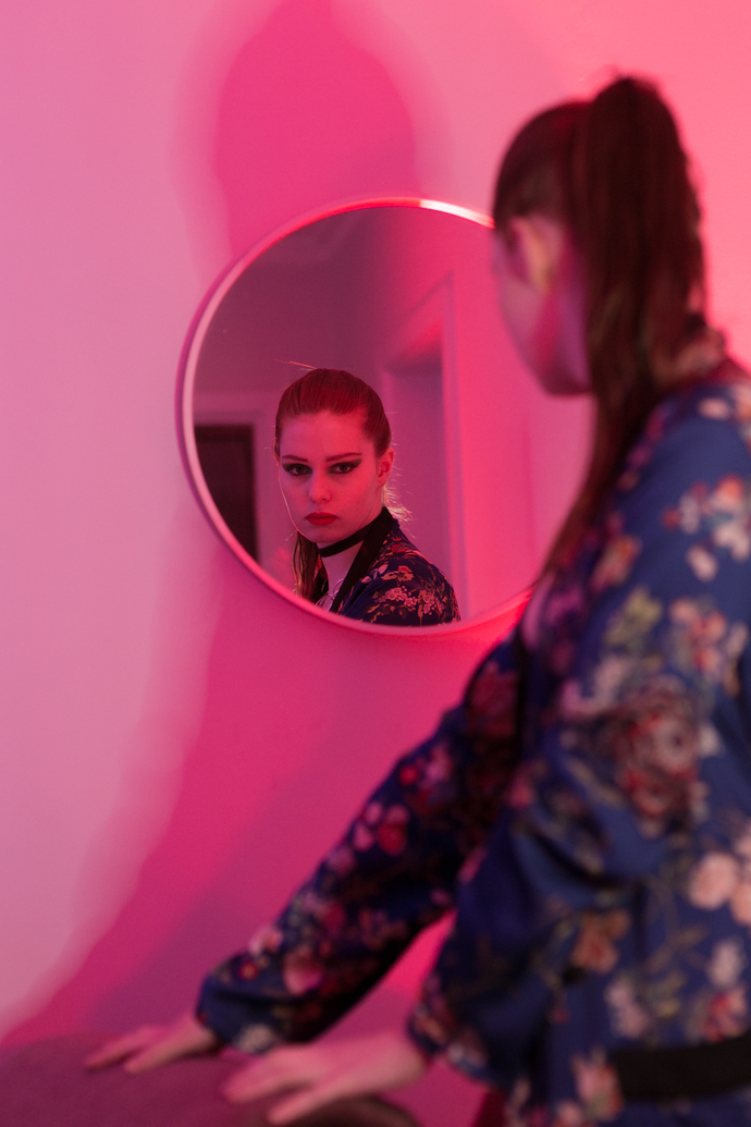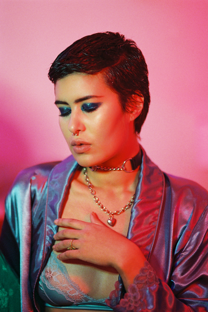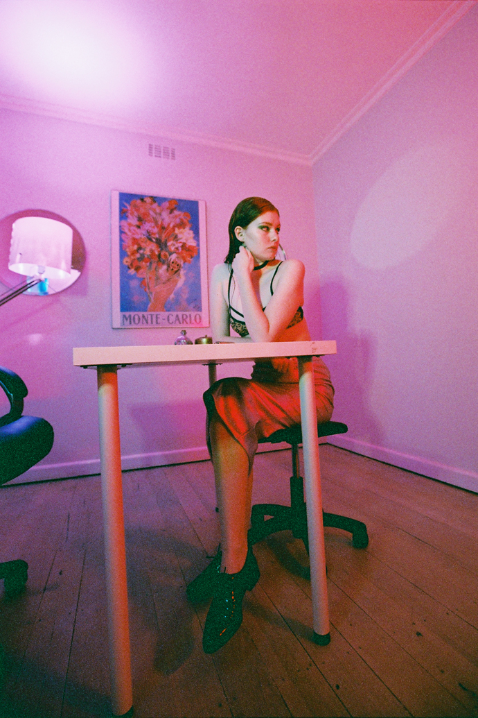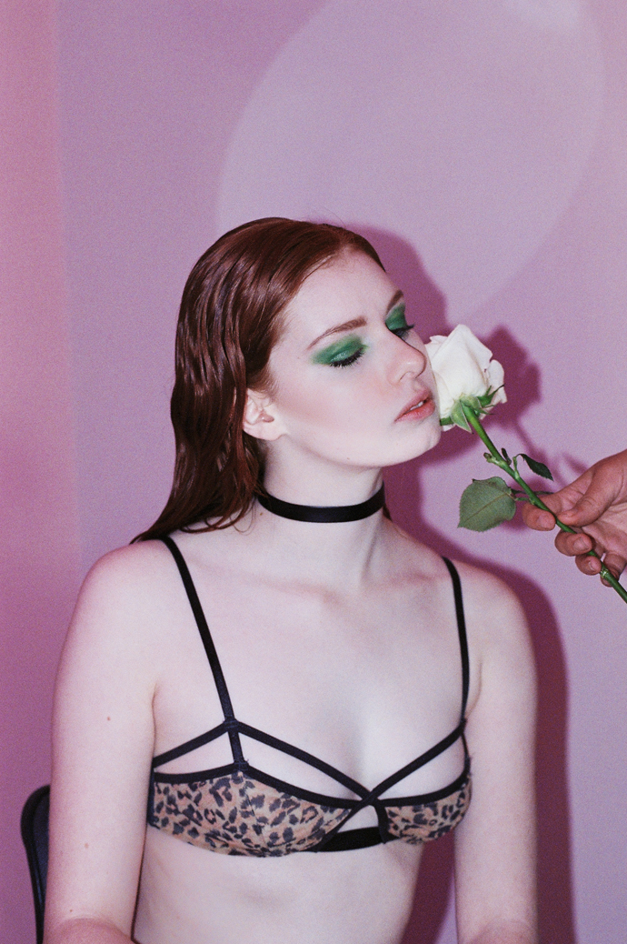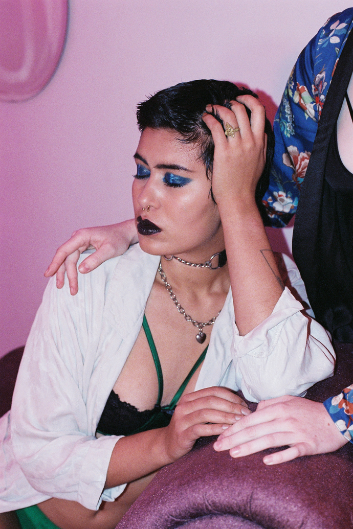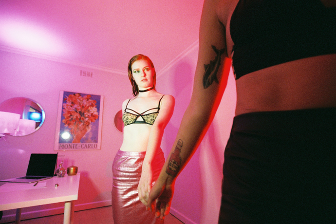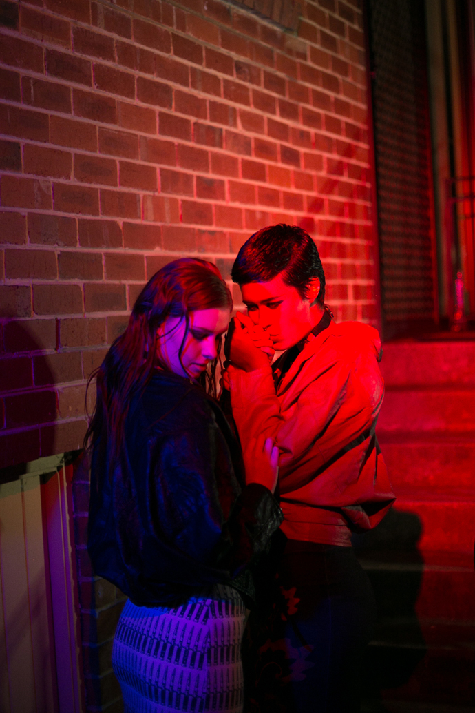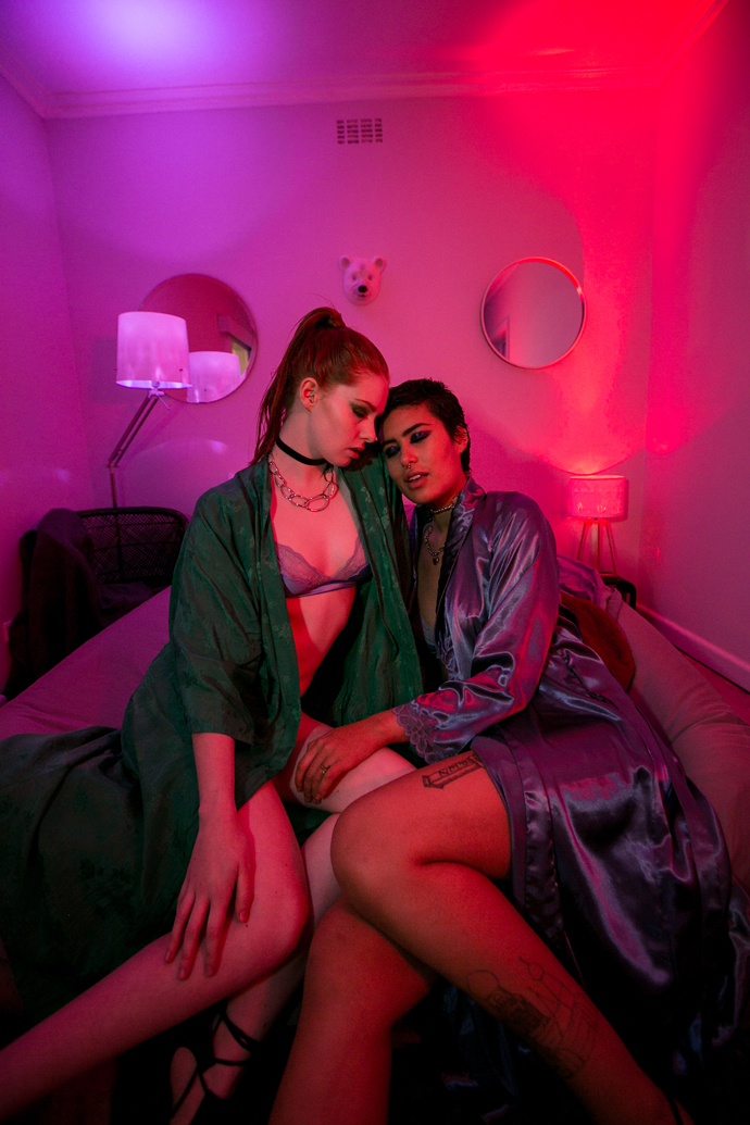 I shot this story in a small room, at the back of my studio, using LED light and red gels. First scene is when the two women meet at an office, then Marilyn takes Luna home. We shot at the back of the building for the street look. Third room is in Marilyn bedroom and fourth is Marilyn’s living room. There is a playful connection between the two. At first we are thinking that Marilyn is takin over Luna, but it’s actually Luna who is in control of this relationship.” says Albalone.