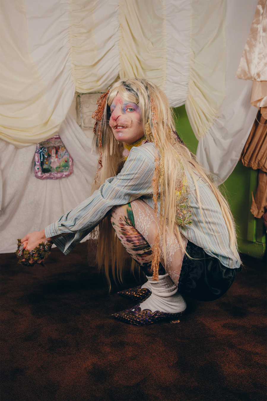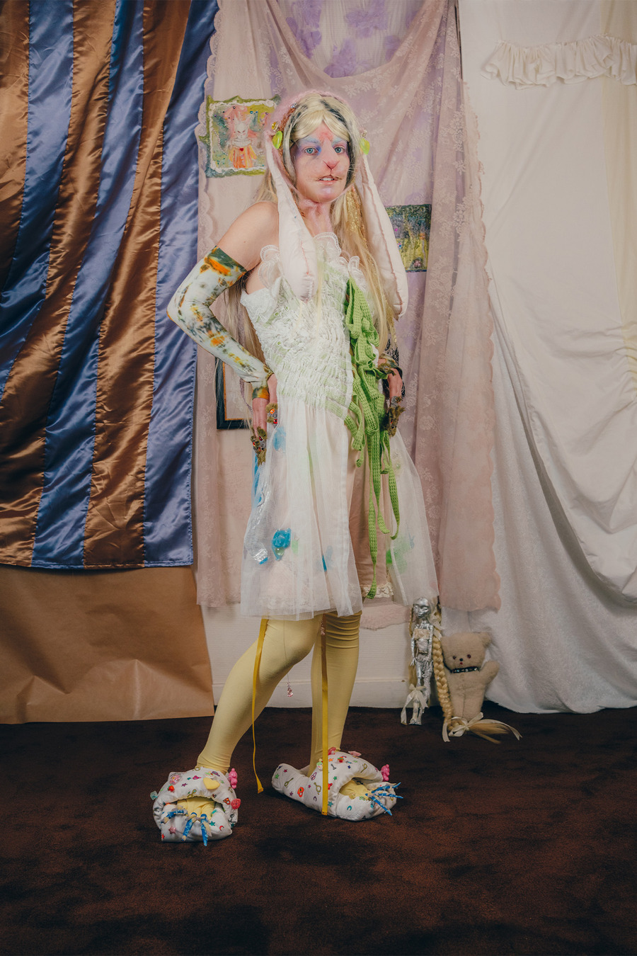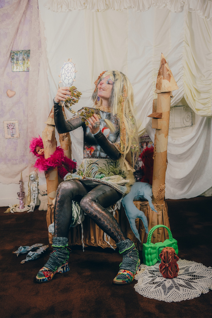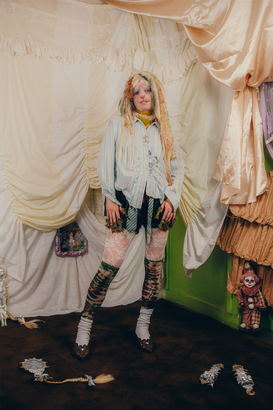 “We are two artistic directors passionate about fashion and arts. We have a fairly similar background having both studied fine arts but in different cities. We currently live in Paris. For this shoot, we wanted to collaborate with two visual artists for the set design. So we called on Polina Martinez aka Kadifé for the stuffed animals and Julia Boniche for the mirror, the doll and the silver shoes.