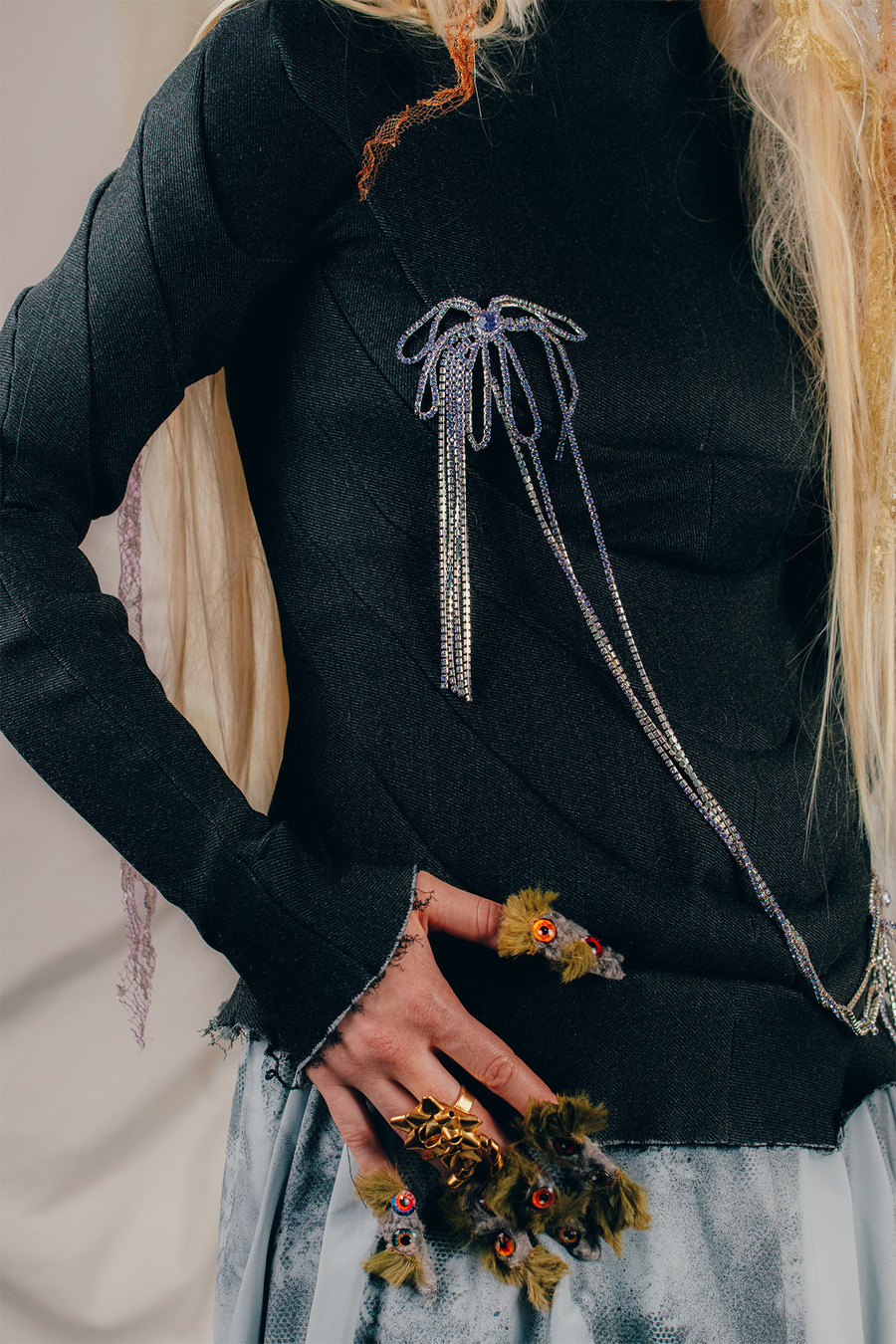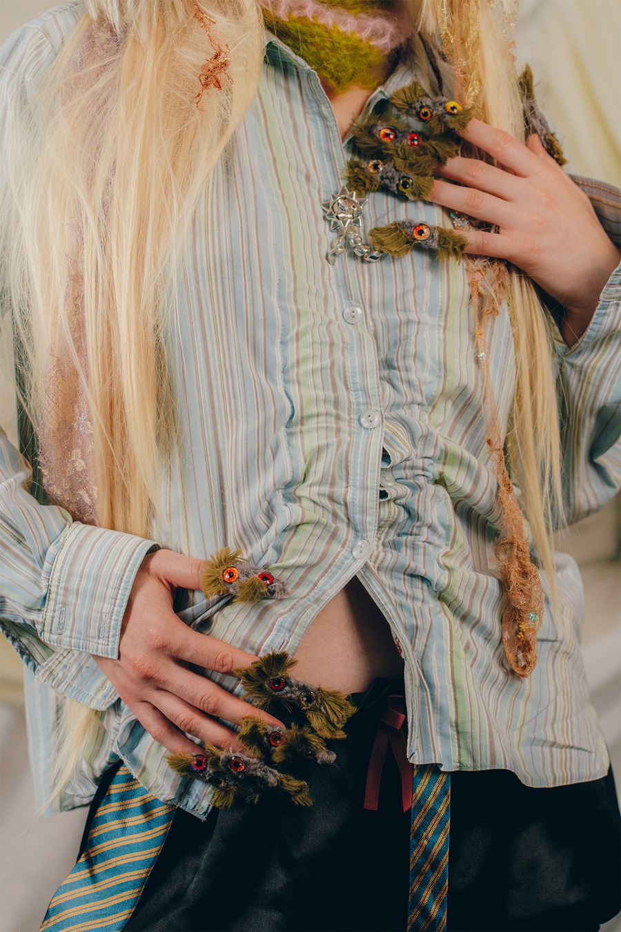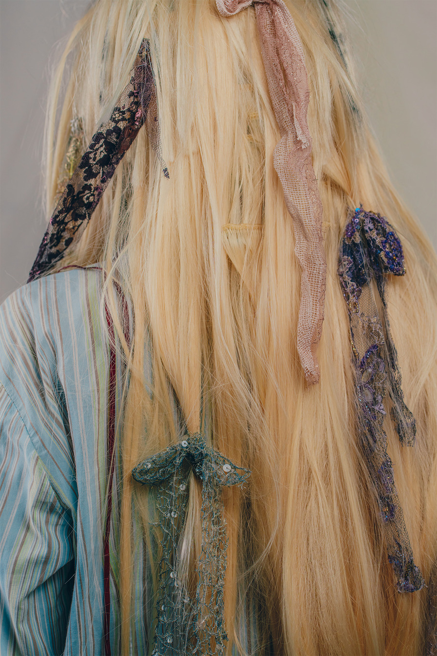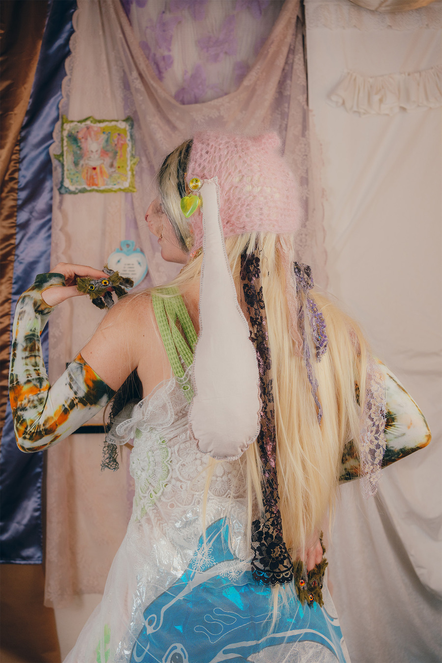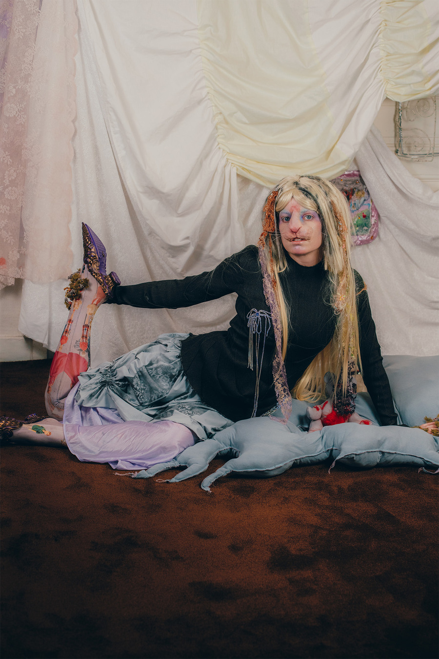 “We are two artistic directors passionate about fashion and arts. We have a fairly similar background having both studied fine arts but in different cities. We currently live in Paris. For this shoot, we wanted to collaborate with two visual artists for the set design. So we called on Polina Martinez aka Kadifé for the stuffed animals and Julia Boniche for the mirror, the doll and the silver shoes.