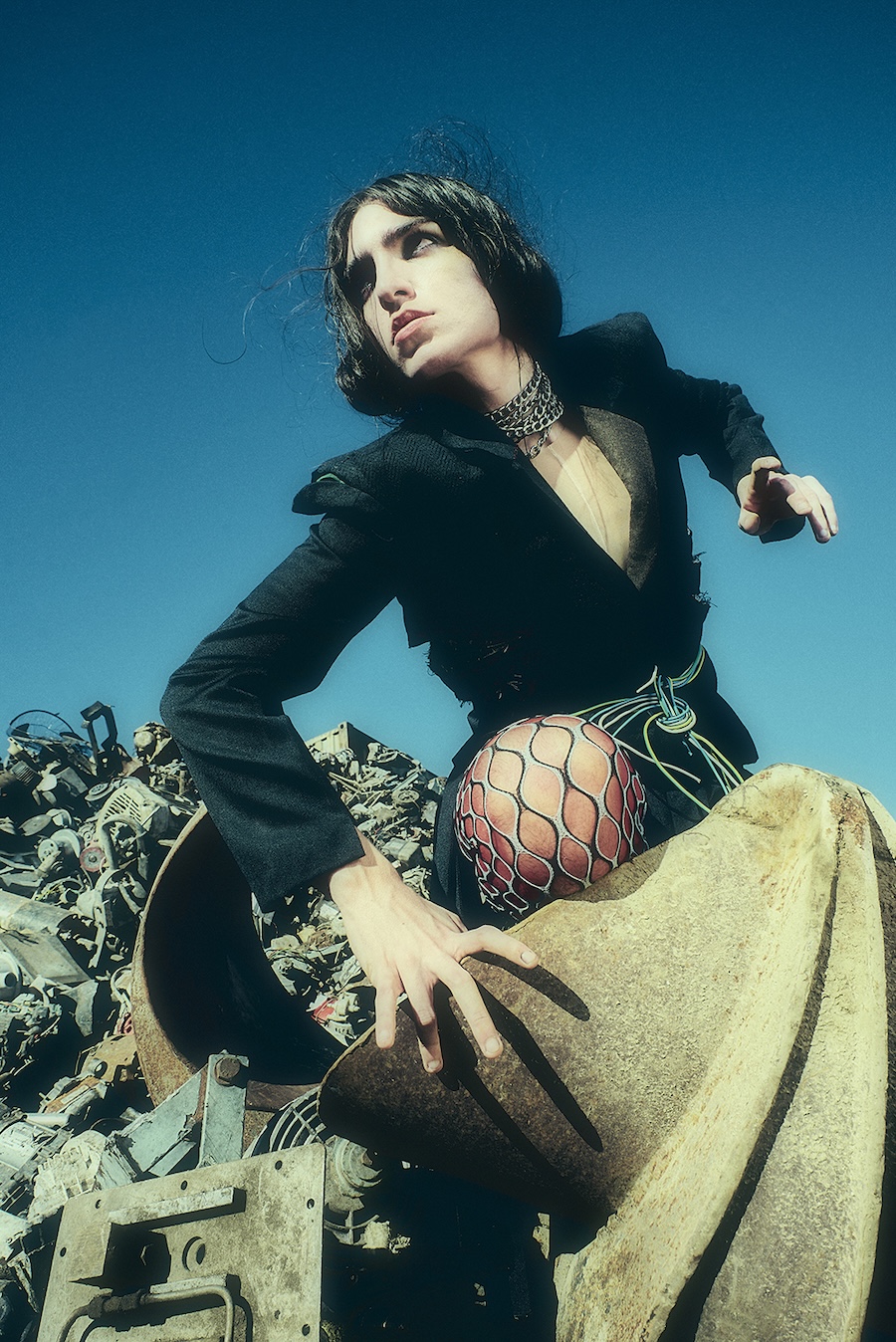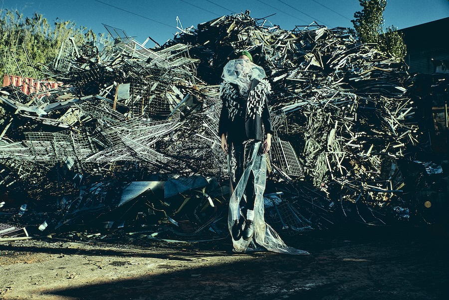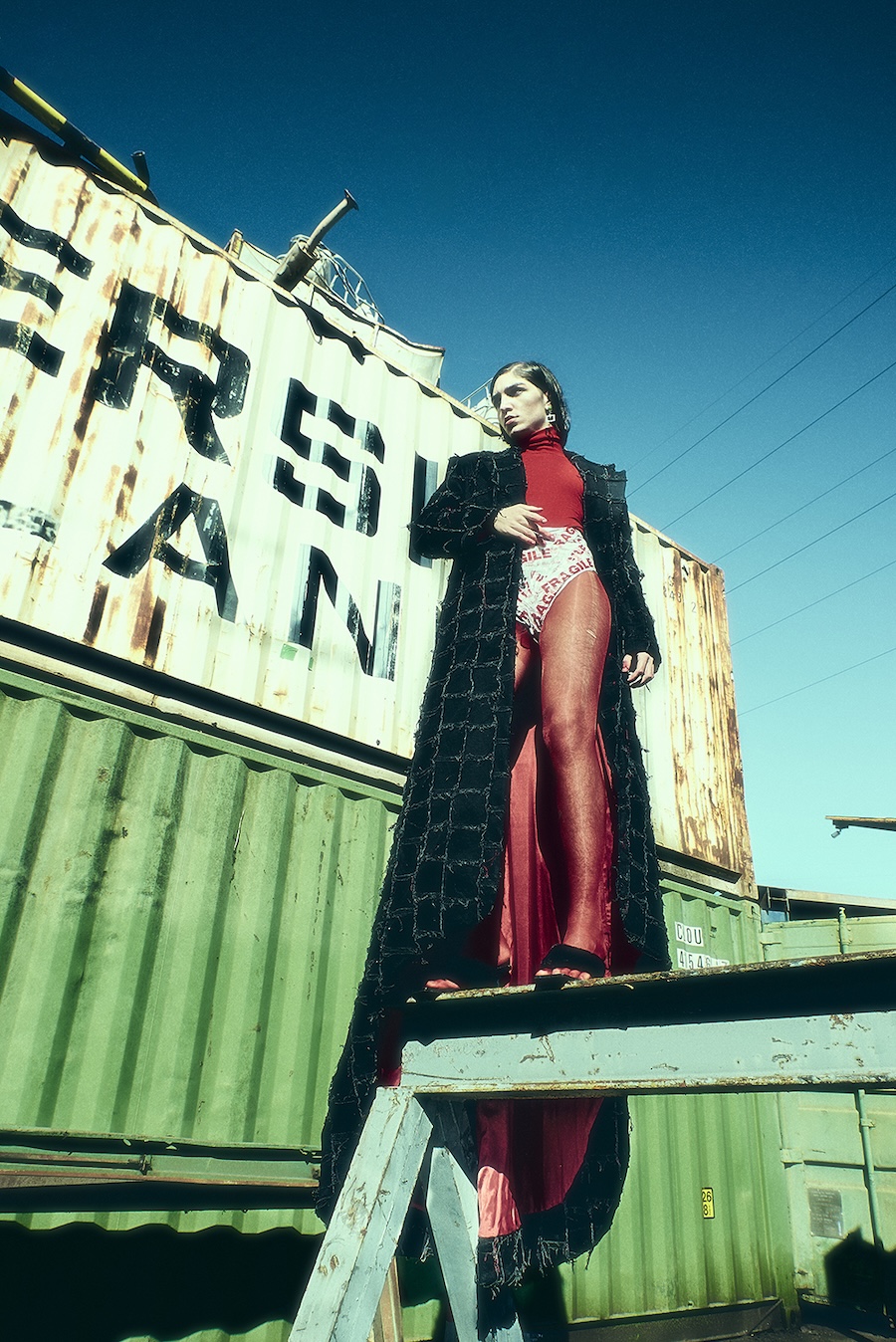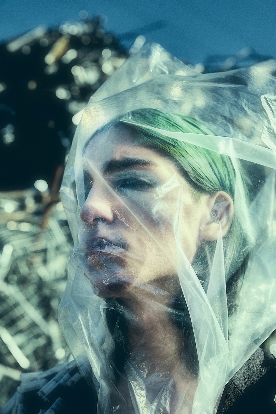 A KALTBLUT exclusive. Photography by Bàrbara Puigventós. Art direction and styling by Elena López. The model is Albert Ballesteros, signed at Agency Le Troch. Makeup by Mar Carrió. Location is Alfametal. Retouched by Sleeklabplus. Brands used are Prada, Galoel, Maison Margiela, Emporio Armani, Calzedonia, Miista, Yproject, Ottolinger, and Marni. Refrankenstein is born from what has been discarded, forgotten, or deemed useless by the world. The collection embodies the essence of the monster: a body composed of fragments, recycled fabrics, and materials brought back to life through visible sutures that celebrate imperfection.