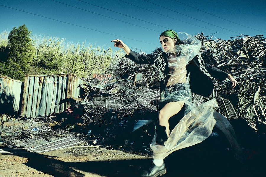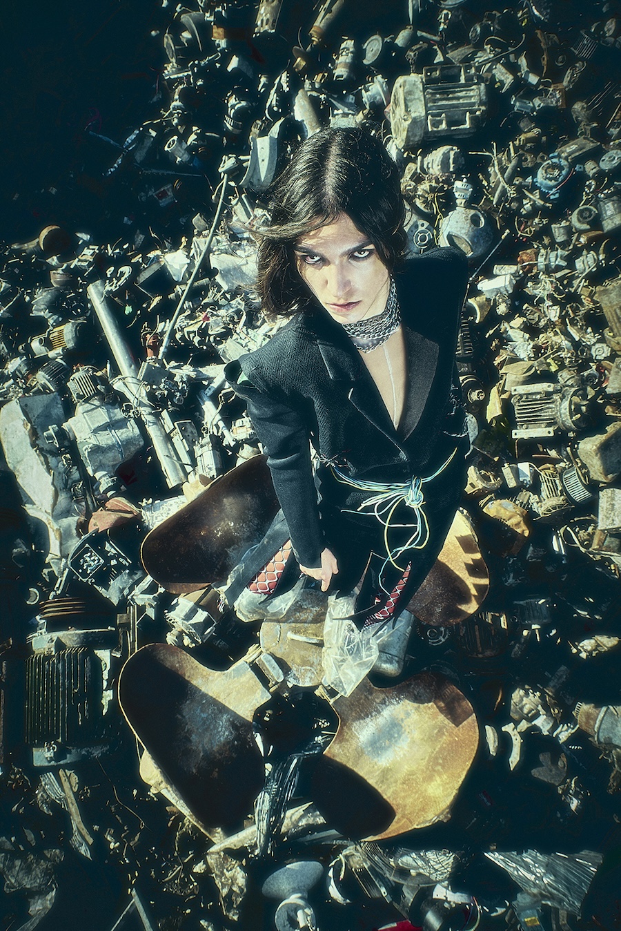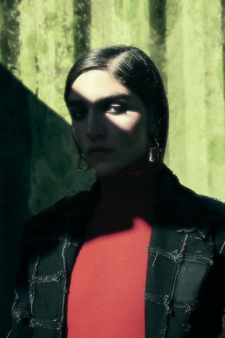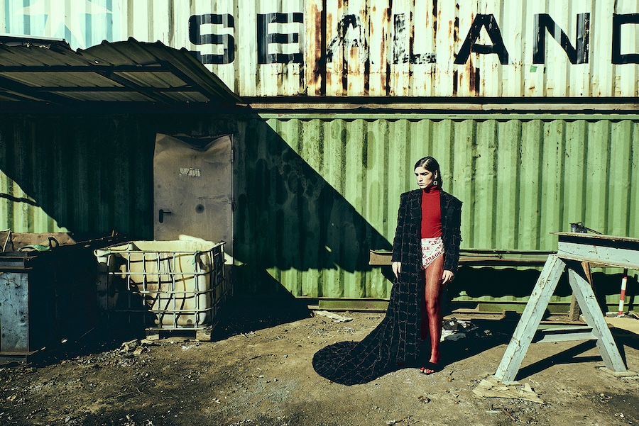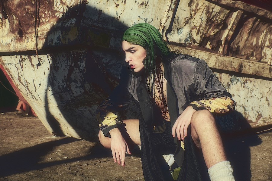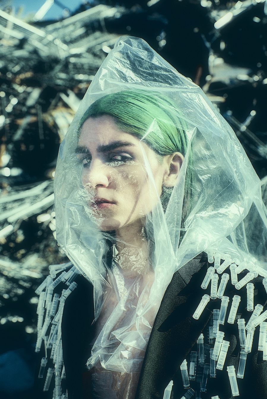 A KALTBLUT exclusive. Photography by Bàrbara Puigventós. Art direction and styling by Elena López. The model is Albert Ballesteros, signed at Agency Le Troch. Makeup by Mar Carrió. Location is Alfametal. Retouched by Sleeklabplus. Brands used are Prada, Galoel, Maison Margiela, Emporio Armani, Calzedonia, Miista, Yproject, Ottolinger, and Marni. Refrankenstein is born from what has been discarded, forgotten, or deemed useless by the world. The collection embodies the essence of the monster: a body composed of fragments, recycled fabrics, and materials brought back to life through visible sutures that celebrate imperfection.
