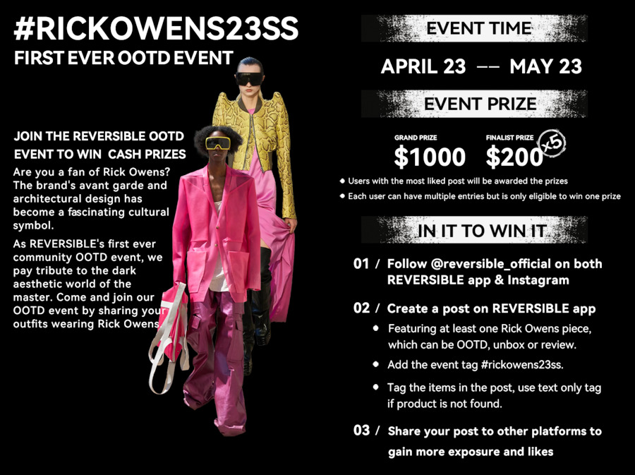 The event paid tribute to the dark aesthetic world of fashion master Rick Owens, who is renowned for his avant-garde, architectural yet minimalist design. Users will have a chance to win $1000 cash prizes by sharing outfits or videos featuring Rick Owens items. For more information and to join the community event, be sure to check out the website or download the app on iOS and Android.