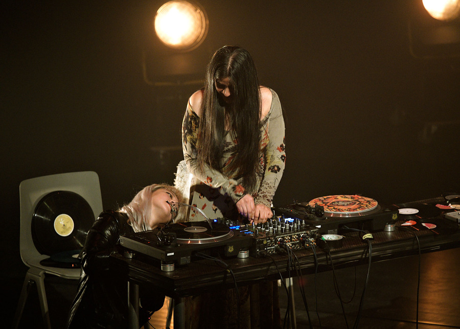 Sunday, April 8th, also the Catholic Eastern Sunday, sound artists, composers, and performers Maria Chavez, Mariam Rezaei, and Victoria Shen shared an innovative affinity for the turntable as an instrument for musical experimentation and improvisation. Internationally renowned for their unique kind of turntablism and a lo-fi form of music making, they were impressed with the world premiere involving a performance set of twelve turntables. The trio used “Needle Nails,” acrylic nails with built-in turntable needles that allow for simultaneous playback of multiple sound sources on the same record, developed by Shen.