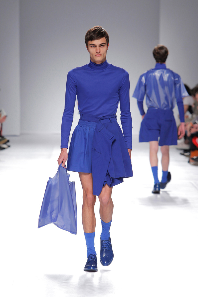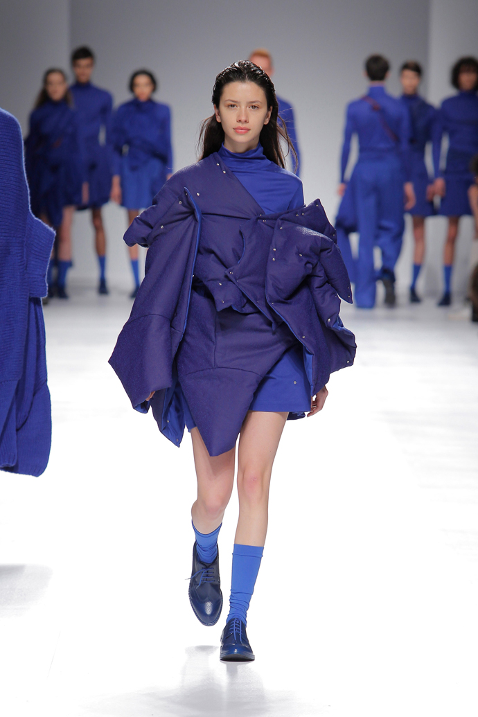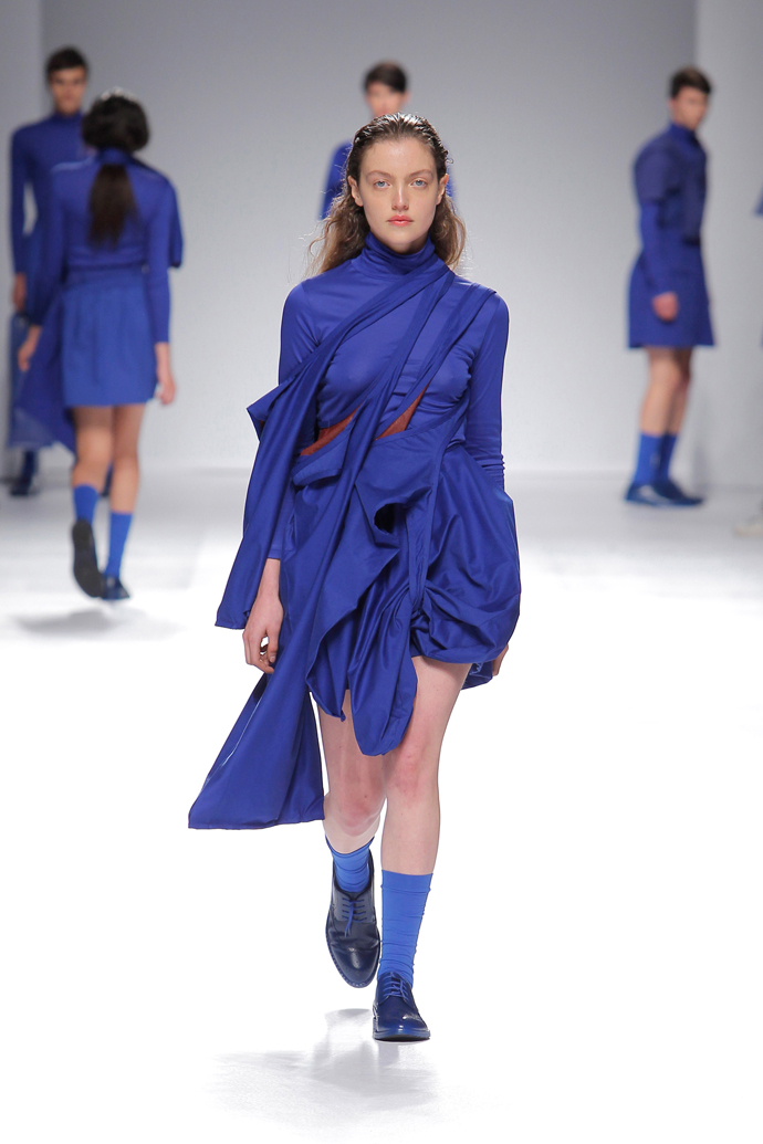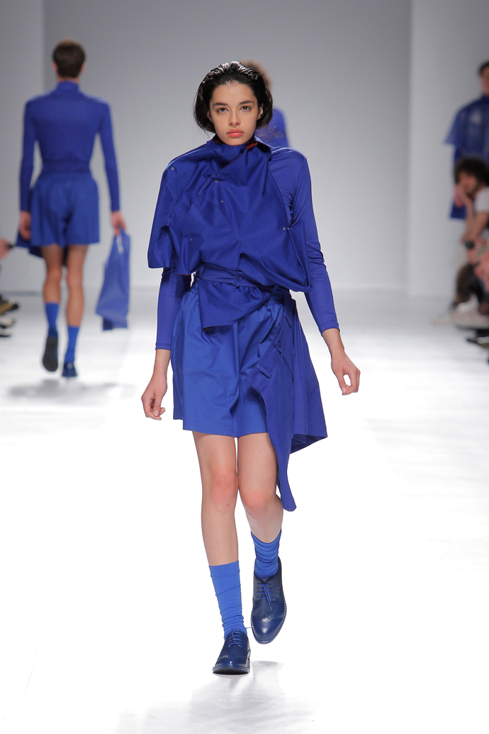 However, what is shown has no real utility and therefore is essentially futile. As we continue, there seems to be a lot of difficulties in controlling the flamboyance created within these individuals and as a result, instead of matching the silhouettes continuous growth, they drop suddenly. New volumes are now supported by small details that still prevail and the vulnerabilities that were hidden until now are completely exposed. The blue colour in the collection references the use of plastic bags, creating the idea of something that is disposable.