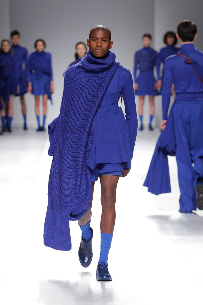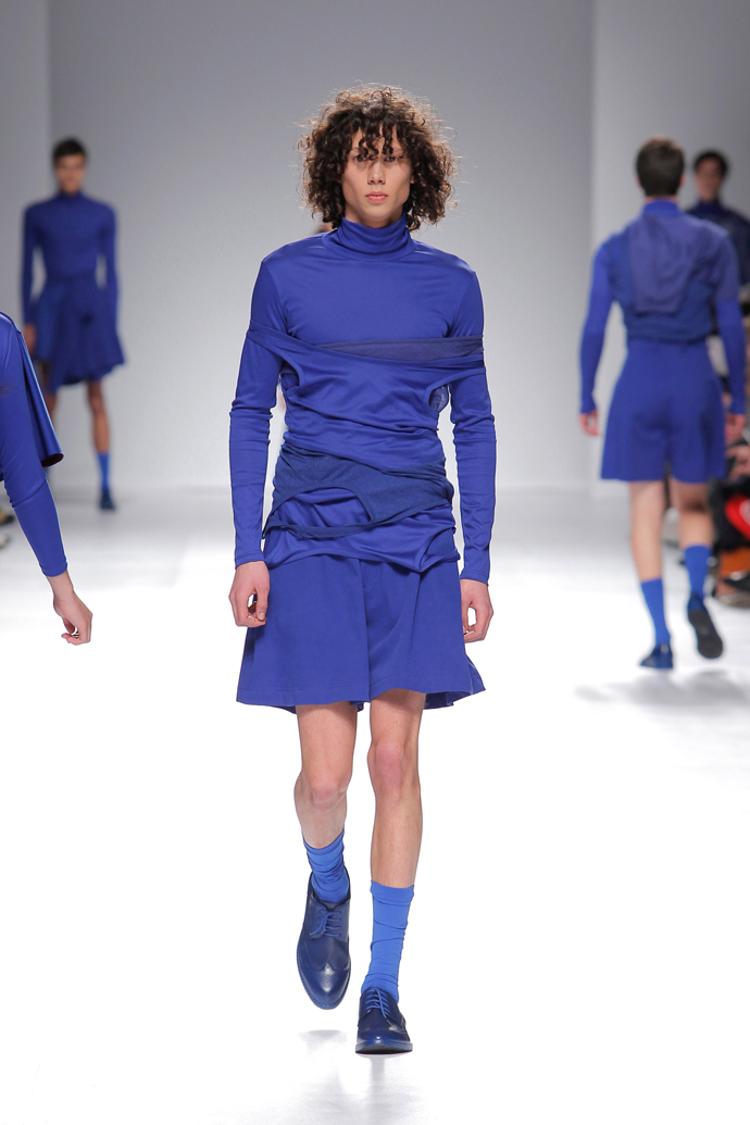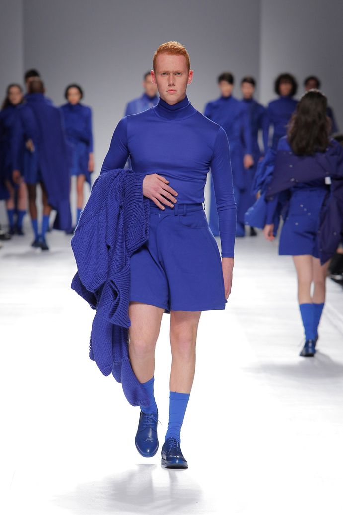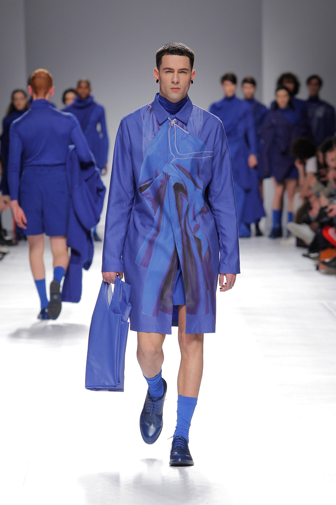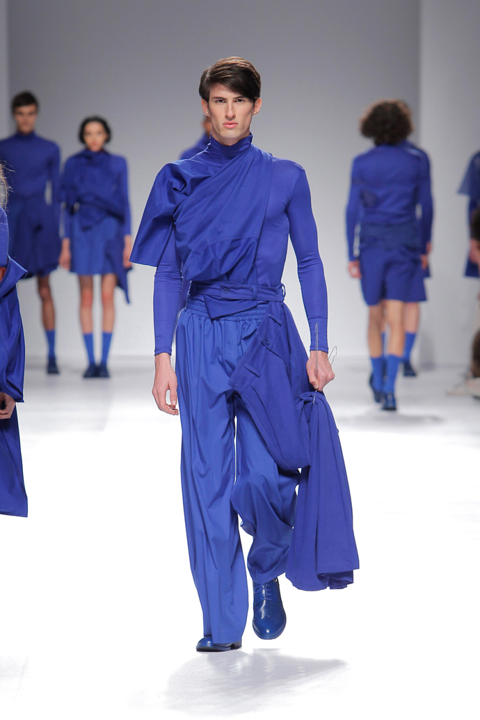 However, what is shown has no real utility and therefore is essentially futile. As we continue, there seems to be a lot of difficulties in controlling the flamboyance created within these individuals and as a result, instead of matching the silhouettes continuous growth, they drop suddenly. New volumes are now supported by small details that still prevail and the vulnerabilities that were hidden until now are completely exposed. The blue colour in the collection references the use of plastic bags, creating the idea of something that is disposable.