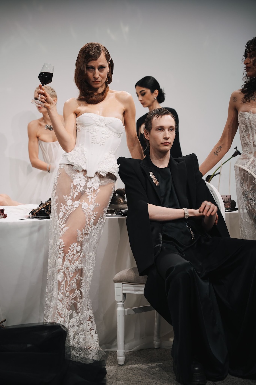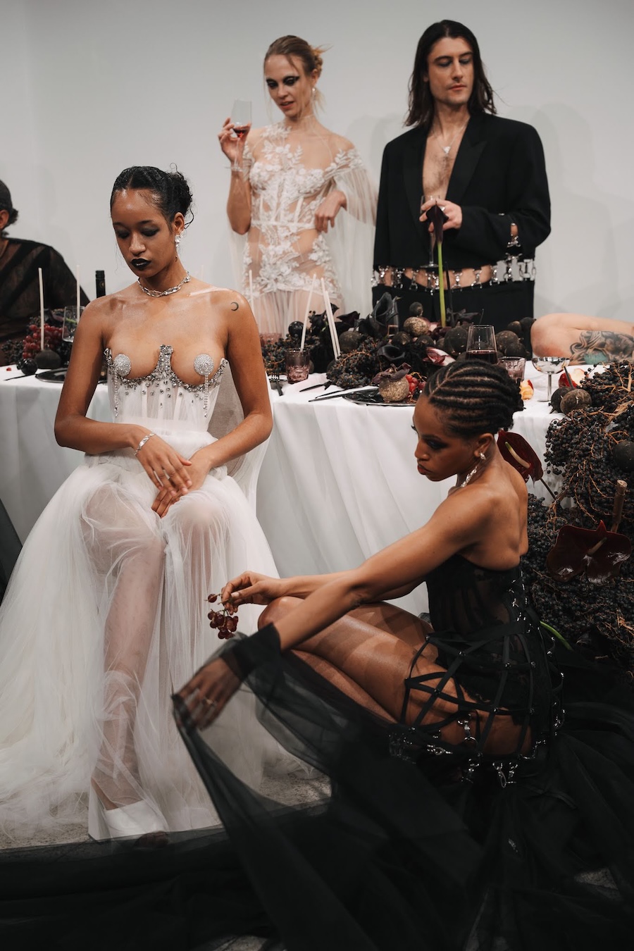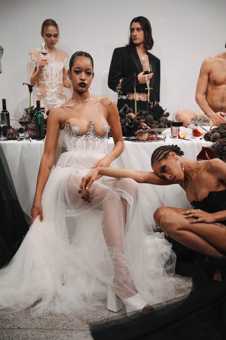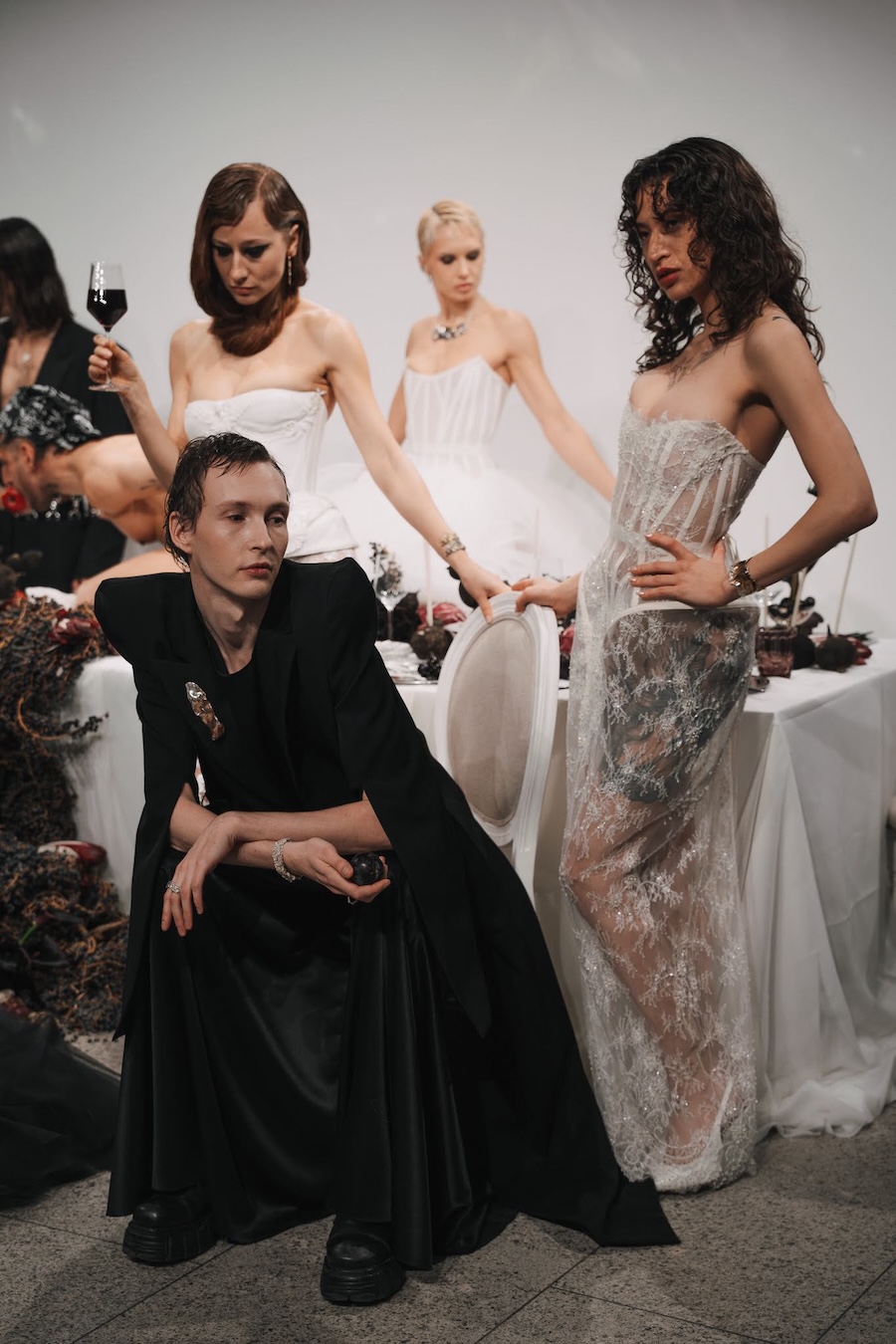 Ritual Unions unveiled their latest collection, a testament to their signature language of post-bridal couture. Expect structured silhouettes intertwined with visible corsetry, sculptural draping, and tactile embellishments that blend ceremonial elegance with a touch of subversive modern flair. Each exquisite look strikes a balance between restraint and exposure, echoing the performance’s core theme: clothing as armour, offering both protection and purposeful revelation of the body.