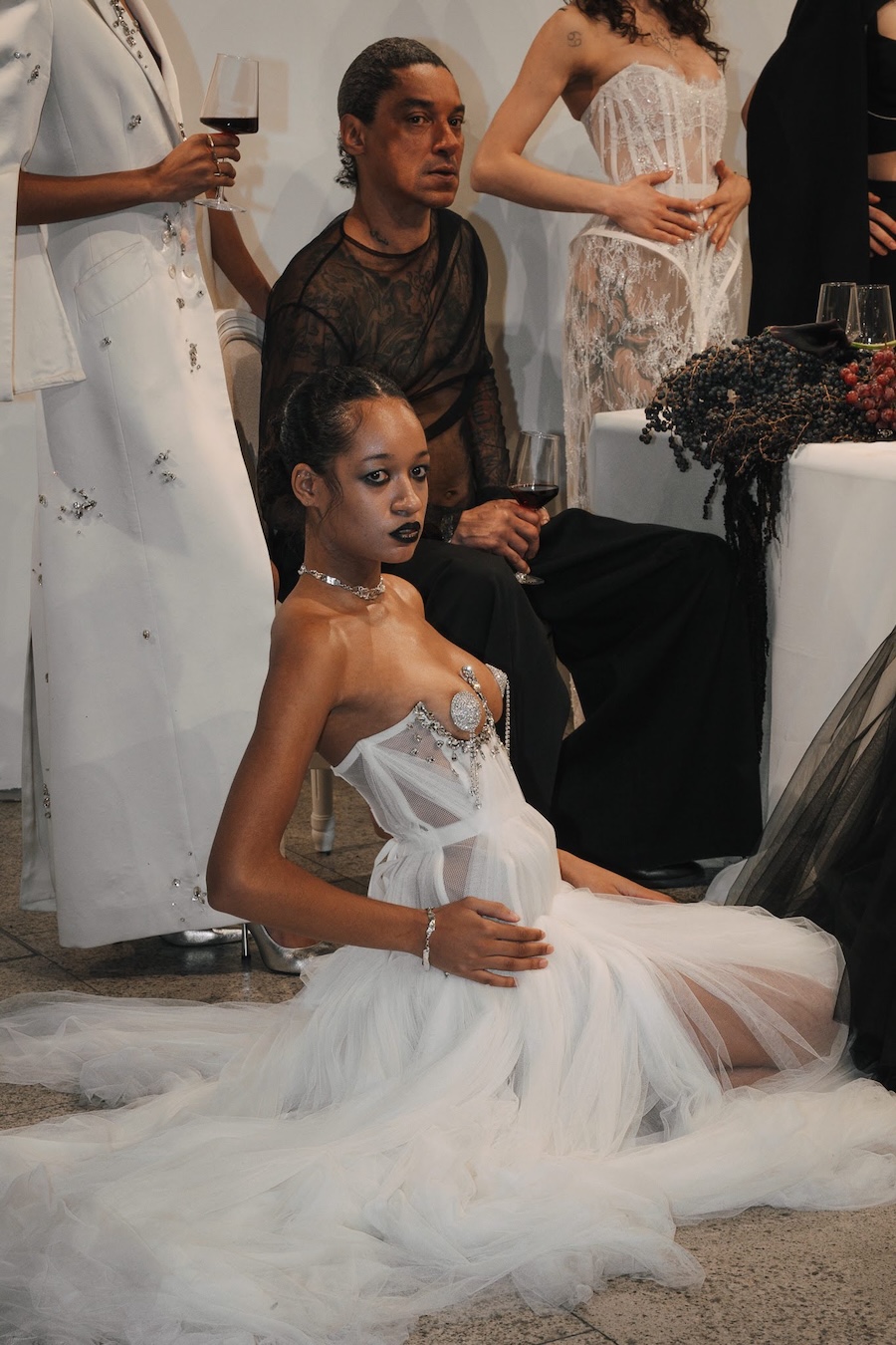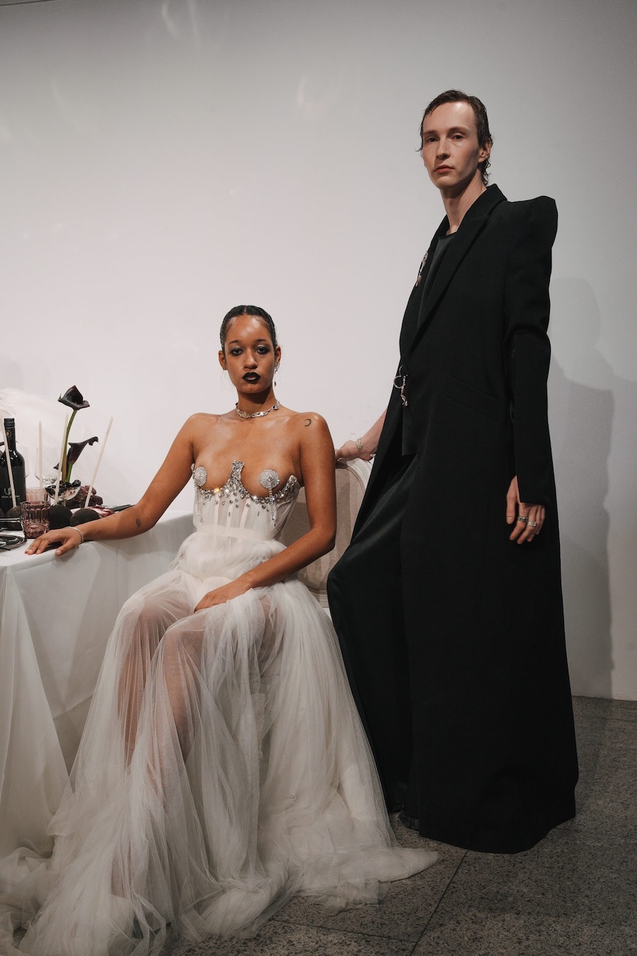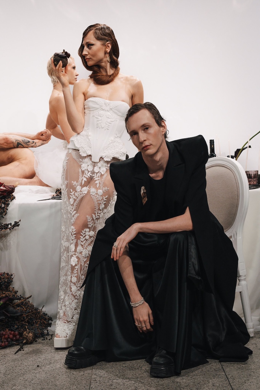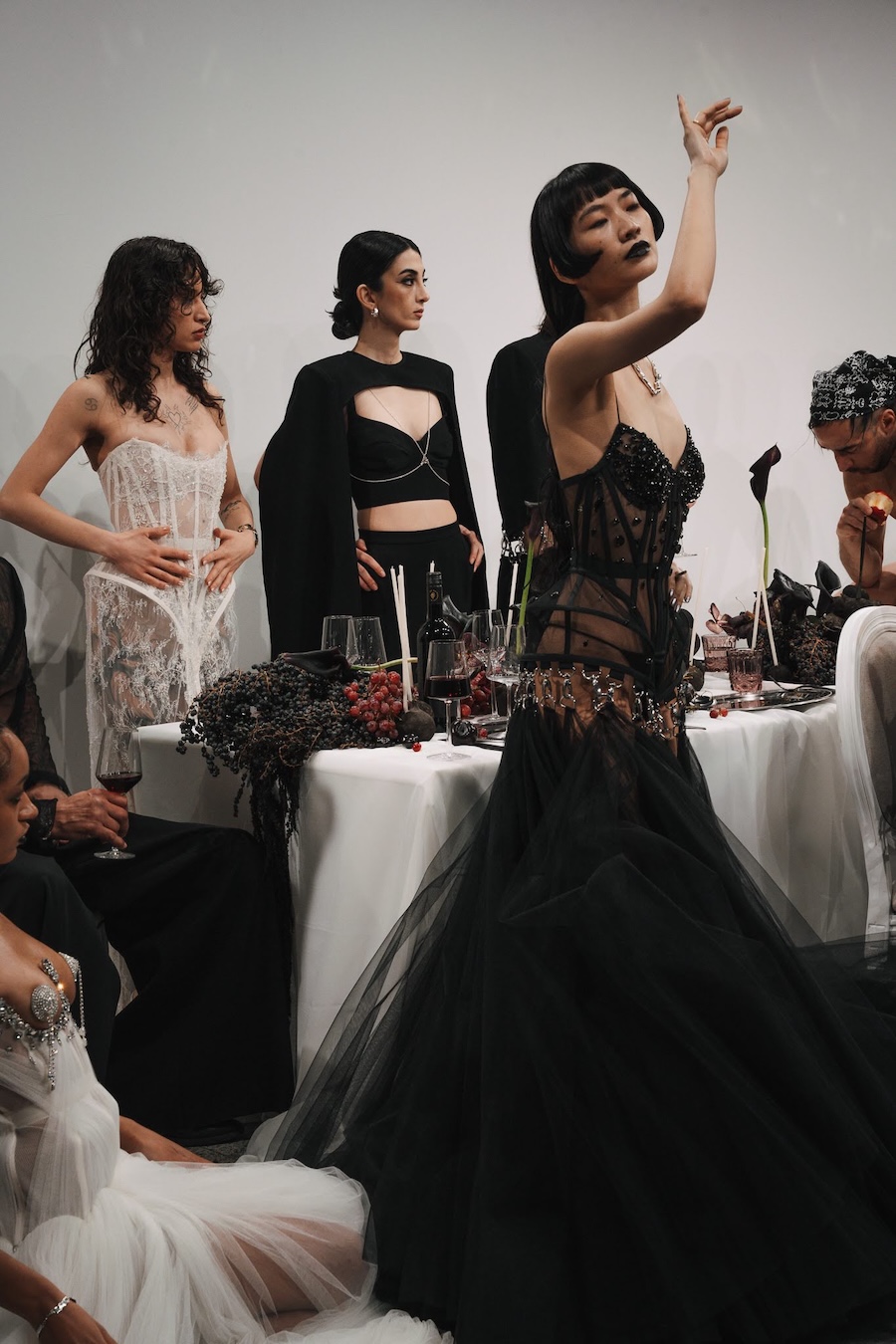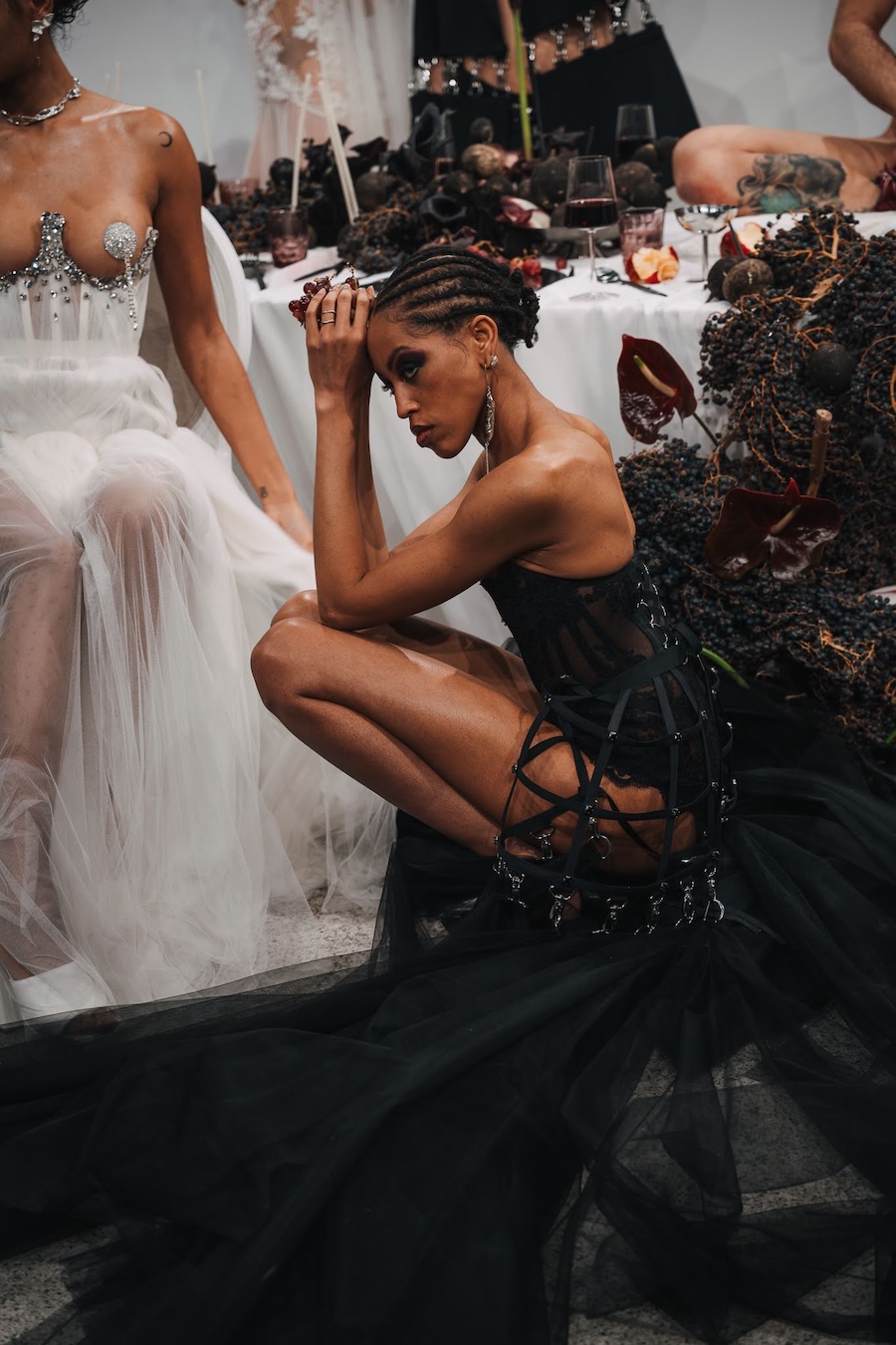Ritual Unions unveiled their latest collection, a testament to their signature language of post-bridal couture. Expect structured silhouettes intertwined with visible corsetry, sculptural draping, and tactile embellishments that blend ceremonial elegance with a touch of subversive modern flair. Each exquisite look strikes a balance between restraint and exposure, echoing the performance’s core theme: clothing as armour, offering both protection and purposeful revelation of the body.