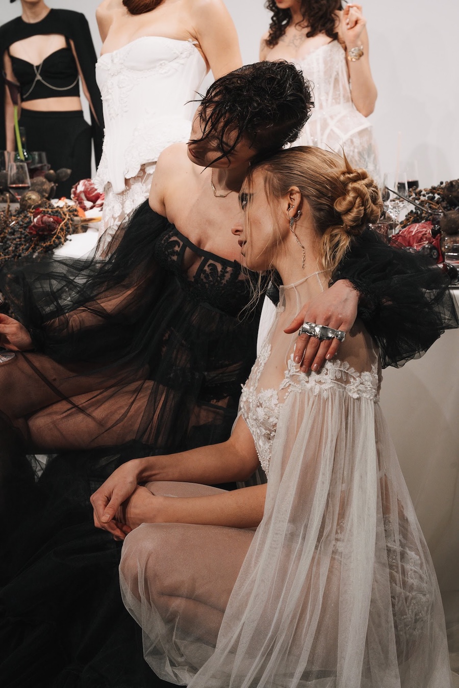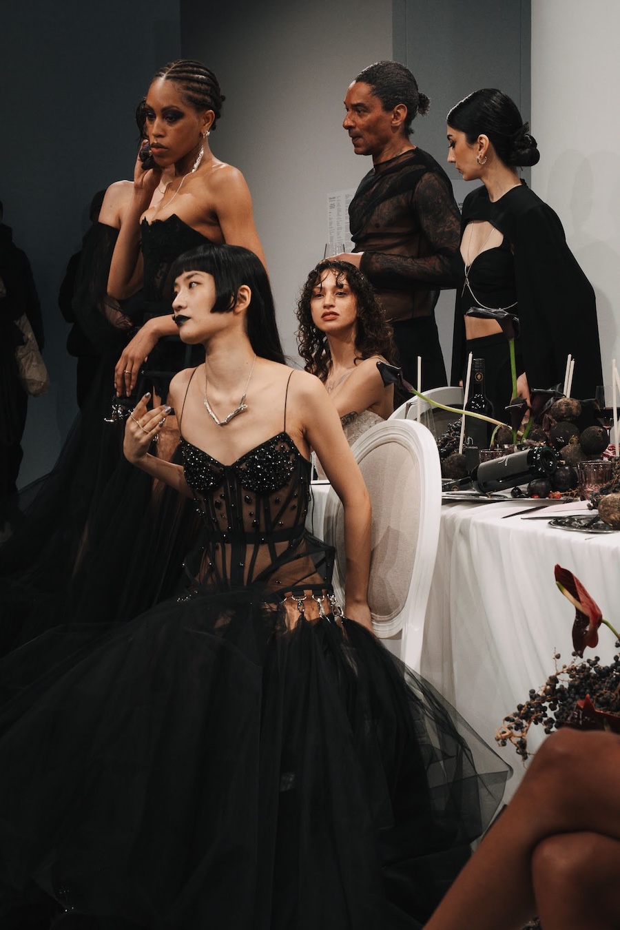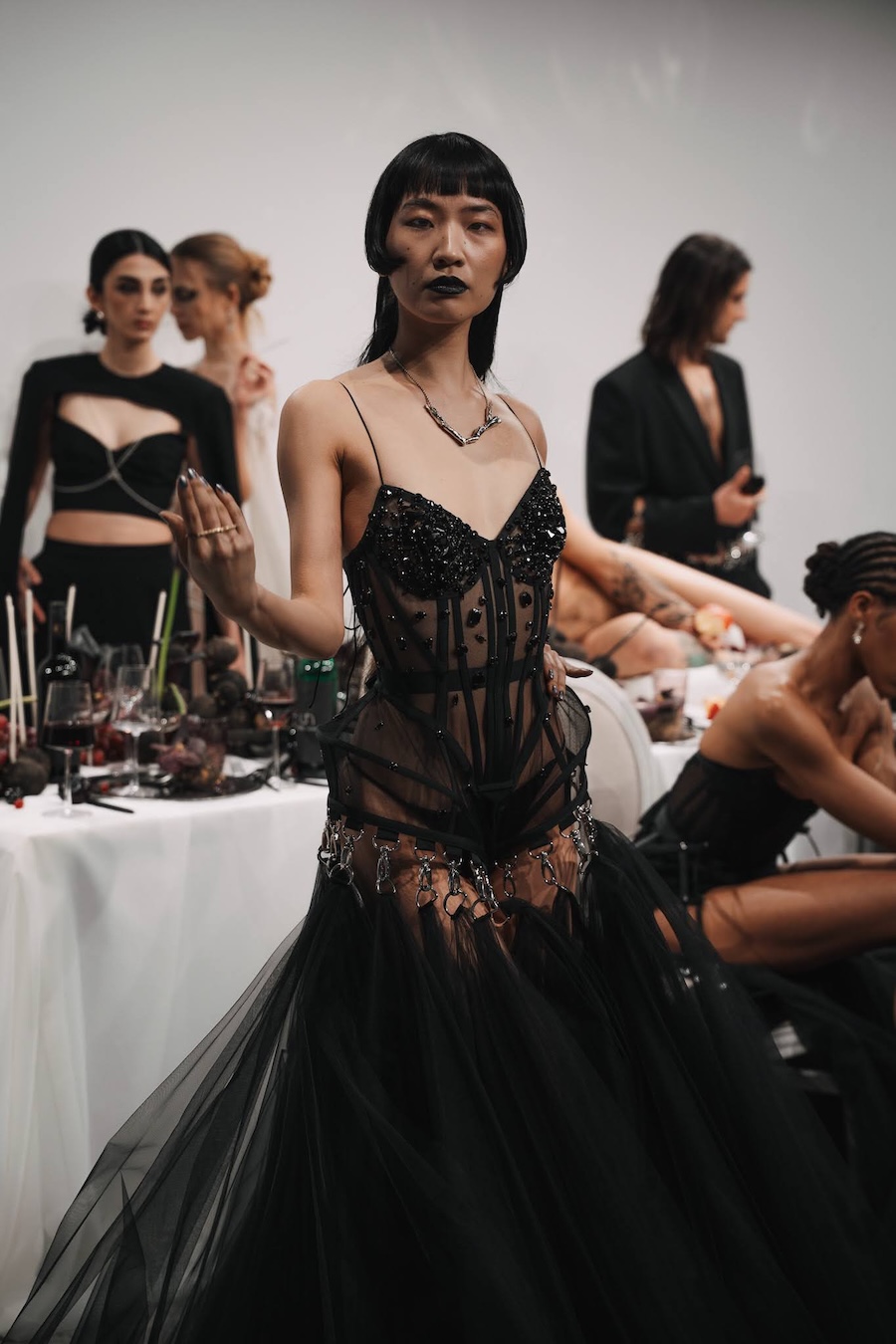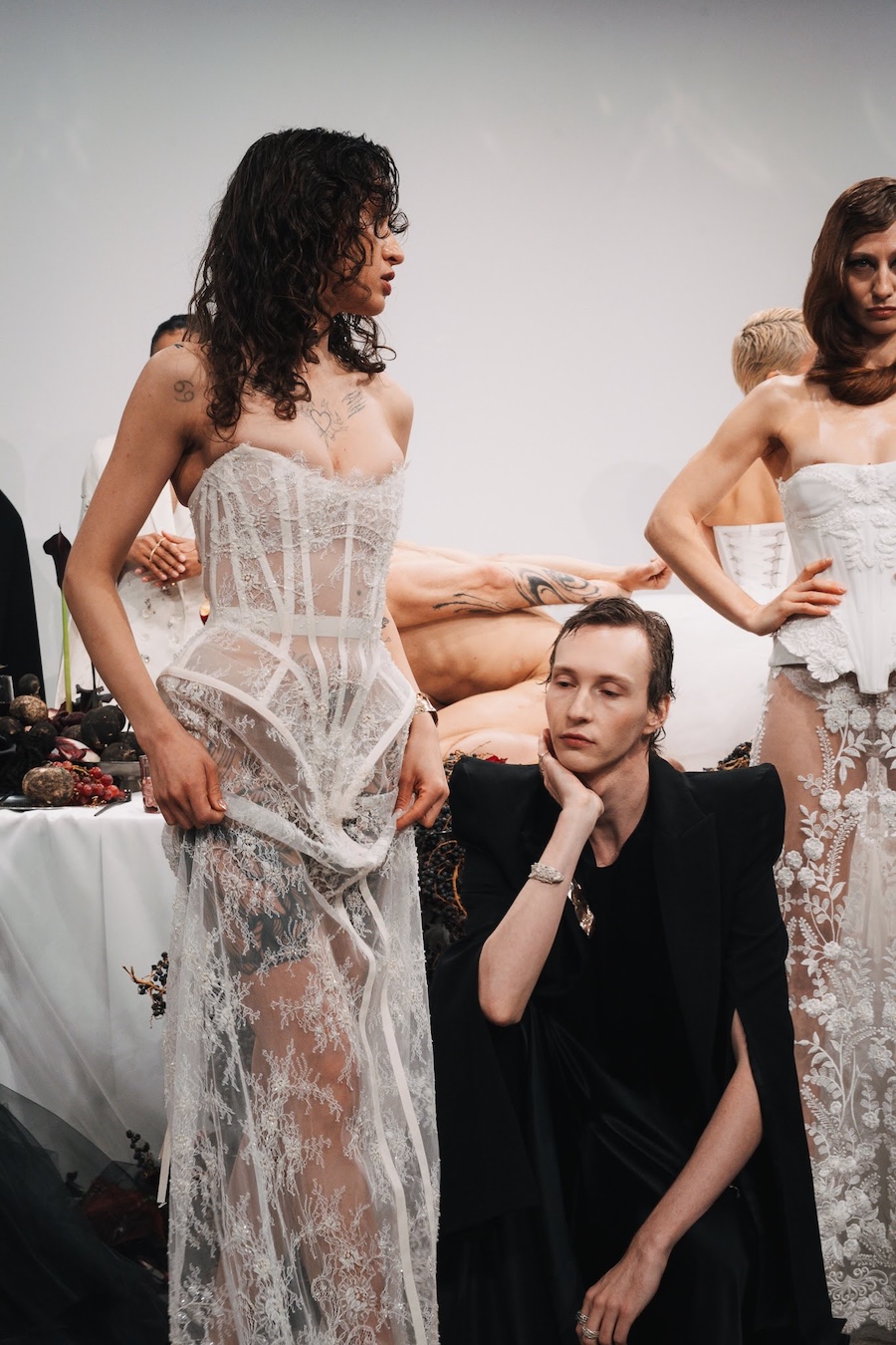 Ritual Unions unveiled their latest collection, a testament to their signature language of post-bridal couture. Expect structured silhouettes intertwined with visible corsetry, sculptural draping, and tactile embellishments that blend ceremonial elegance with a touch of subversive modern flair. Each exquisite look strikes a balance between restraint and exposure, echoing the performance’s core theme: clothing as armour, offering both protection and purposeful revelation of the body.