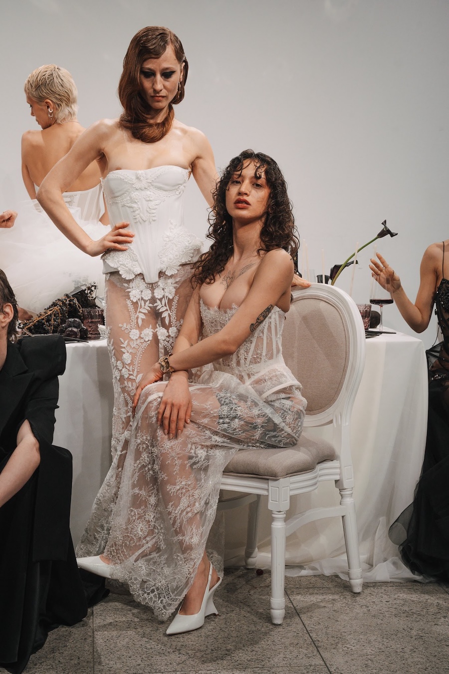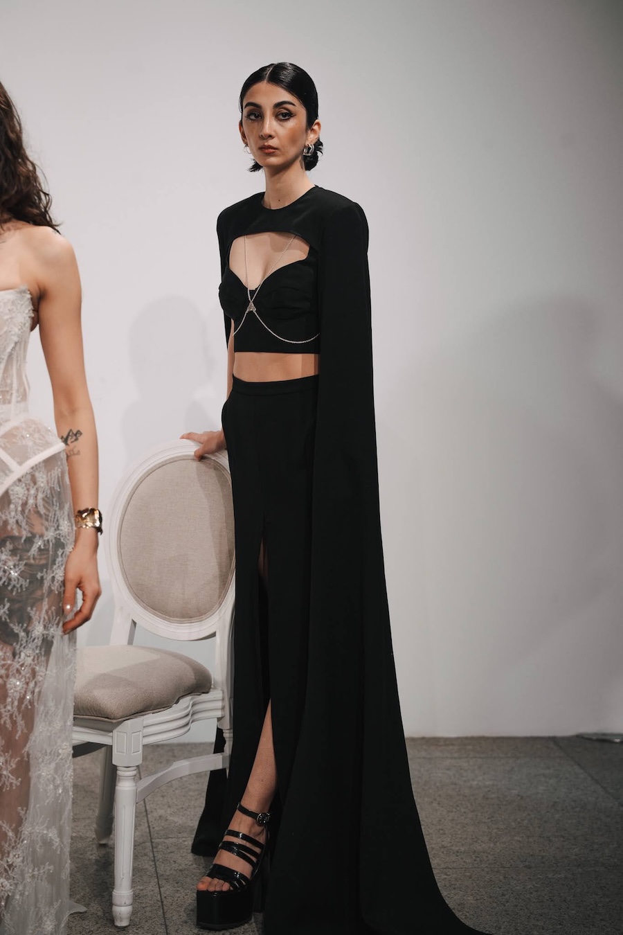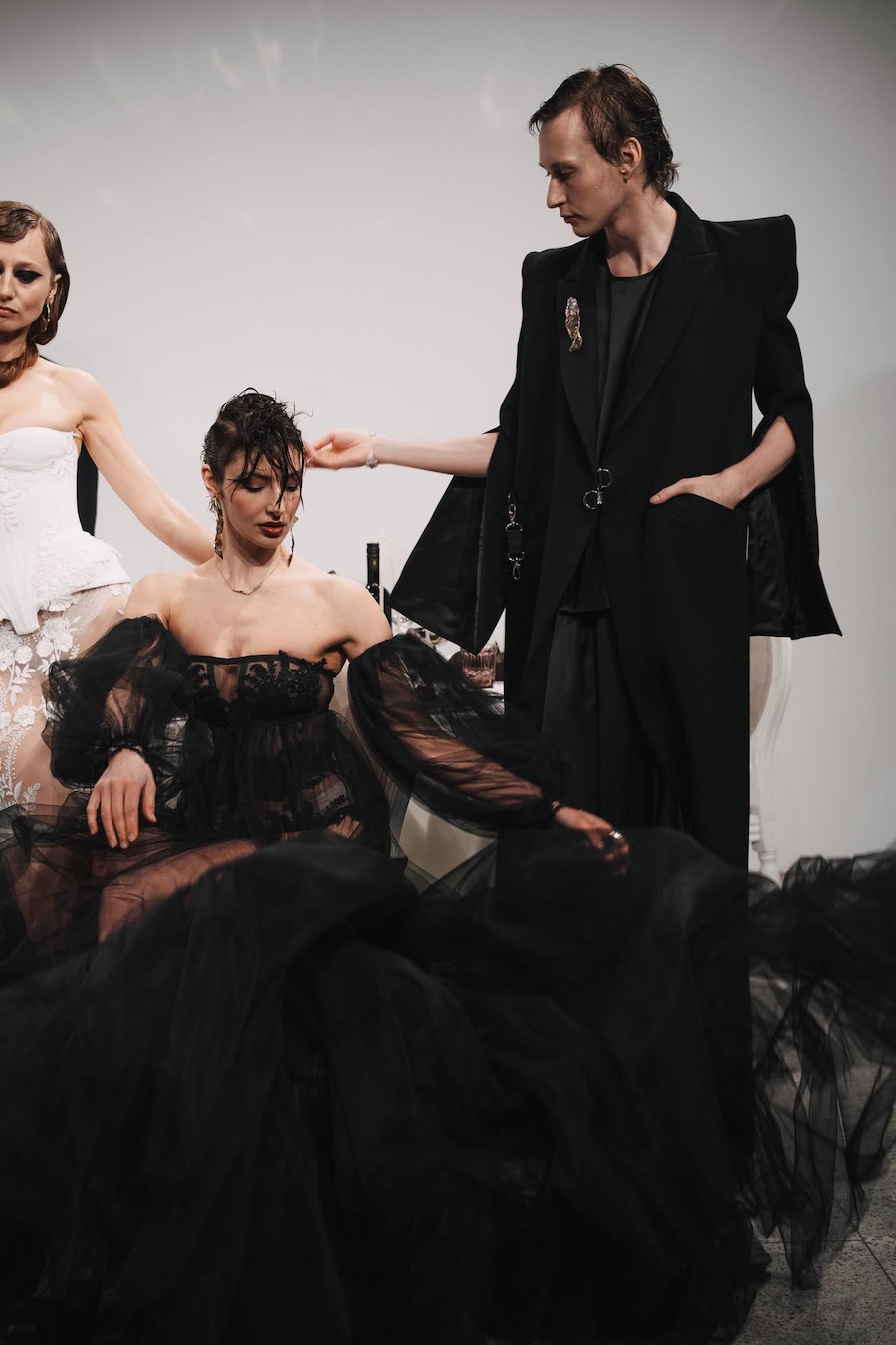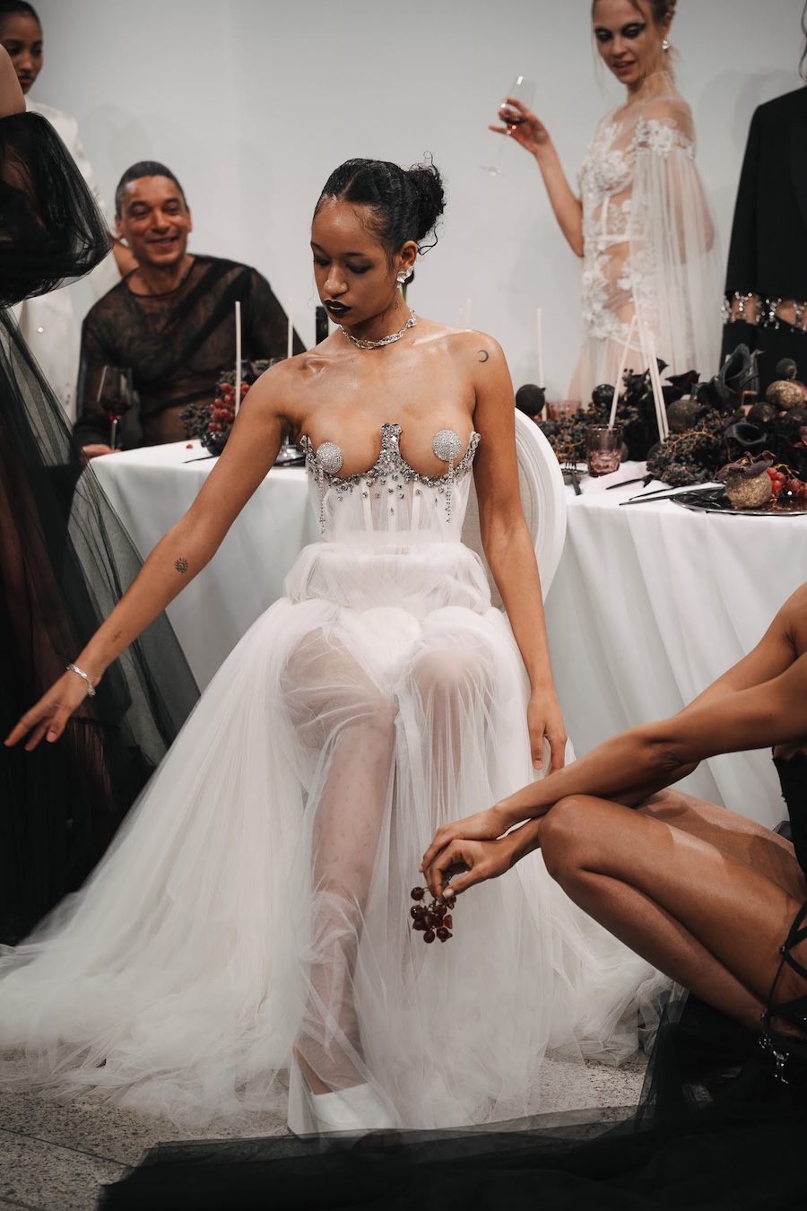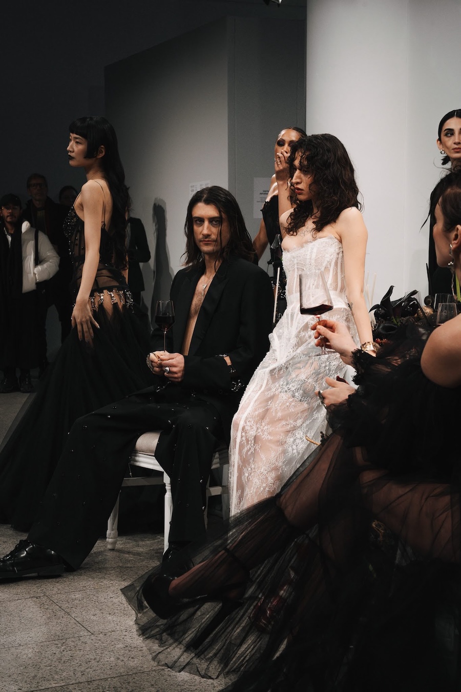 Ritual Unions unveiled their latest collection, a testament to their signature language of post-bridal couture. Expect structured silhouettes intertwined with visible corsetry, sculptural draping, and tactile embellishments that blend ceremonial elegance with a touch of subversive modern flair. Each exquisite look strikes a balance between restraint and exposure, echoing the performance’s core theme: clothing as armour, offering both protection and purposeful revelation of the body.