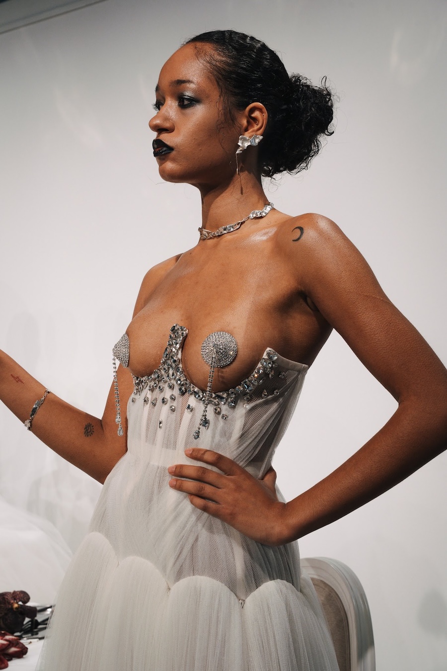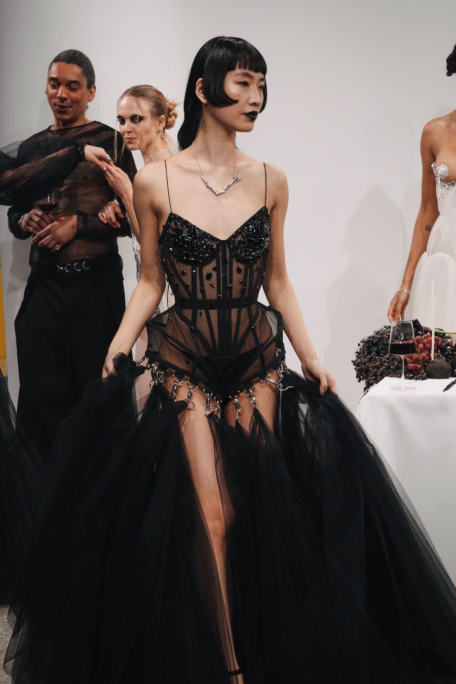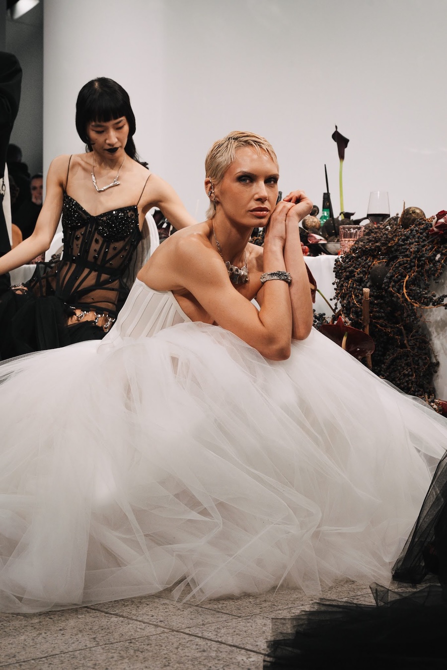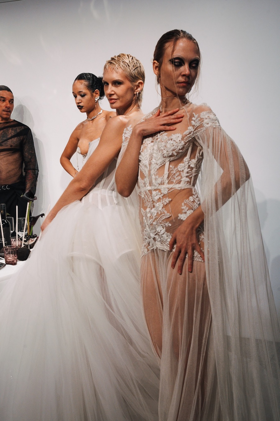 Ritual Unions unveiled their latest collection, a testament to their signature language of post-bridal couture. Expect structured silhouettes intertwined with visible corsetry, sculptural draping, and tactile embellishments that blend ceremonial elegance with a touch of subversive modern flair. Each exquisite look strikes a balance between restraint and exposure, echoing the performance’s core theme: clothing as armour, offering both protection and purposeful revelation of the body.
