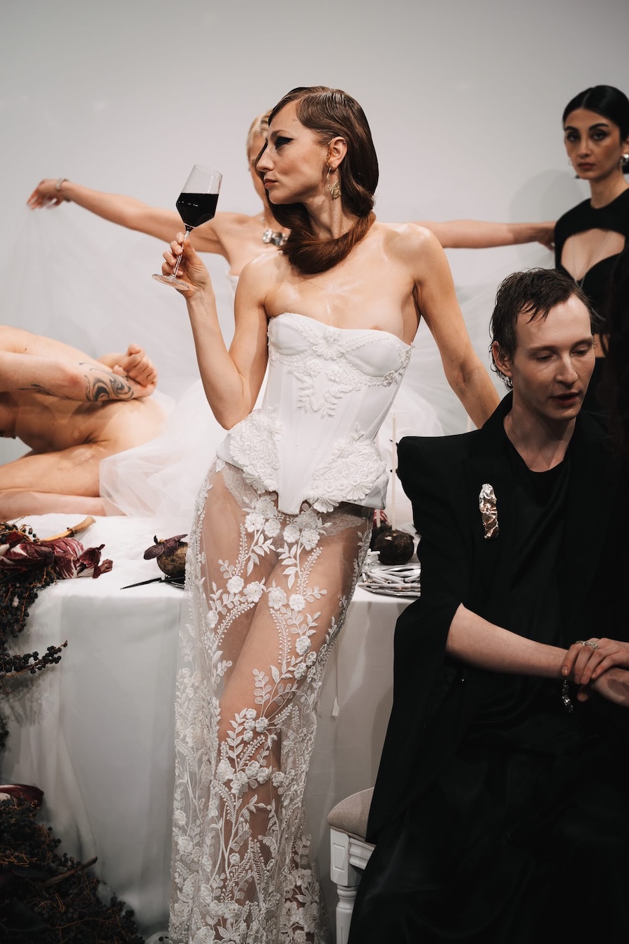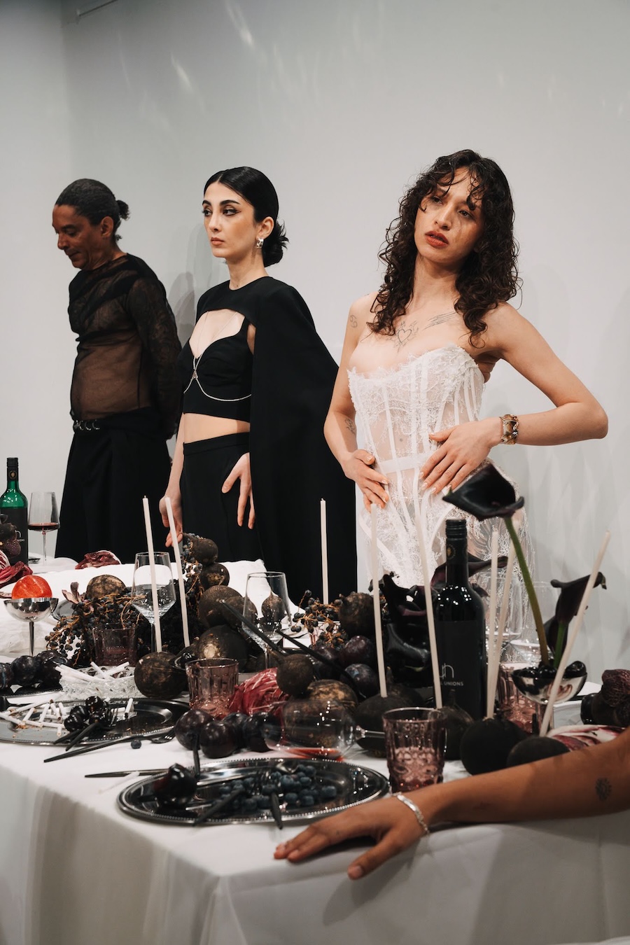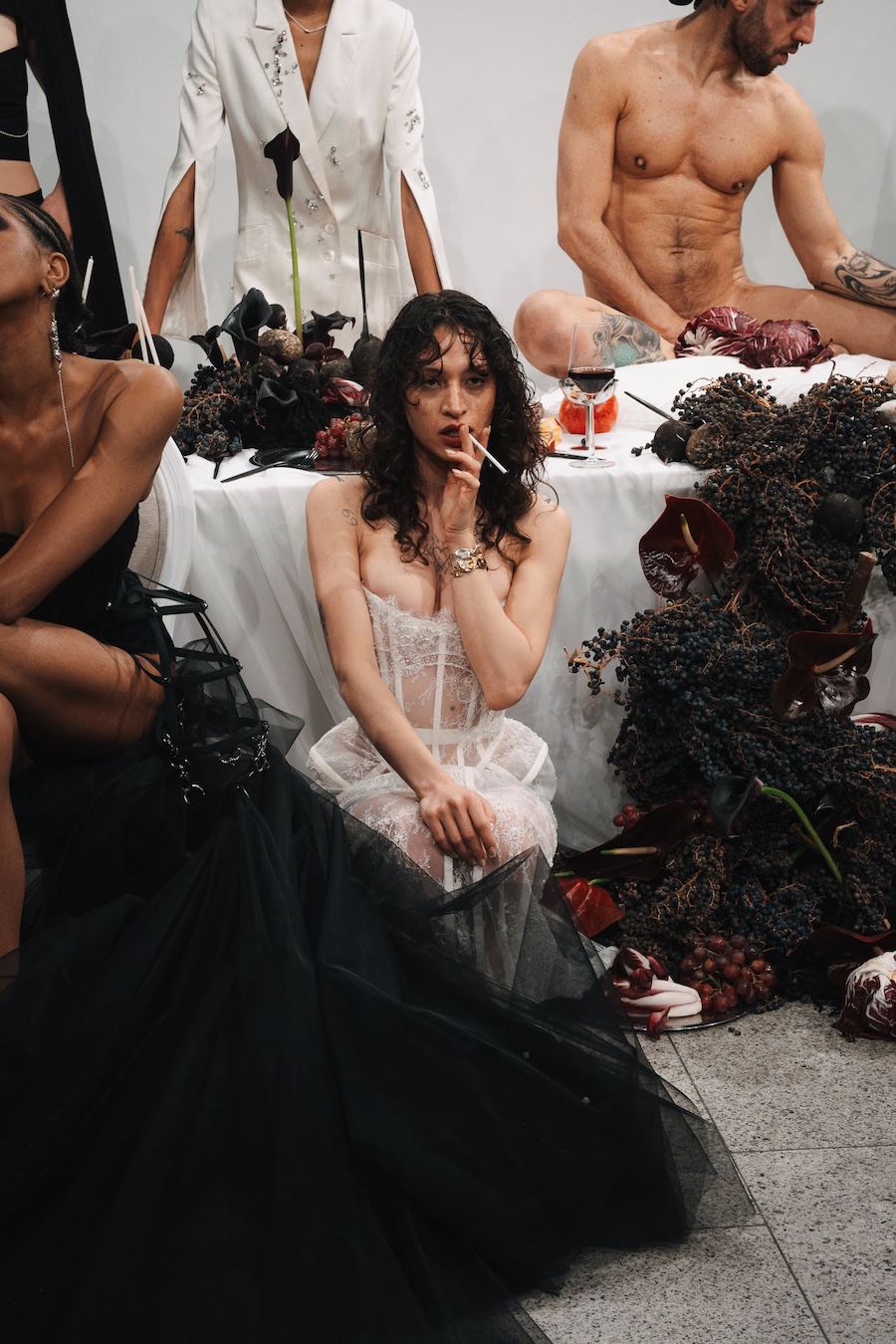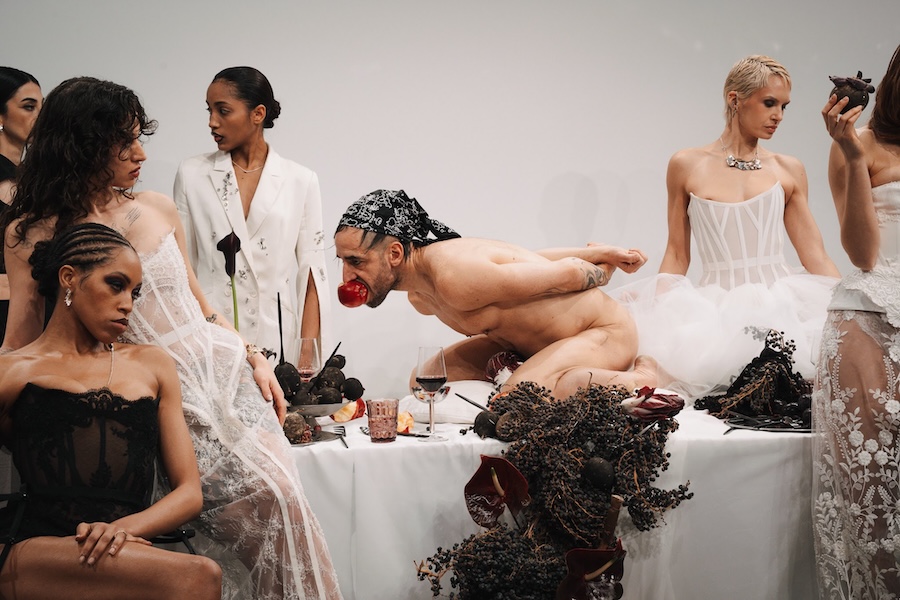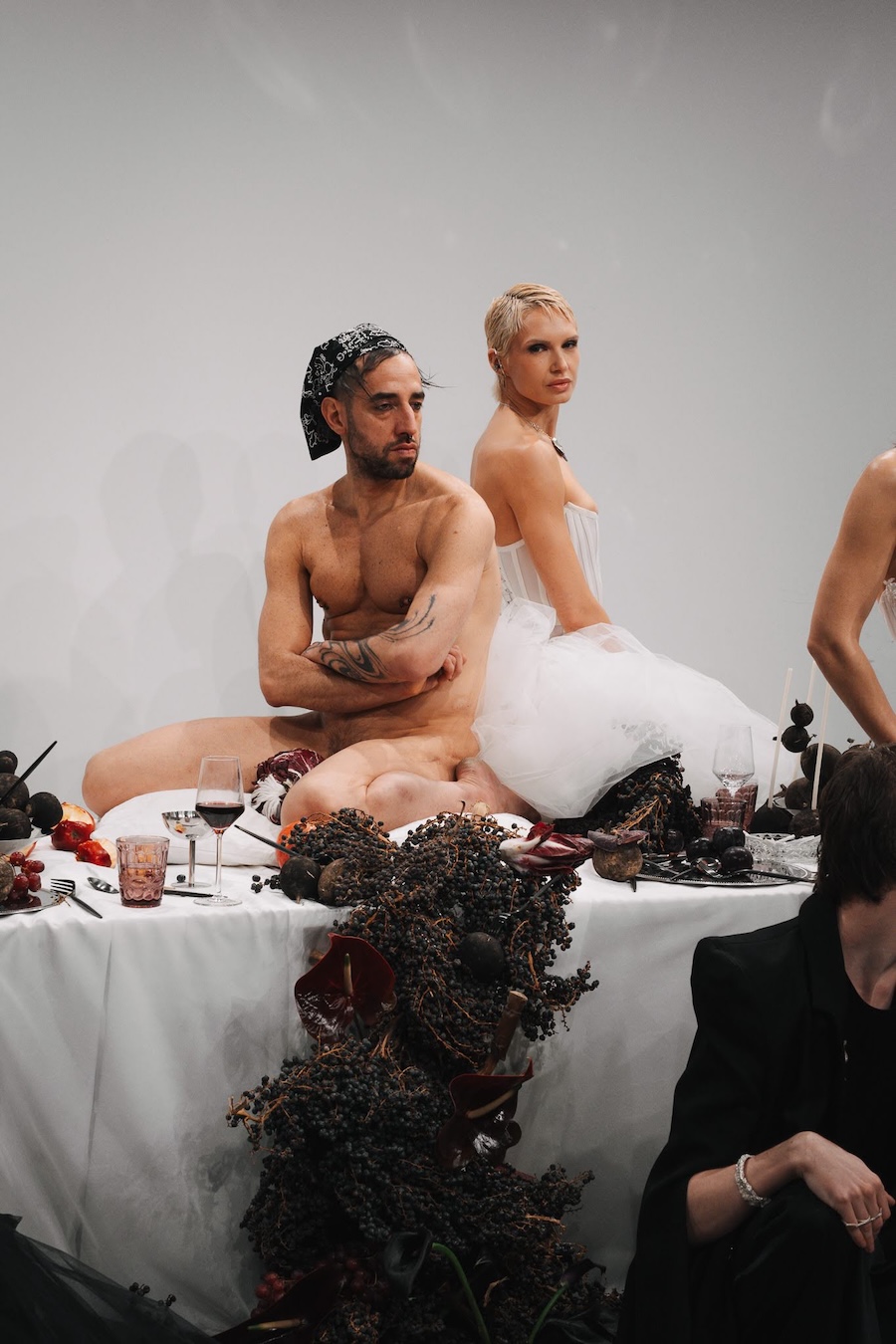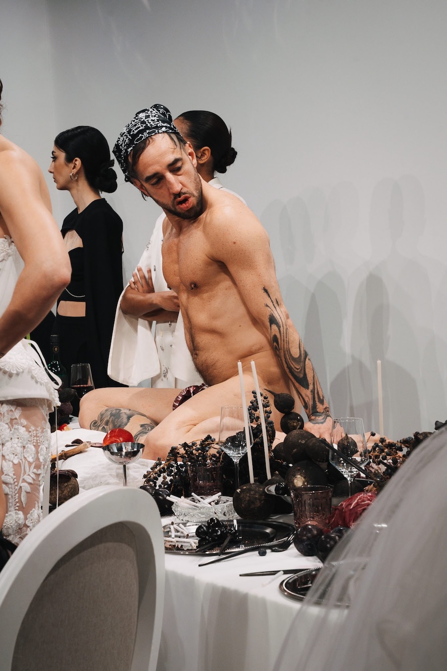 At the heart of this enchanting performance was a lavishly designed dinner table installation, a stunning collaboration with Flores y Amores. A nude male performer perched atop the table, crafting an eye-catching tableau reminiscent of Leonardo da Vinci’s Last Supper, yet interpreted through a modern lens. This striking image teetered between decadence and absurdity, inviting reflection on tradition, ritual, and the spectacle of contemporary culture, highlighting who we see and celebrate within our ever-evolving narrative.