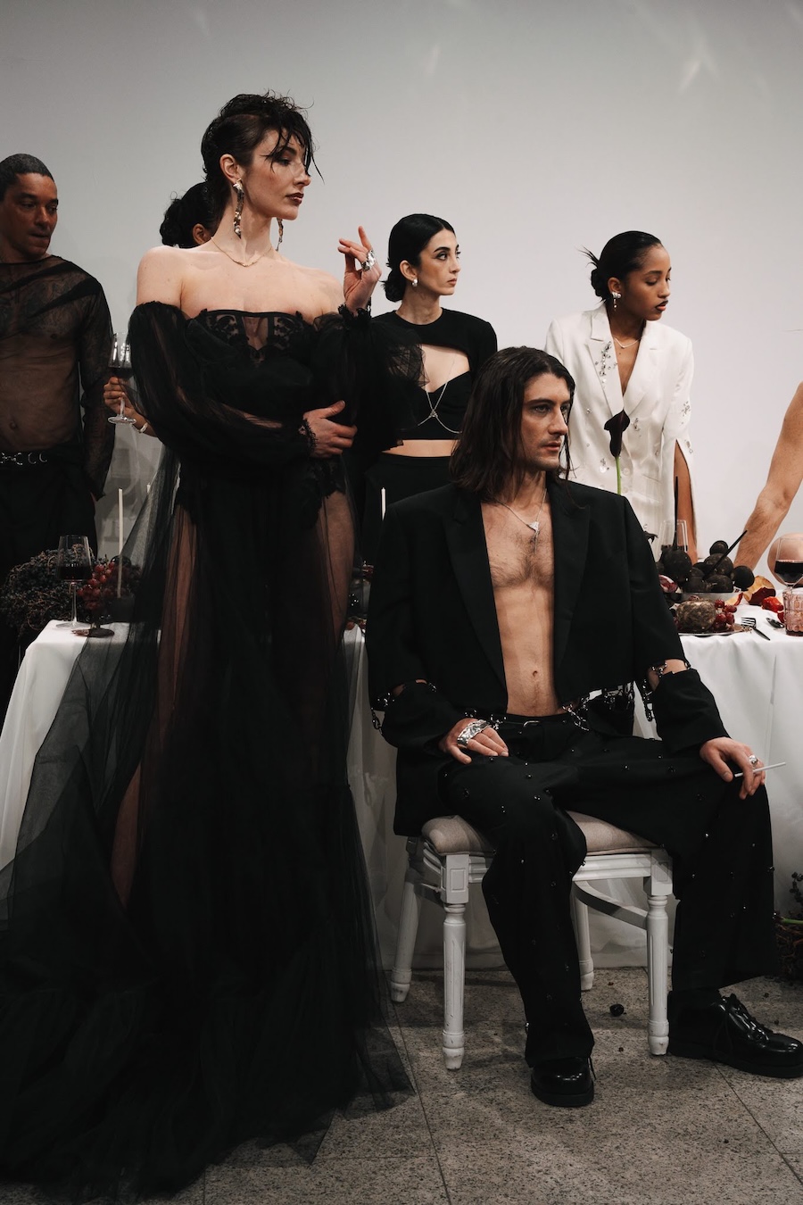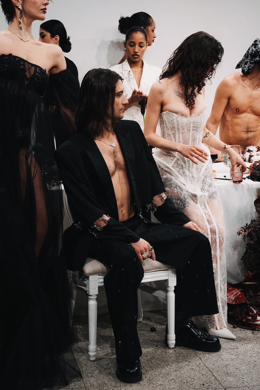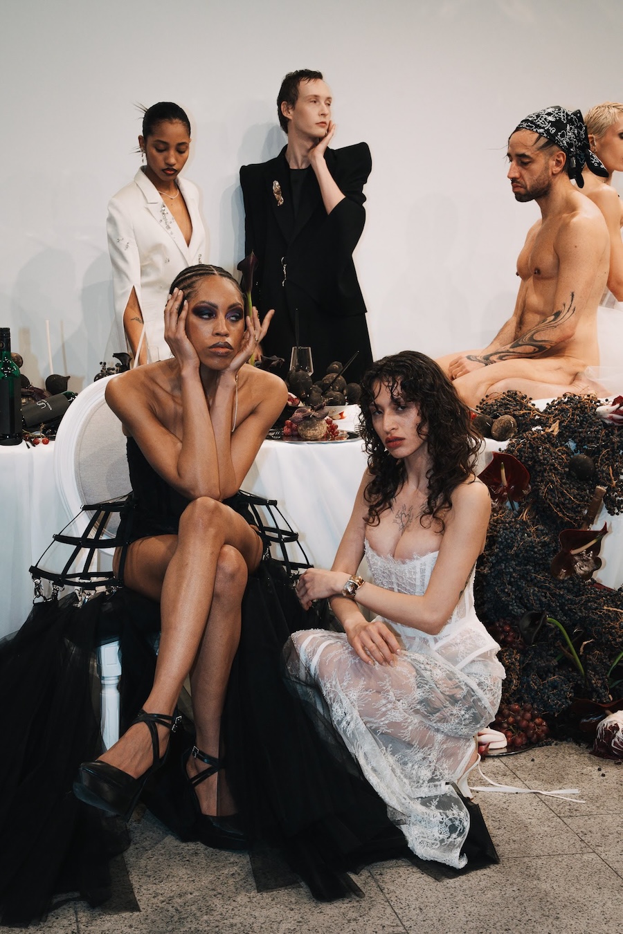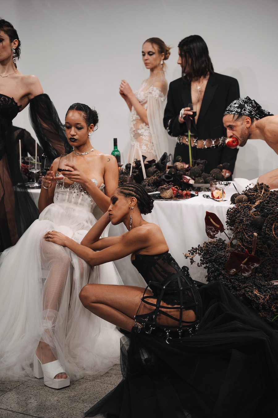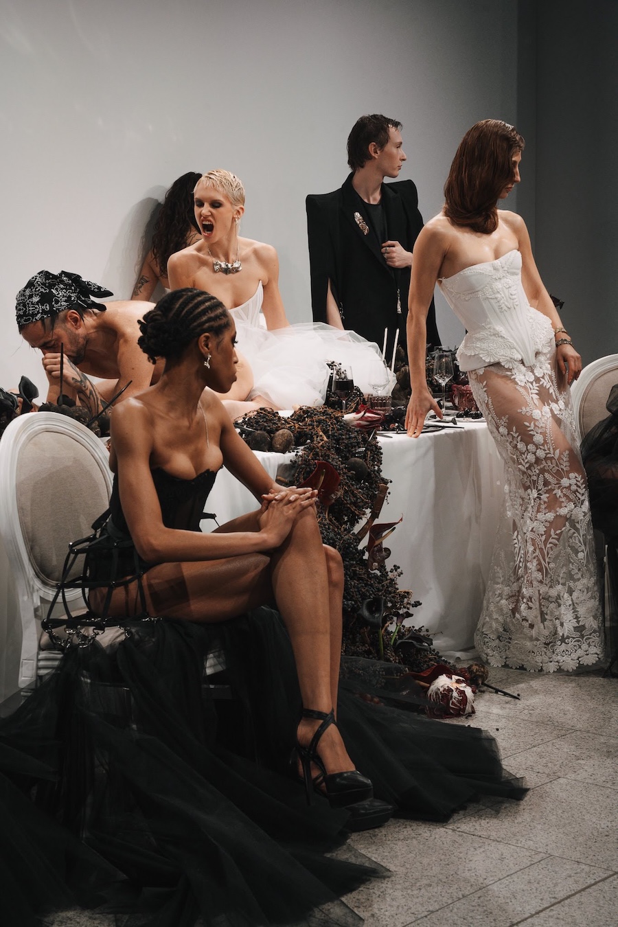 At the heart of this enchanting performance was a lavishly designed dinner table installation, a stunning collaboration with Flores y Amores. A nude male performer perched atop the table, crafting an eye-catching tableau reminiscent of Leonardo da Vinci’s Last Supper, yet interpreted through a modern lens. This striking image teetered between decadence and absurdity, inviting reflection on tradition, ritual, and the spectacle of contemporary culture, highlighting who we see and celebrate within our ever-evolving narrative.