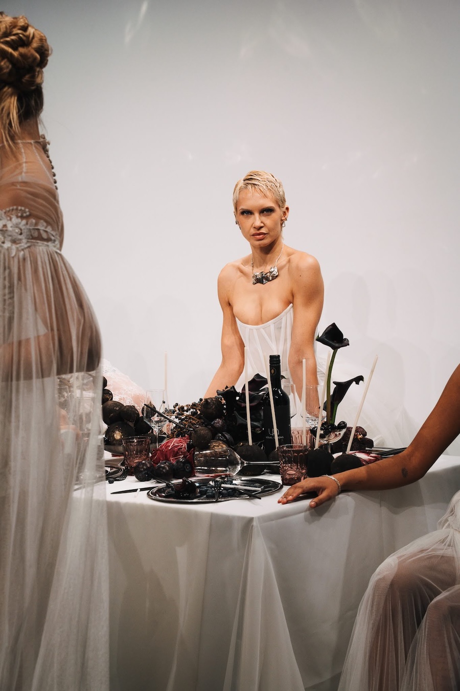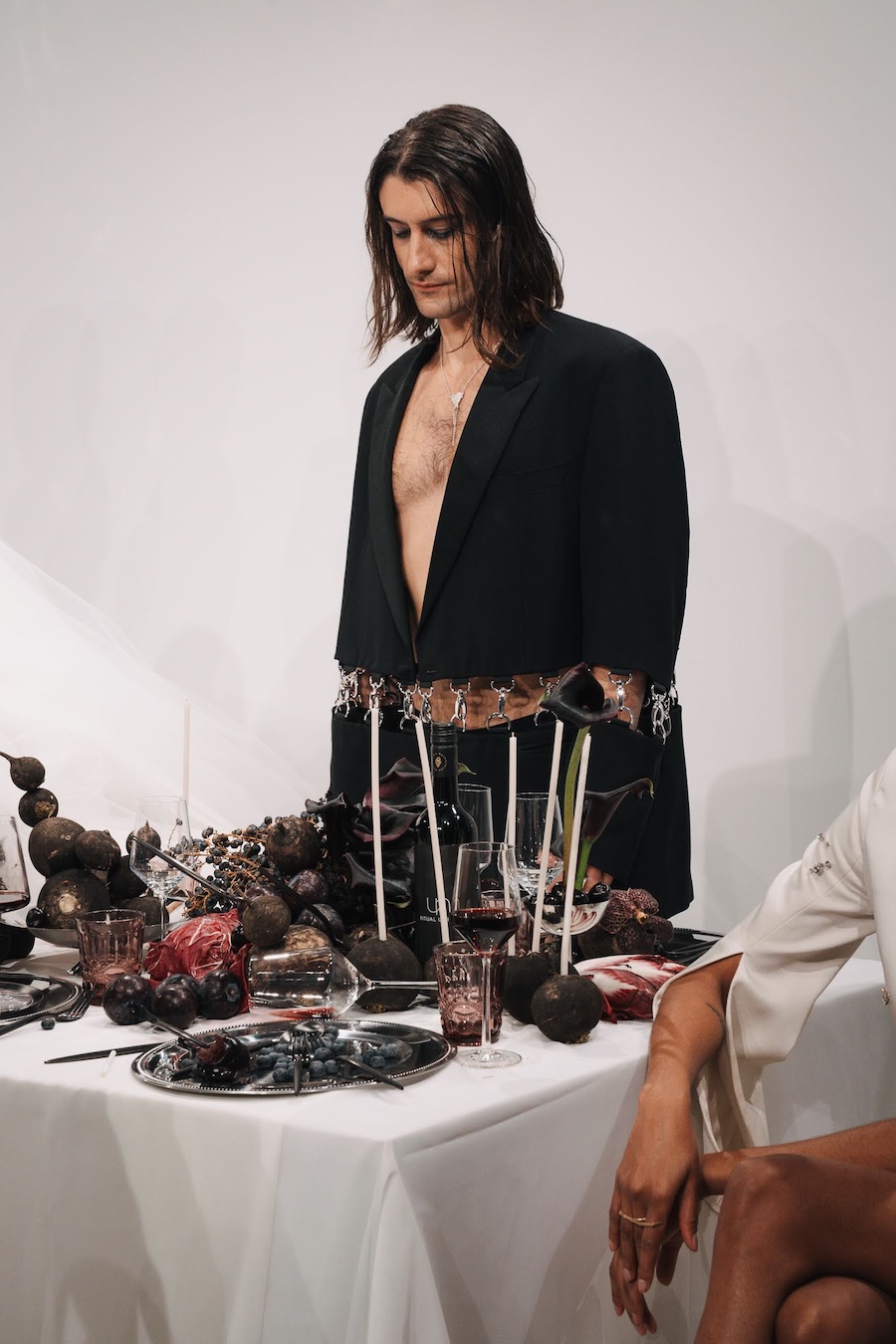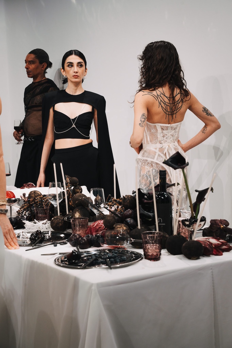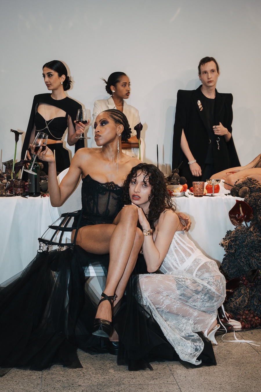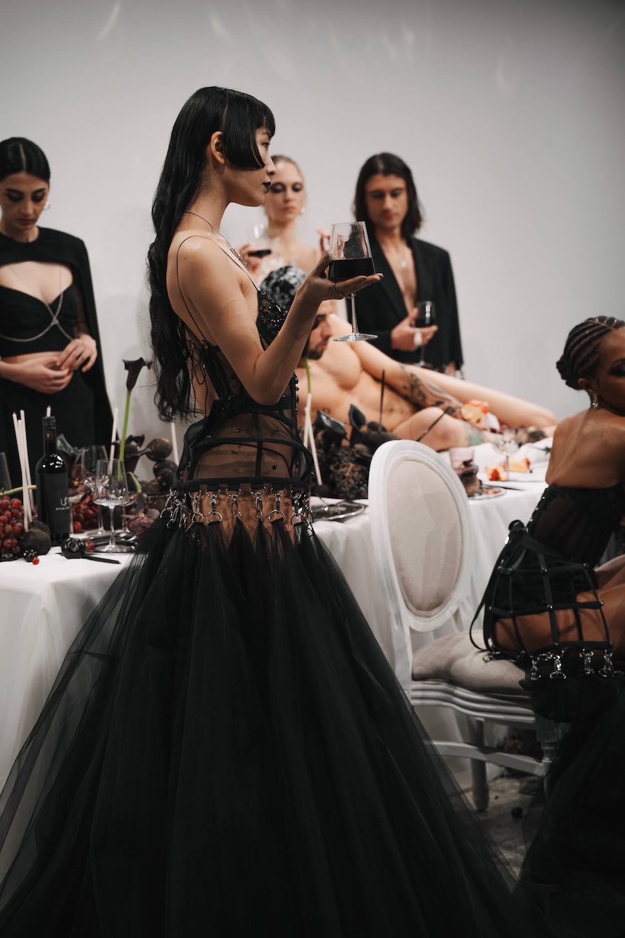 At the heart of this enchanting performance was a lavishly designed dinner table installation, a stunning collaboration with Flores y Amores. A nude male performer perched atop the table, crafting an eye-catching tableau reminiscent of Leonardo da Vinci’s Last Supper, yet interpreted through a modern lens. This striking image teetered between decadence and absurdity, inviting reflection on tradition, ritual, and the spectacle of contemporary culture, highlighting who we see and celebrate within our ever-evolving narrative.
