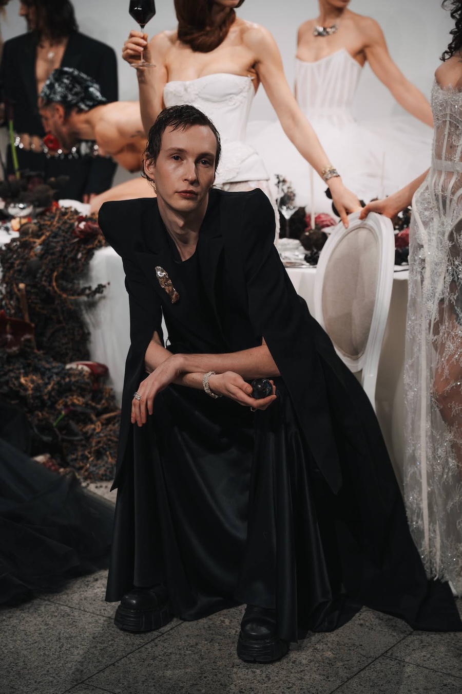 Collaboration was key, with an exceptional set design by Flores y Amores and striking sculptural jewellery by Gina Melosi enhancing the performance’s ceremonial tension. The makeup and hair, executed by a multidisciplinary Berlin team, further underscored the show’s devotion to community and collective authorship.