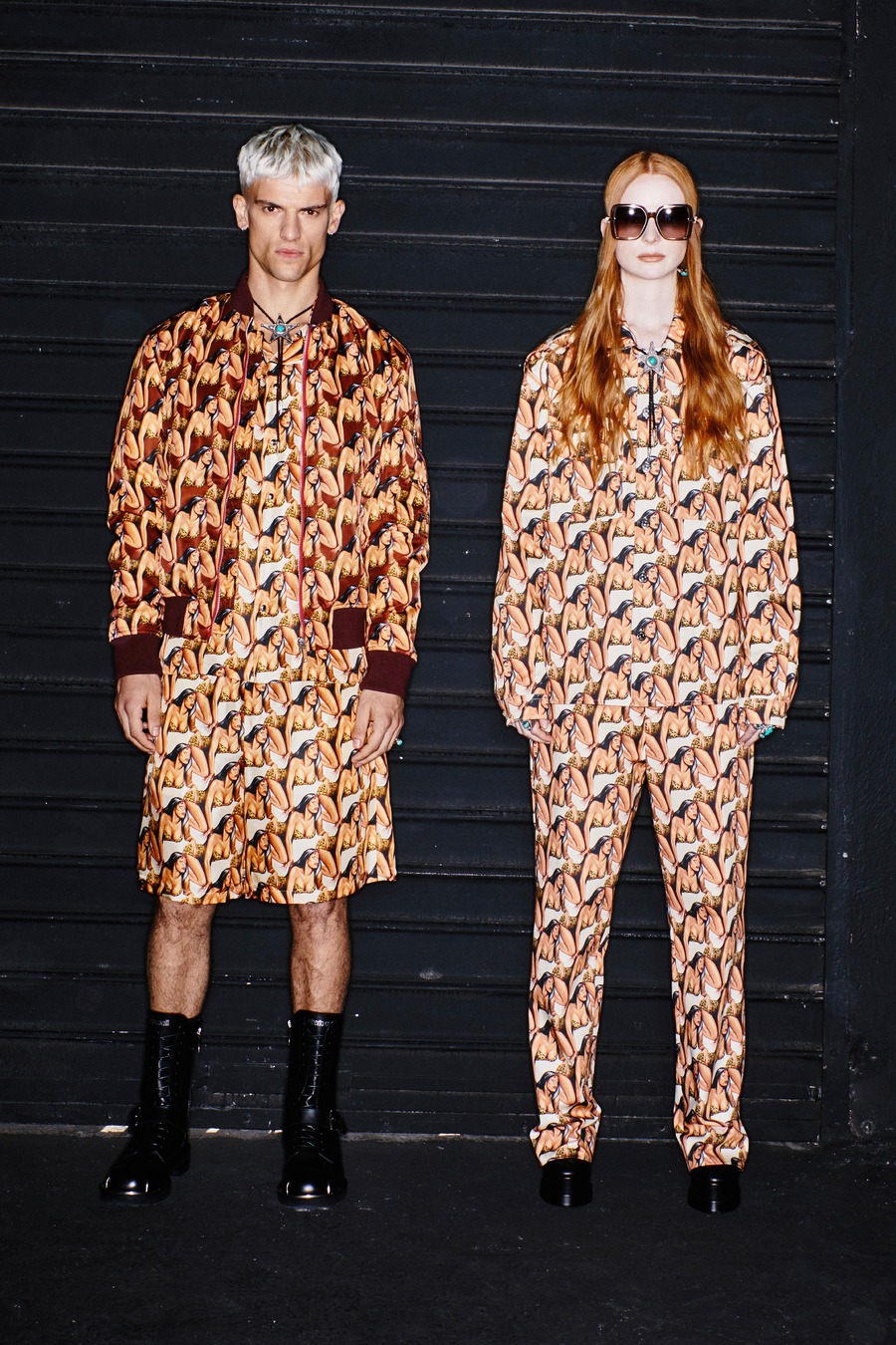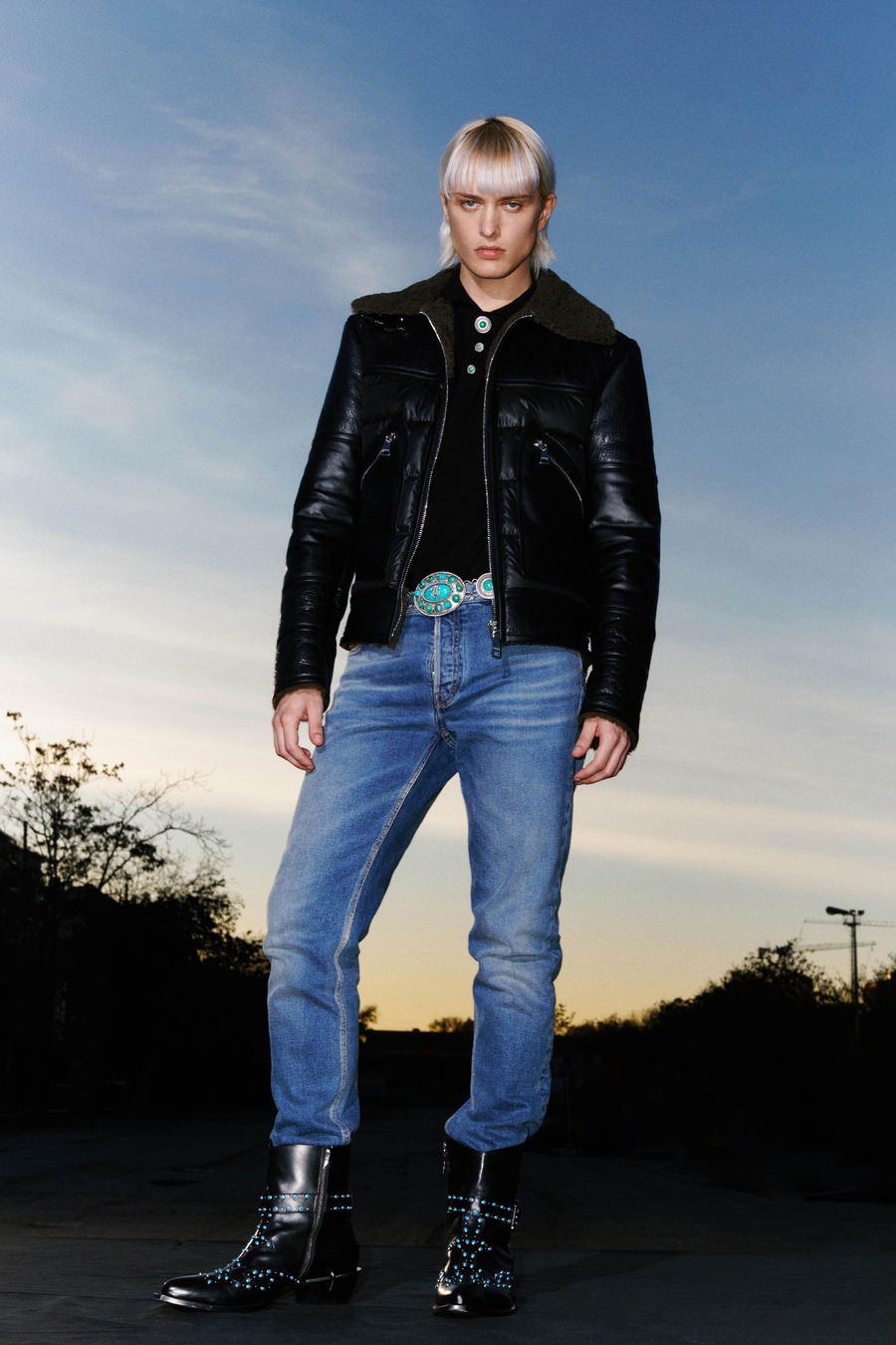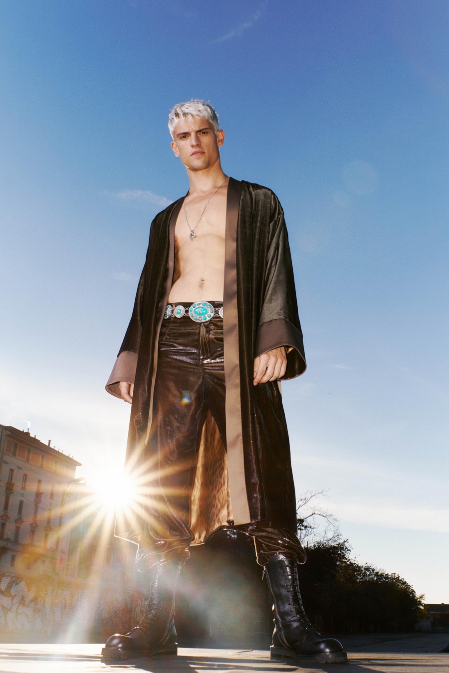 The brand’s strong heritage echoes in the intricate patchwork leather pieces decorated with lace-up details that also speak to the modern free spirit. The collection builds on the concept of freedom to talk to the new generations through a genderless approach, resulting in unisex drill utility shirts and grungy separates printed with an eye-catching cheeky pin-up motif.