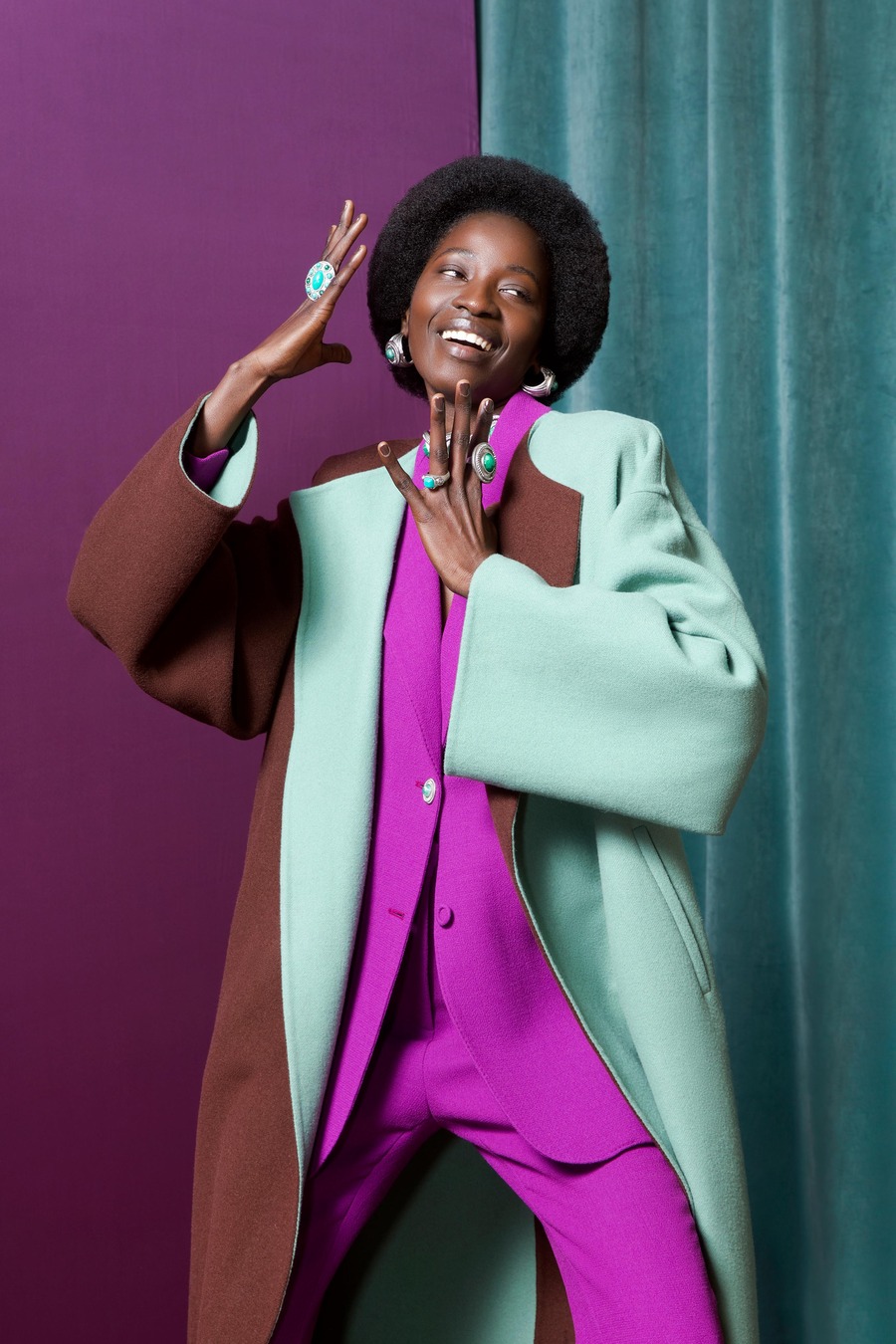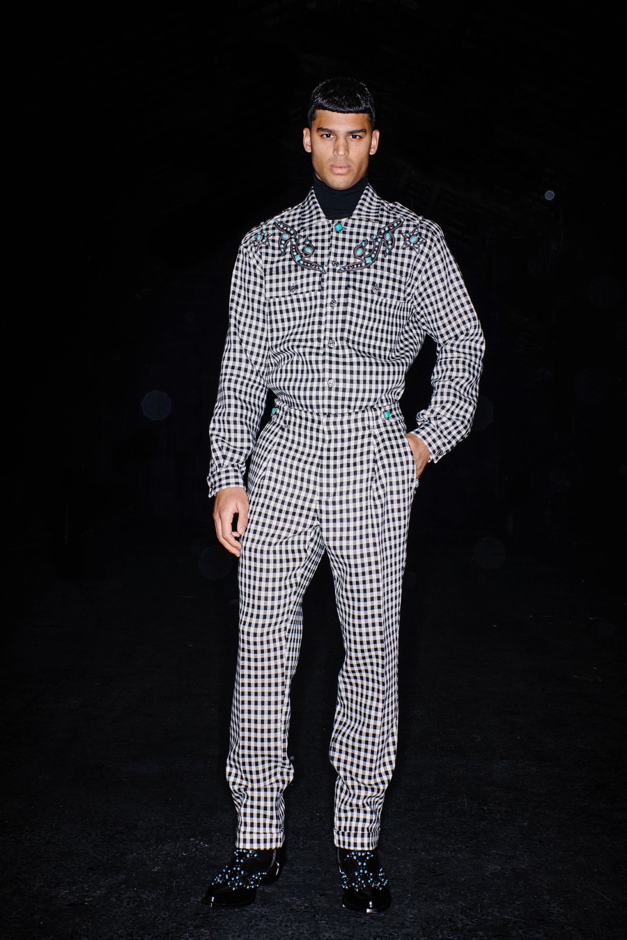 Playing with contrasts and juxtapositions, an adventurous Western feel meets a traditional Italian vibe, resulting in fringed details and a beautiful range of metallic accessories decorated with precious turquoise. Impeccable deconstructed cashmere coats and sartorial suits mixing checks and Prince of Wales patterns add to the adventure of contrasts.