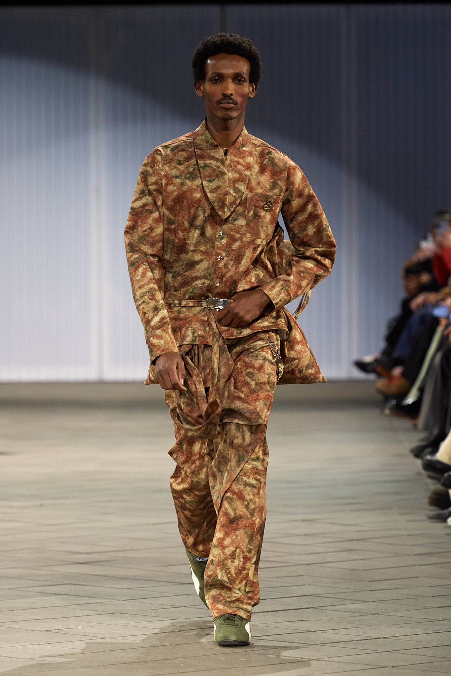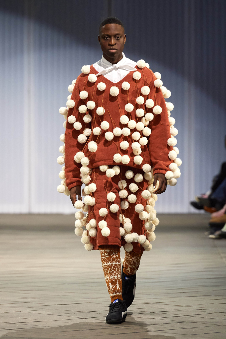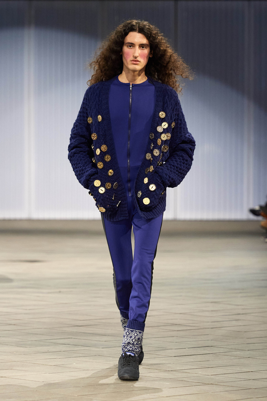 Echoing the familial gatherings spurred by the Winter Olympics, Ekroth’s collection invites the spectator into his youth, where lounging sofas were the amphitheatres of grandiosity. With a palette drawn from the muted hues of the time, silhouettes emerge as contemporary heirlooms: ski jumpers’ suits metamorphose into sumptuously knitted ensembles, while ice hockey’s robust jerseys yield into tactile knitted sweaters that capture the rugged elegance of sport.