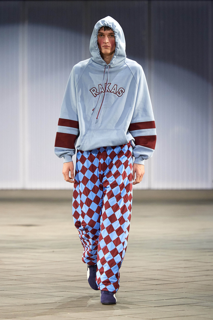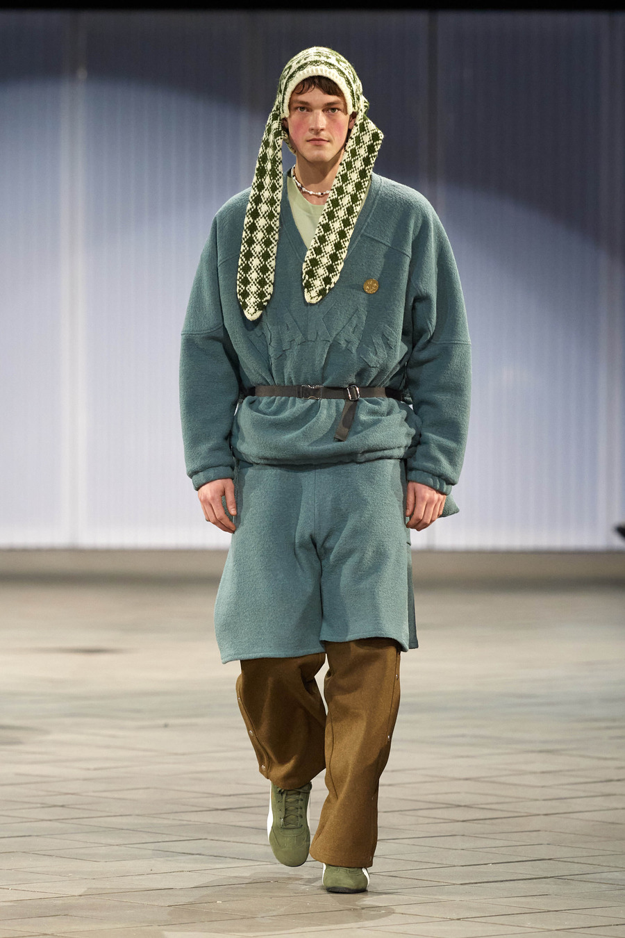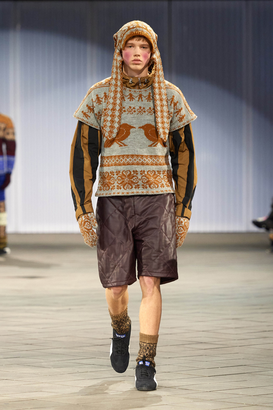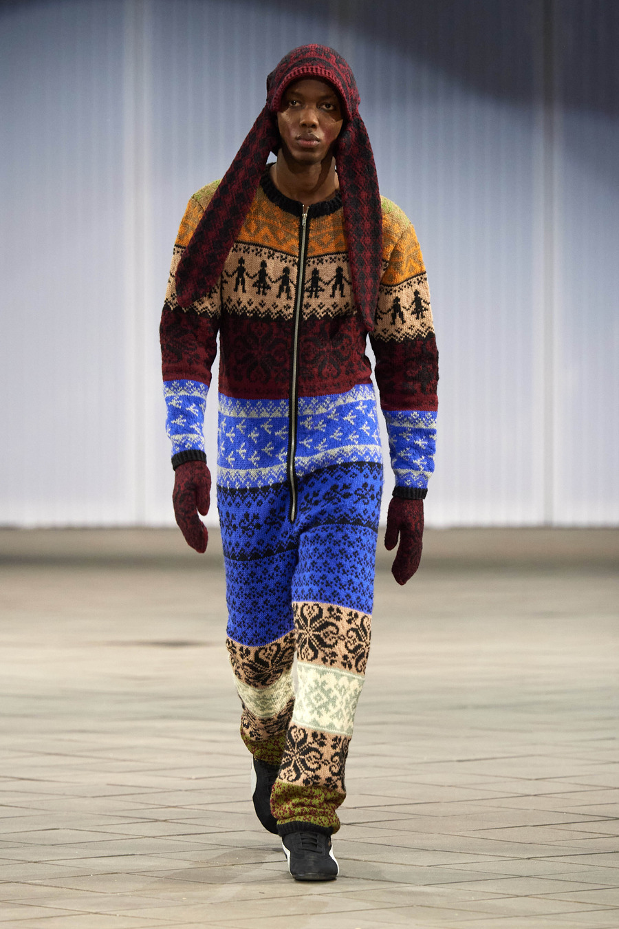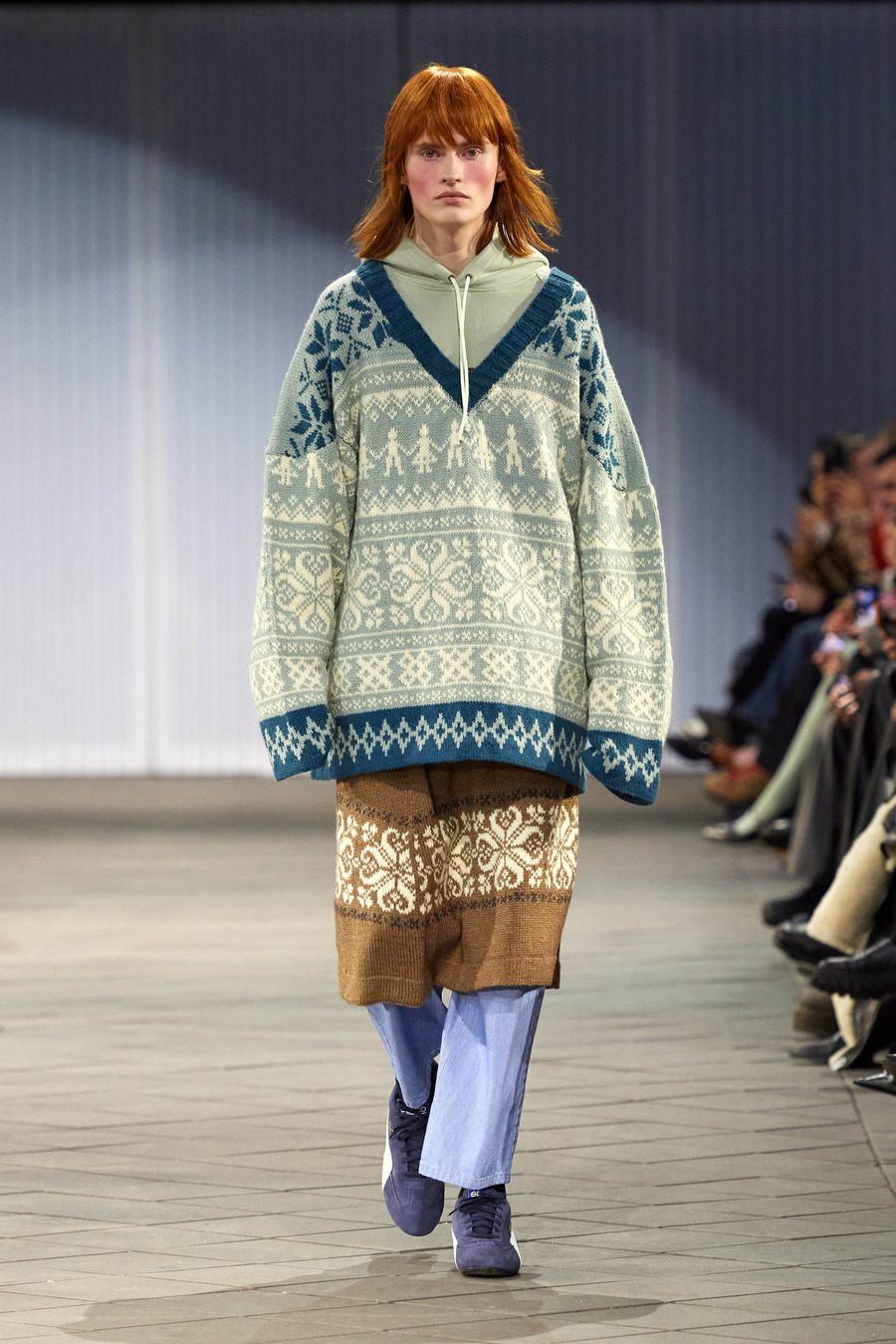 Echoing the familial gatherings spurred by the Winter Olympics, Ekroth’s collection invites the spectator into his youth, where lounging sofas were the amphitheatres of grandiosity. With a palette drawn from the muted hues of the time, silhouettes emerge as contemporary heirlooms: ski jumpers’ suits metamorphose into sumptuously knitted ensembles, while ice hockey’s robust jerseys yield into tactile knitted sweaters that capture the rugged elegance of sport.