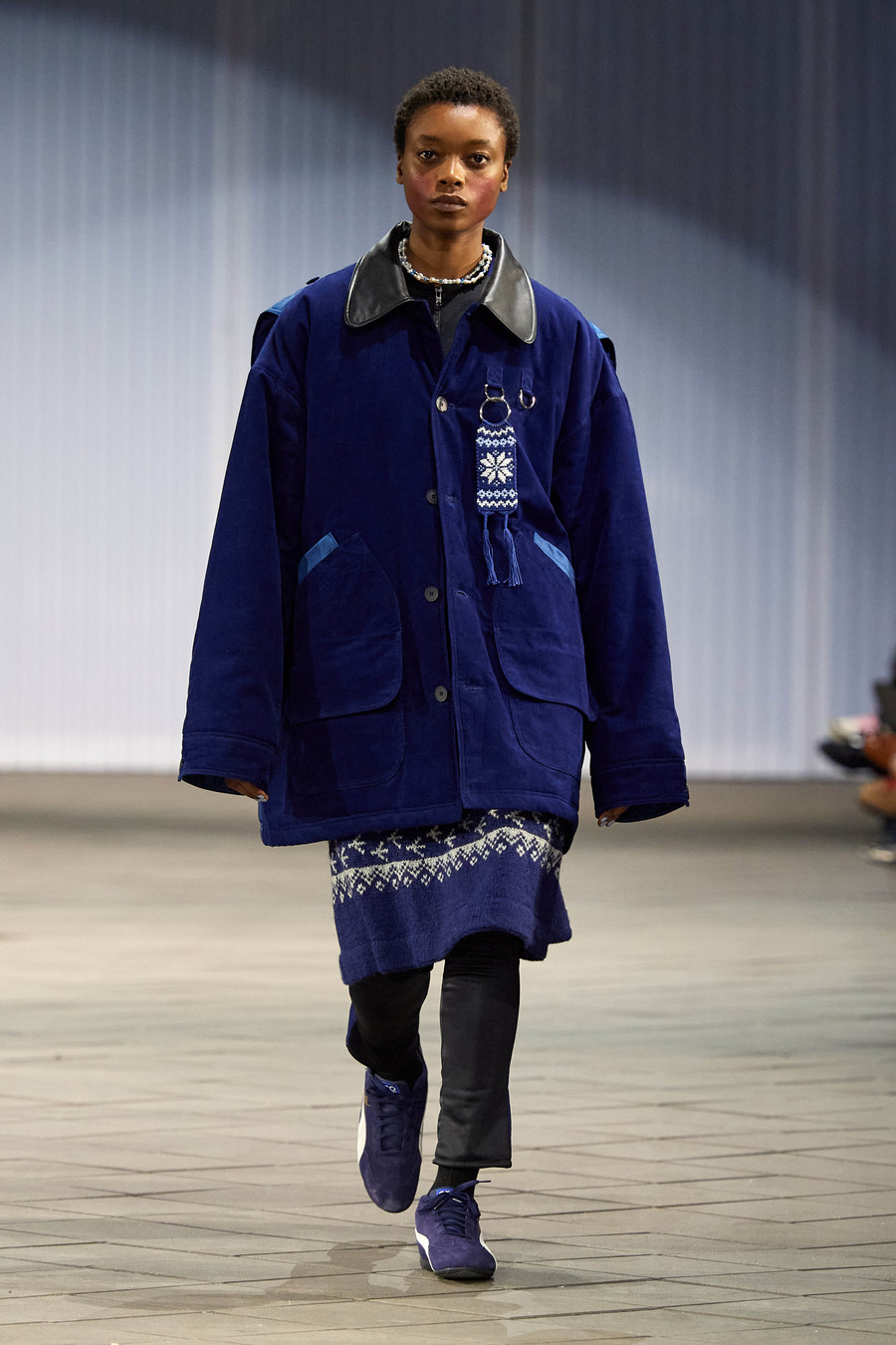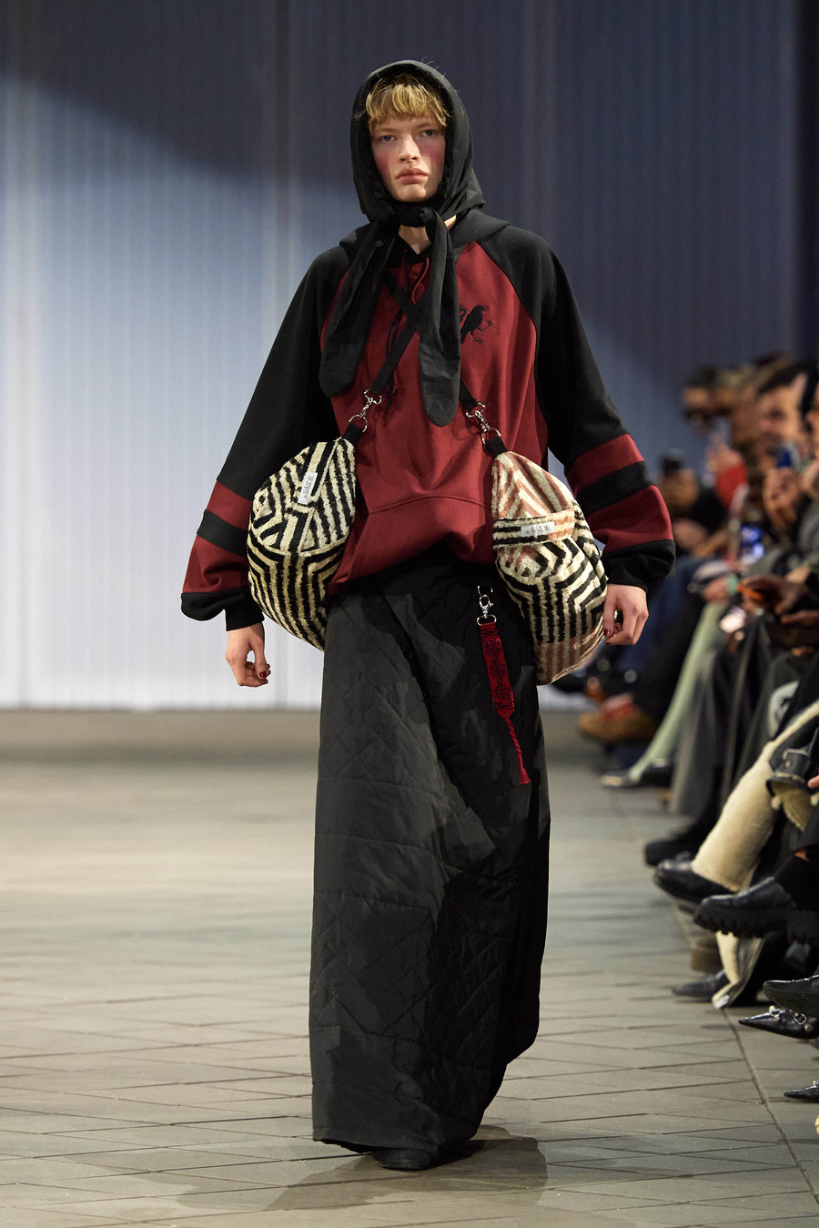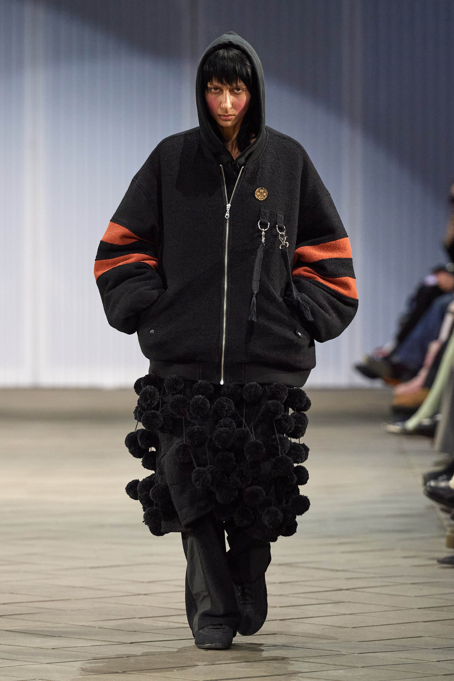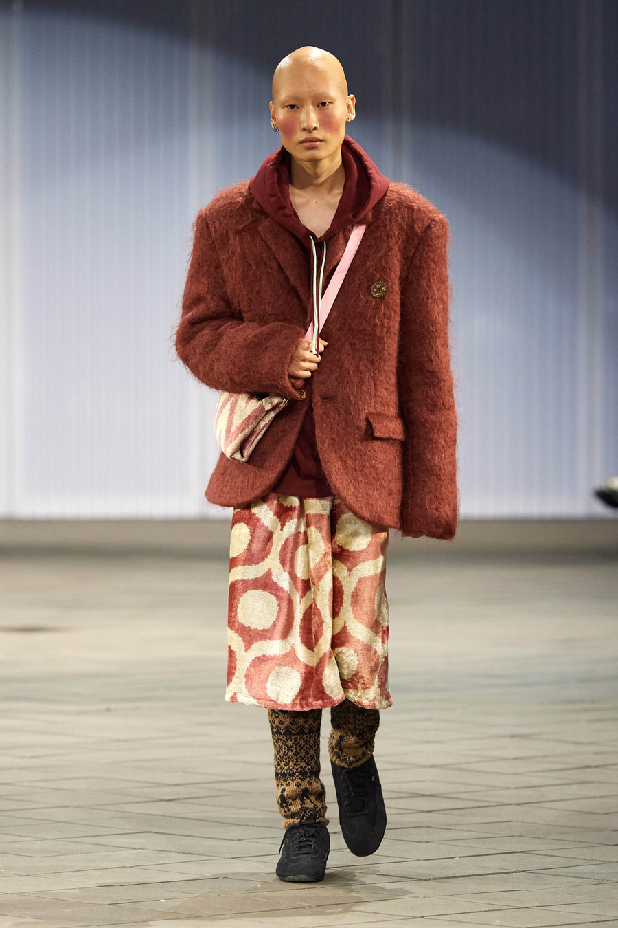 Echoing the familial gatherings spurred by the Winter Olympics, Ekroth’s collection invites the spectator into his youth, where lounging sofas were the amphitheatres of grandiosity. With a palette drawn from the muted hues of the time, silhouettes emerge as contemporary heirlooms: ski jumpers’ suits metamorphose into sumptuously knitted ensembles, while ice hockey’s robust jerseys yield into tactile knitted sweaters that capture the rugged elegance of sport.