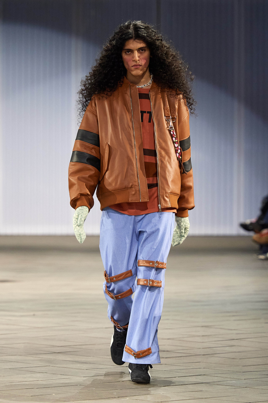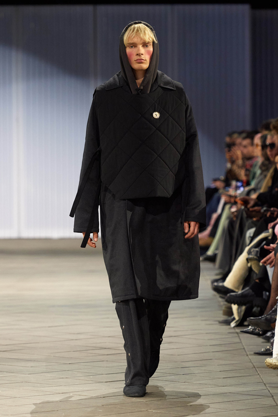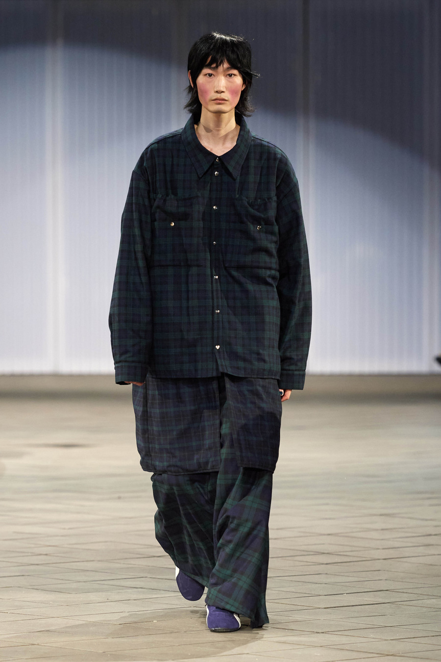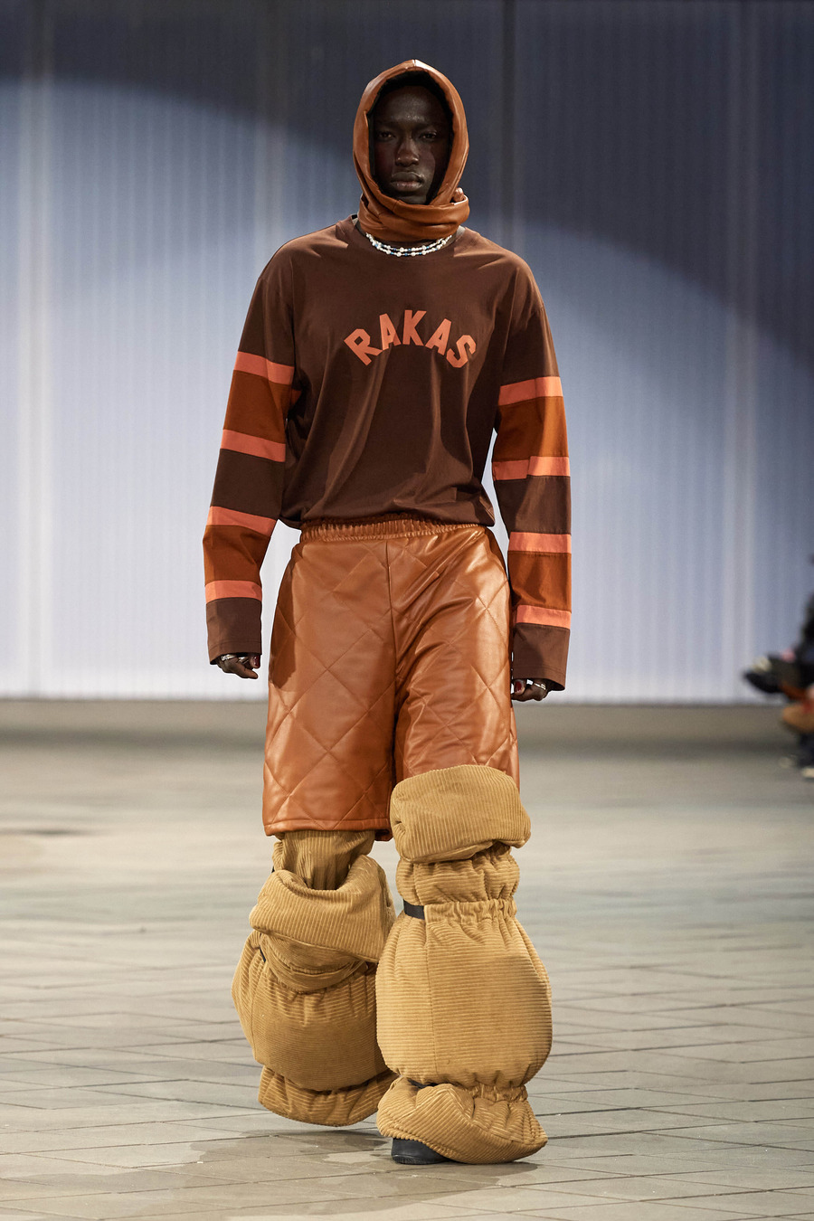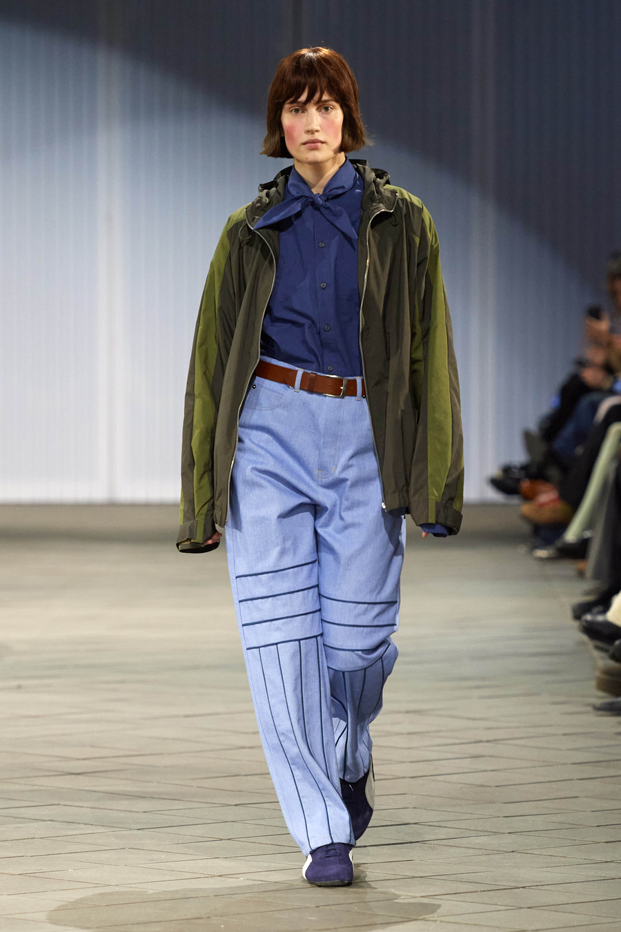 Echoing the familial gatherings spurred by the Winter Olympics, Ekroth’s collection invites the spectator into his youth, where lounging sofas were the amphitheatres of grandiosity. With a palette drawn from the muted hues of the time, silhouettes emerge as contemporary heirlooms: ski jumpers’ suits metamorphose into sumptuously knitted ensembles, while ice hockey’s robust jerseys yield into tactile knitted sweaters that capture the rugged elegance of sport.