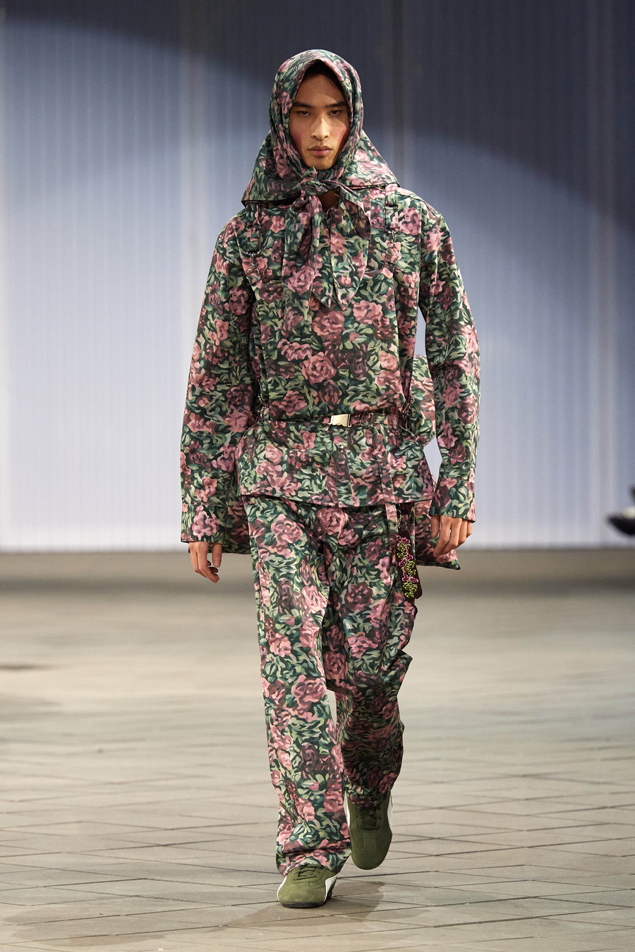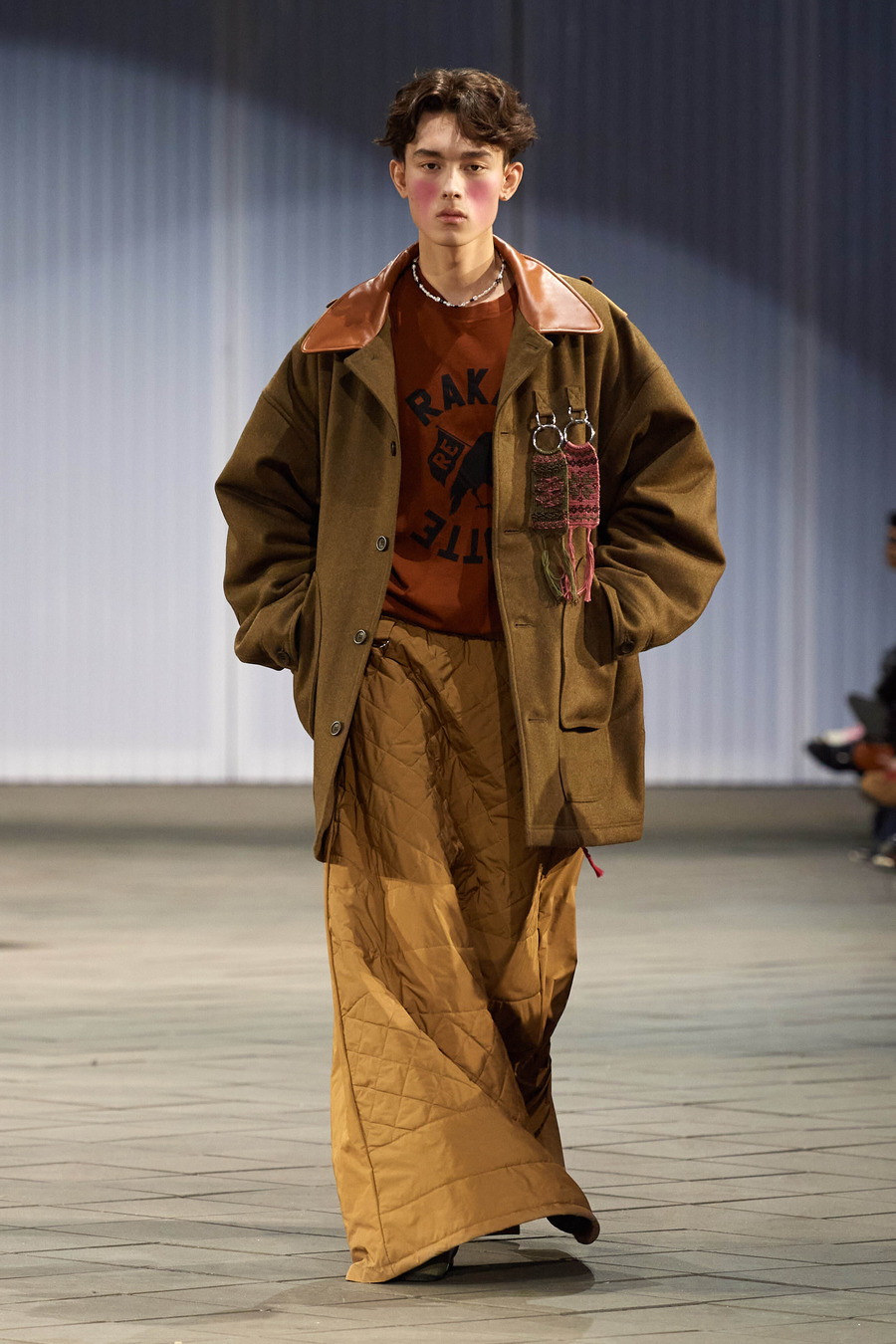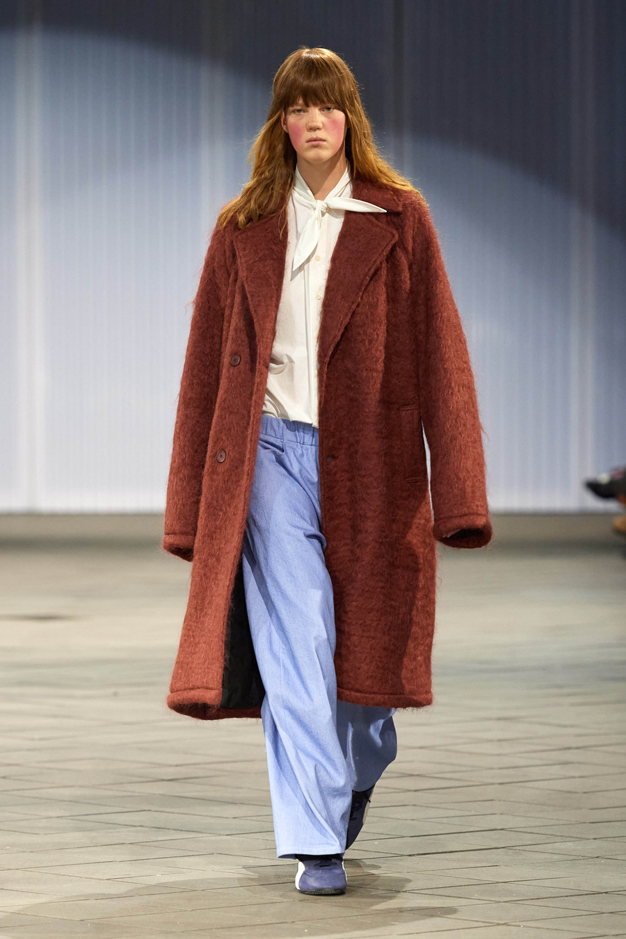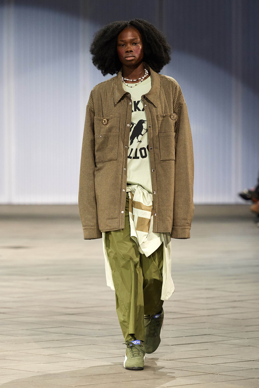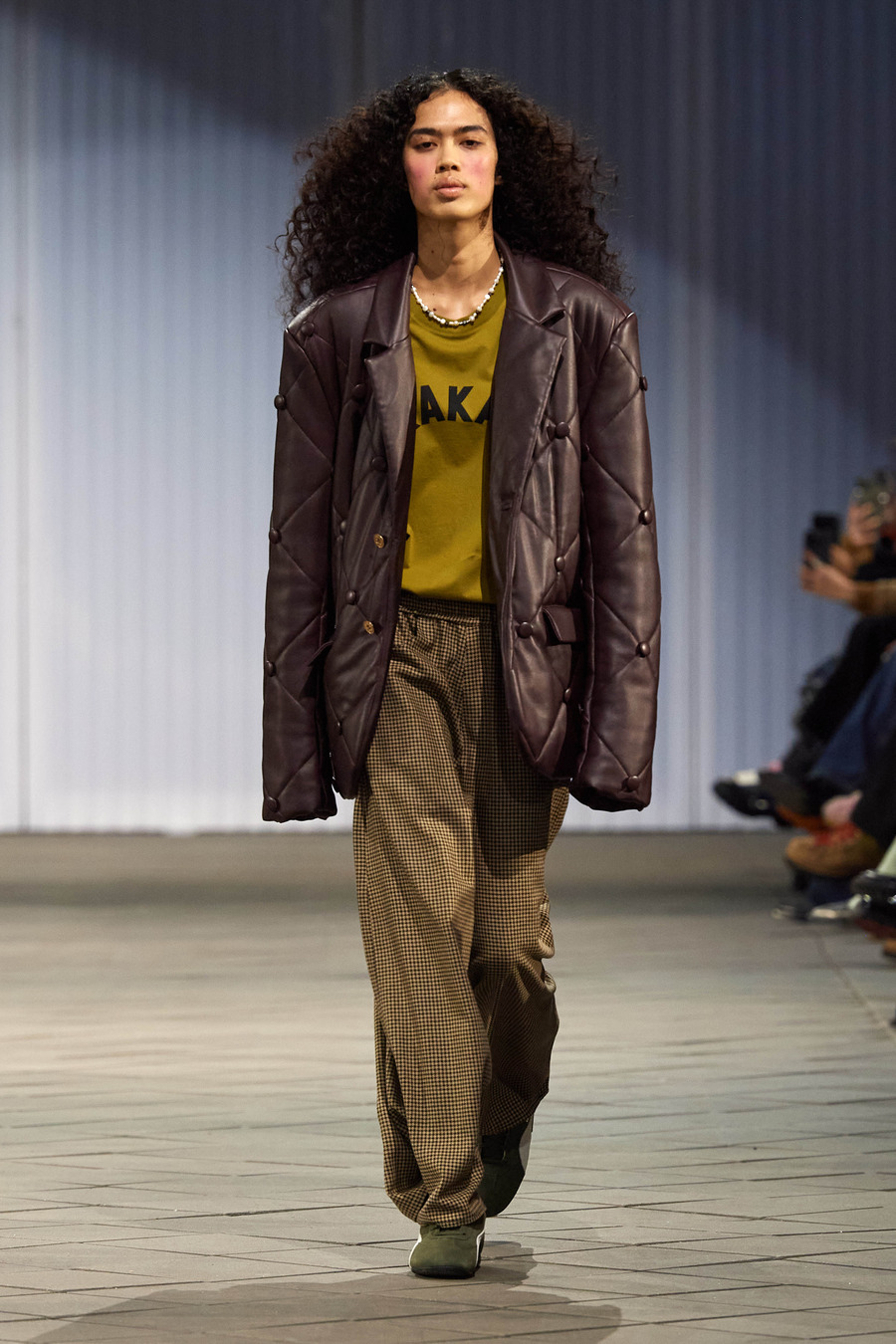 Echoing the familial gatherings spurred by the Winter Olympics, Ekroth’s collection invites the spectator into his youth, where lounging sofas were the amphitheatres of grandiosity. With a palette drawn from the muted hues of the time, silhouettes emerge as contemporary heirlooms: ski jumpers’ suits metamorphose into sumptuously knitted ensembles, while ice hockey’s robust jerseys yield into tactile knitted sweaters that capture the rugged elegance of sport.