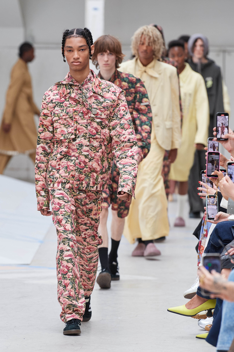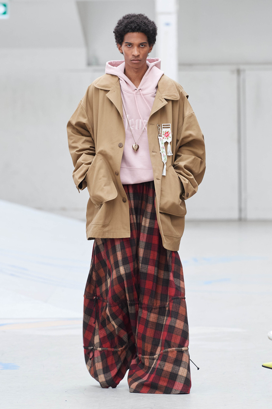 This extraordinary collection weaves a tapestry of longing, connecting generations through a harmonious blend of meticulously draped ankle-grazing aprons, oversized silhouettes, and delicately hand-painted patterns. Rolf Ekroth seamlessly taps into his own nostalgia, crafting a visual narrative that intertwines his pastel-coloured memories of the 1990s, his parents’ delicately intertwined recollections of the 1960s and his grandparents’ persistent yearning for the past.