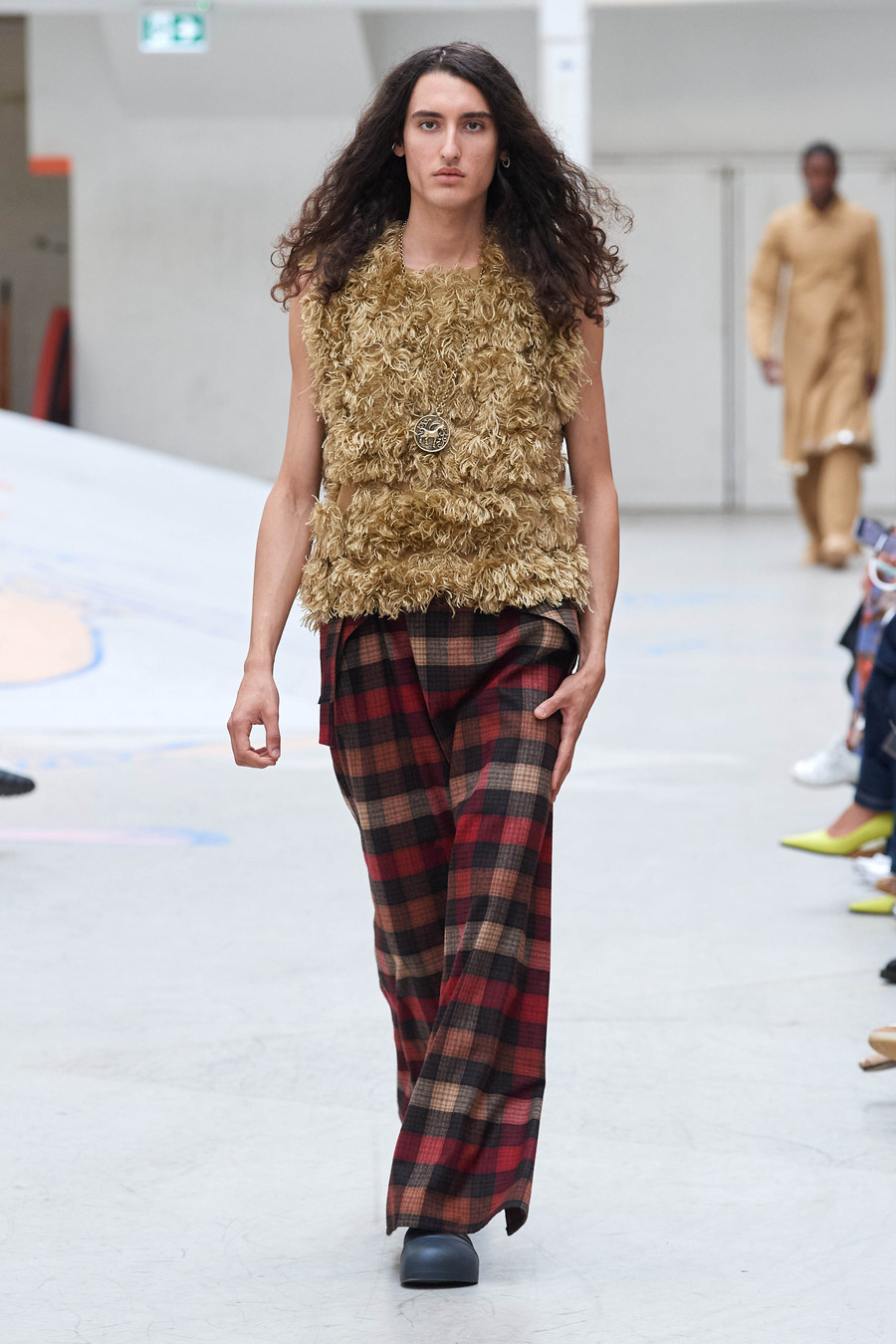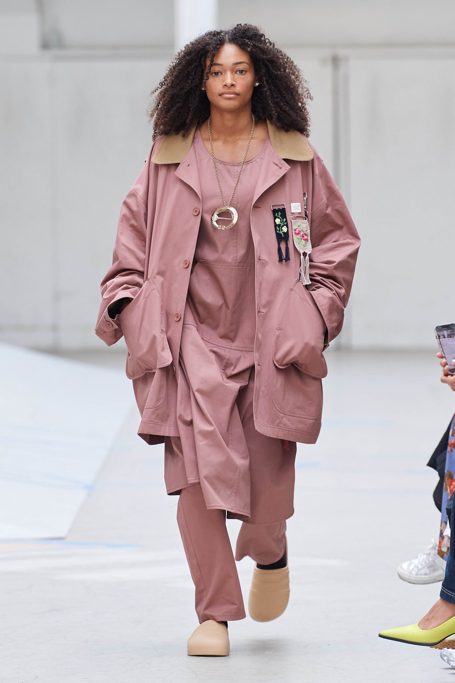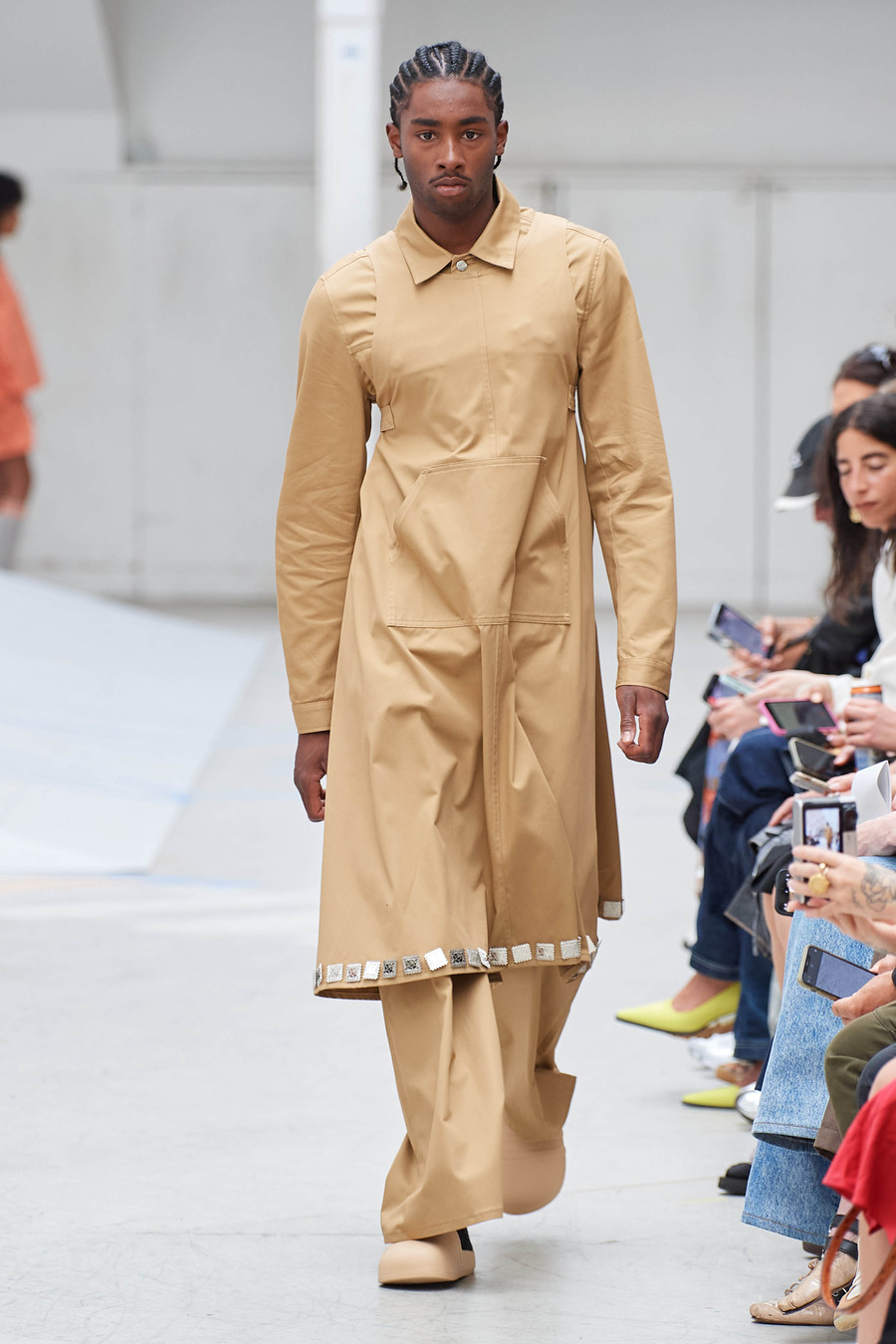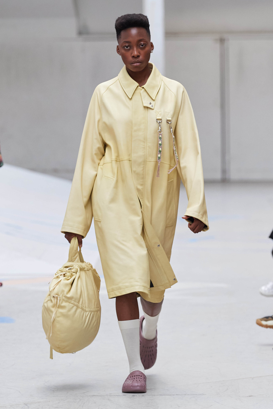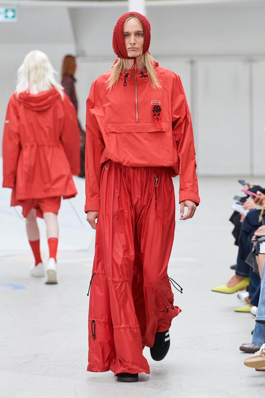 Rolf Ekroth’s reverence for the hardworking countryside people of past generations shines through the elongated silhouettes of utilitarian aprons and workwear dresses. Notably, the collection reimagines friendship bracelets as miniature alpha-woven pendants, adorning the garments and honouring traditional Nordic handicrafts. The collection becomes a vivid tapestry of imagined nostalgic moments, skillfully balancing realism and romance.